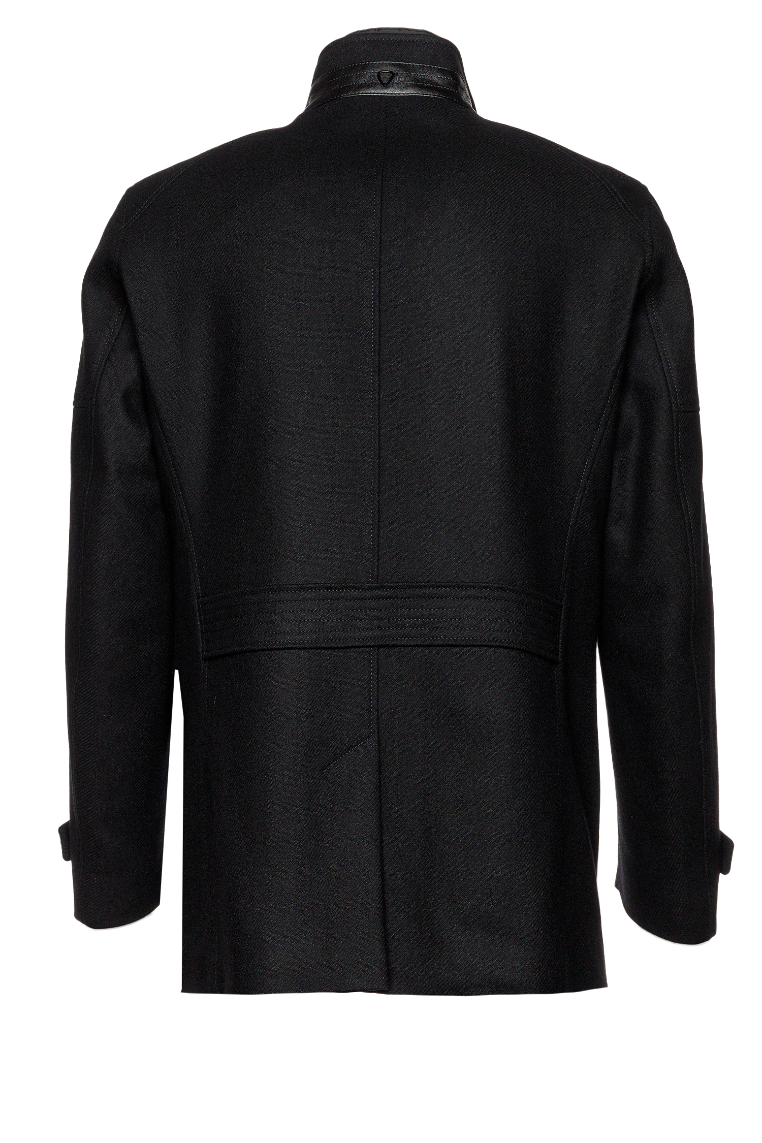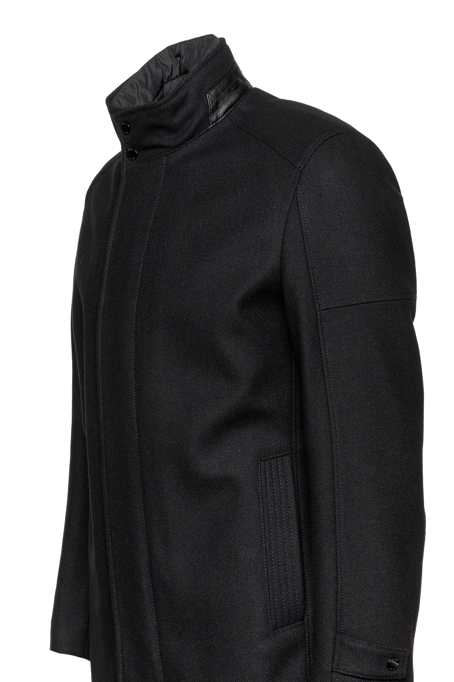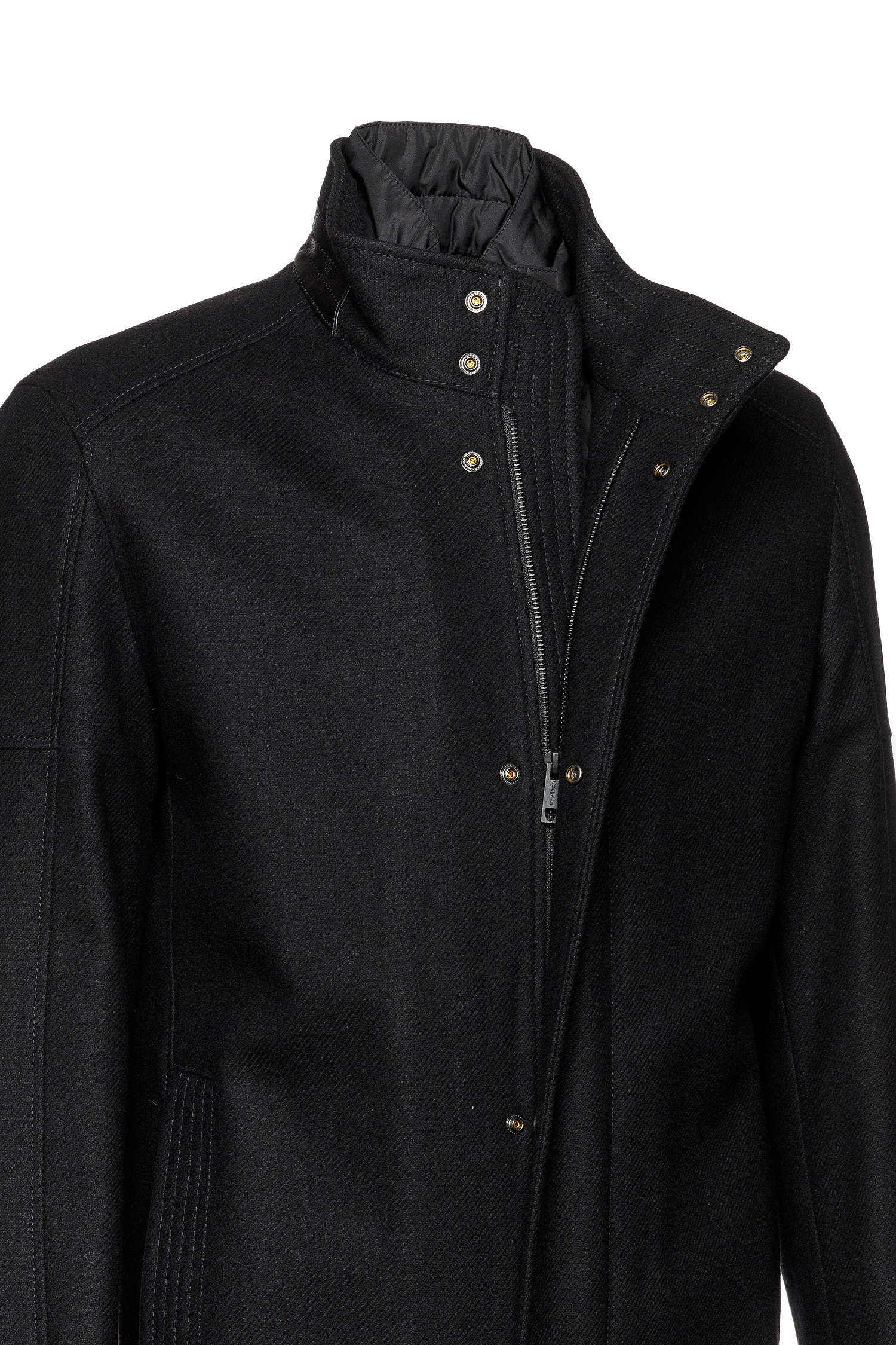 • Hoher Stehkragen mit Druckknopfverschluss und Lederbesatz