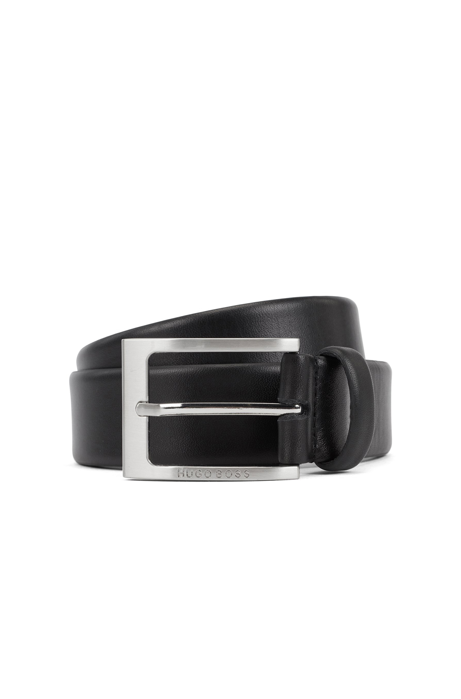 Vielseitig kombinierbarer BOSS Gürtel mit 3,5 Zentimetern Breite. Das zeitlose Herren-Accessoire ist aus edlem Leder gefertigt und mit einer Dornschließe in glänzend polierter Silber-Optik versehen. Eine Logo-Gravur verleiht dem eleganten Style charakteristischen Stil.