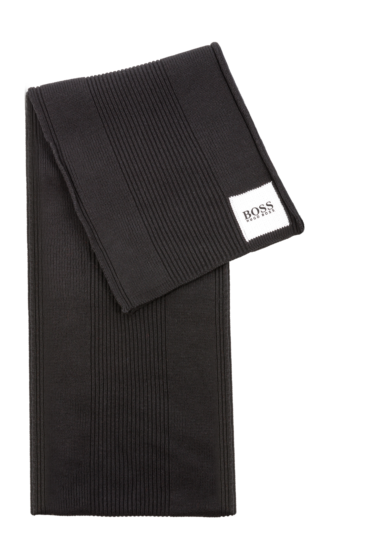 BOSS Schal aus einem soften Baumwoll-Mix mit Woll-Anteil. Das zeitgemäße Herren-Accessoire ist teilweise gerippt und besitzt einen kontrastfarbenen Patch mit gummiertem Logo.