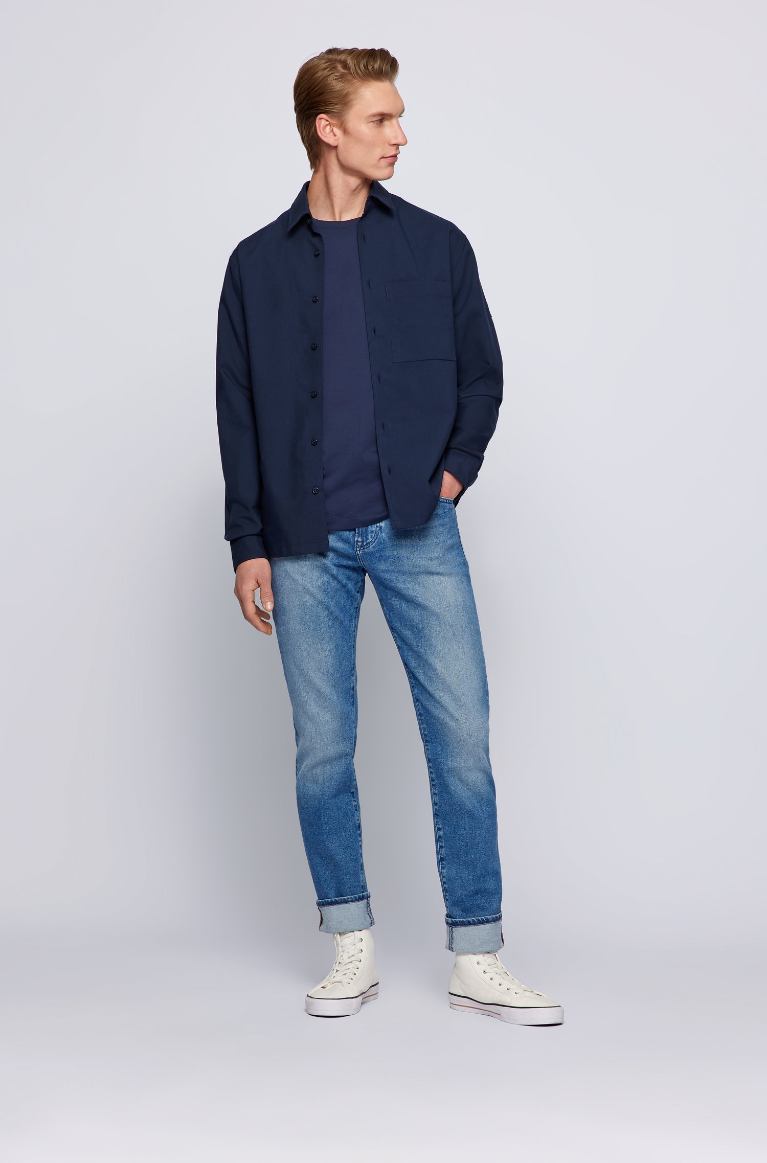 Legere BOSS Jeans mit gerader Passform. Die Herren-Hose mit mittlerer Bundhöhe ist aus komfortablem Stretch-Denim gefertigt, der sich durch einen blauen Farbton und dezente Used-Effekte auszeichnet. Charakteristische Details runden das Design ab. Für unsere RESPONSIBLE Produkte verwenden wir immer mindestens 60 % nachhaltigere Rohmaterialien. Dieses Kleidungsstück ist zu mindestens 60 % aus zertifizierter Bio-Baumwolle gefertigt. Bio-Baumwolle wird nur mit natürlich vorkommenden Substanzen und ohne gentechnisch verändertes Saatgut angebaut. In der biologischen Landwirtschaft werden zur Schädlings- und Krankheitsbekämpfung anstelle von Chemikalien natürliche Maßnahmen, wie Wechselwirtschaft und Kompostieren, eingesetzt. Das Kleidungsstück besteht zum Teil aus zertifiziertem recyceltem Polyester. Recycelter Polyester ist eine Kunstfaser aus ölbasierten Abfällen wie alten PET-Flaschen. Es handelt sich dabei um eine nachhaltigere Option als bei herkömmlichem Polyester, da ein bereits produziertes Material erneut zum Einsatz kommt. Die Verwendung von recyceltem Polyester reduziert darüber hinaus Kunststoffabfälle und verhindert, dass diese auf Deponien enden. Wir verwenden nur Rohstoffe aus einer nachverfolgbaren Produktkette, um sicherzustellen, dass es sich um zertifizierten recycelten Polyester handelt.