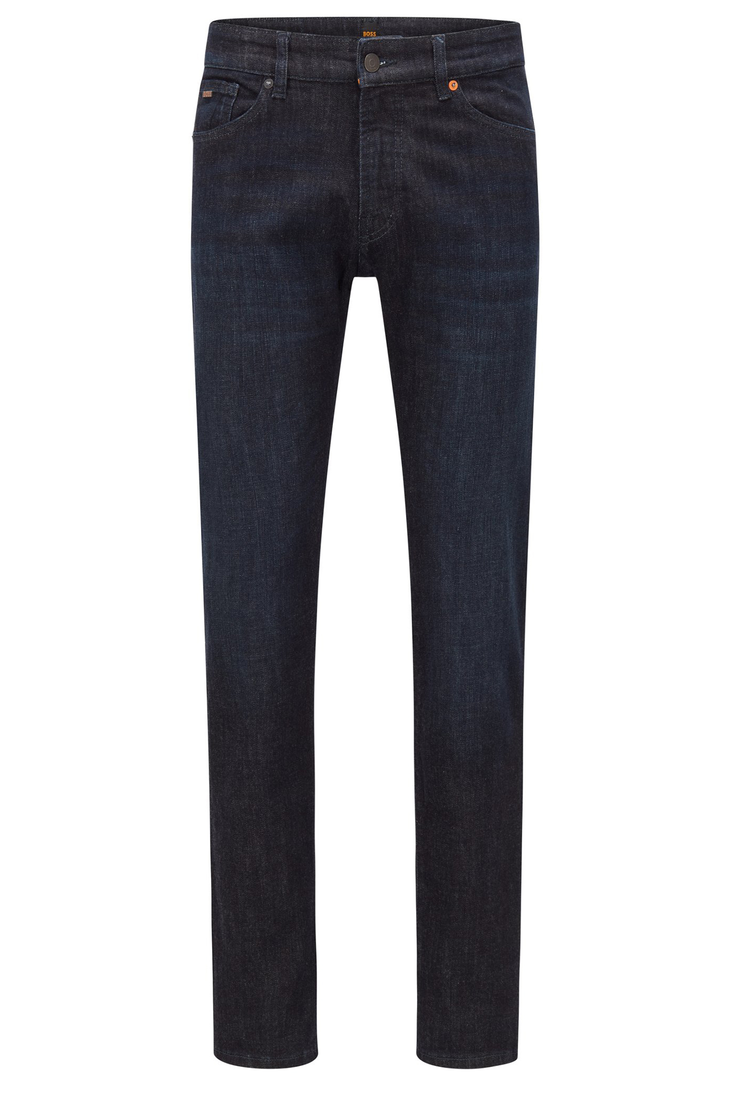 Bequeme BOSS Jeans in einem mittelblauen Farbton. Diese gerade geschnittene Mid-Rise-Jeans für Herren aus baumwollreichem Super-Stretch-Denim, welche für Flexibilität und Formbeständigkeit sorgt, ist mit Abnutzungseffekte behandelt, um ihr einen authentischen Charakter zu verleihen. Der Logo-Aufnäher ziert den hinteren Bund und sorgt für ein besonderes Finish.