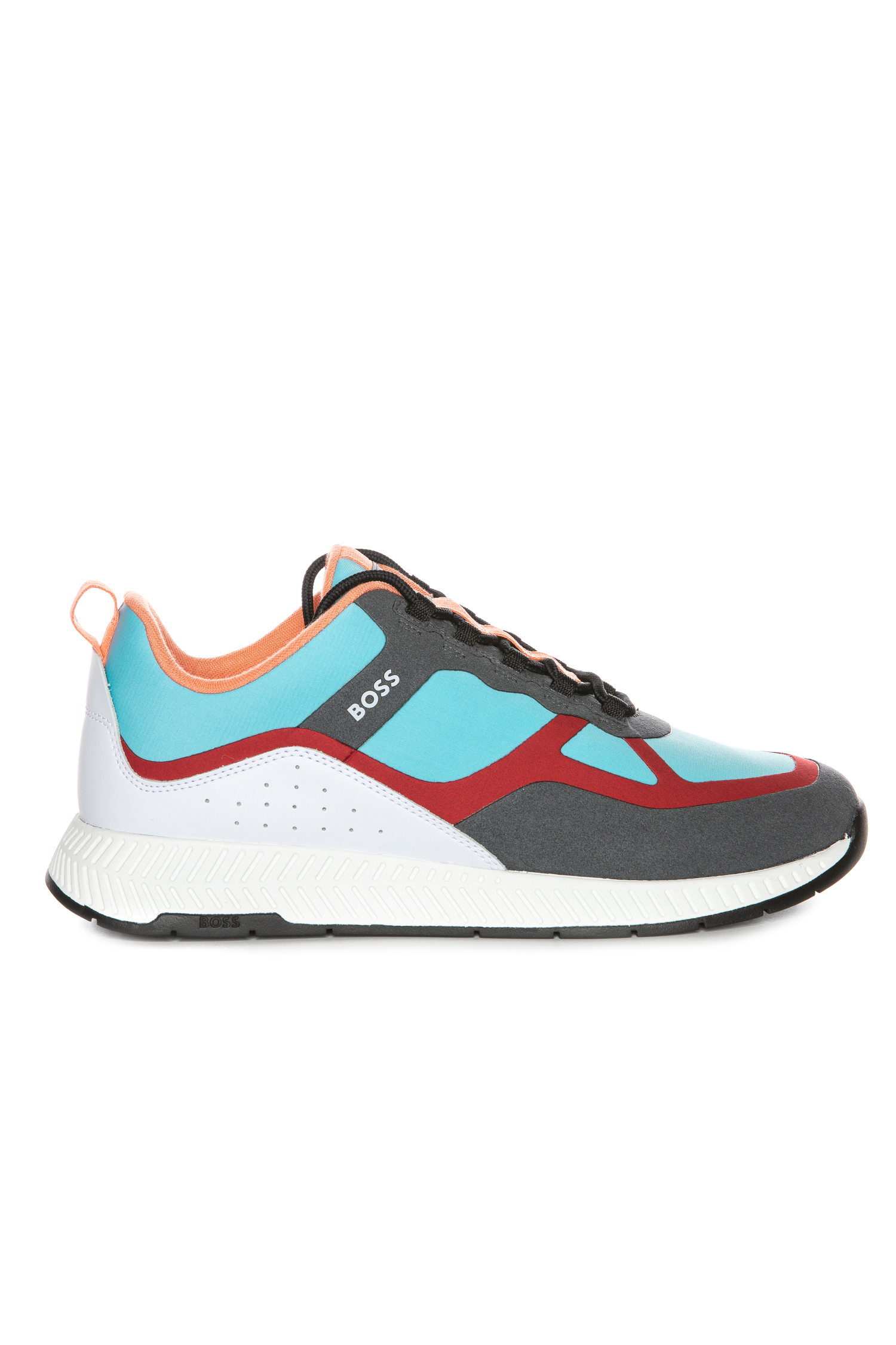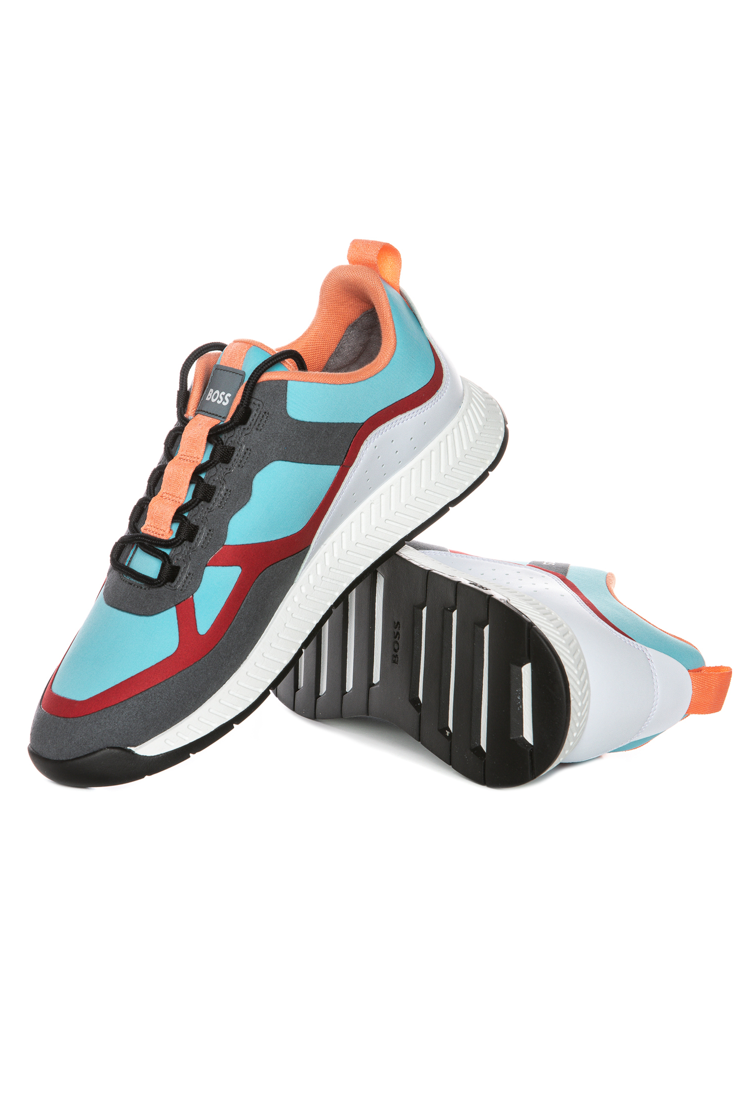 Markante BOSS Sneakers im Laufschuhstil. Die Herren-Schuhe mit EVA-Zwischensohle und Gummiunterseite sind aus verschiedenen Materialien wie gebondetem Leder und Stretch-Gewebe gefertigt. Logo-Akzente und kontrastfarbene Details verleihen dem Paar den letzten Schliff.
