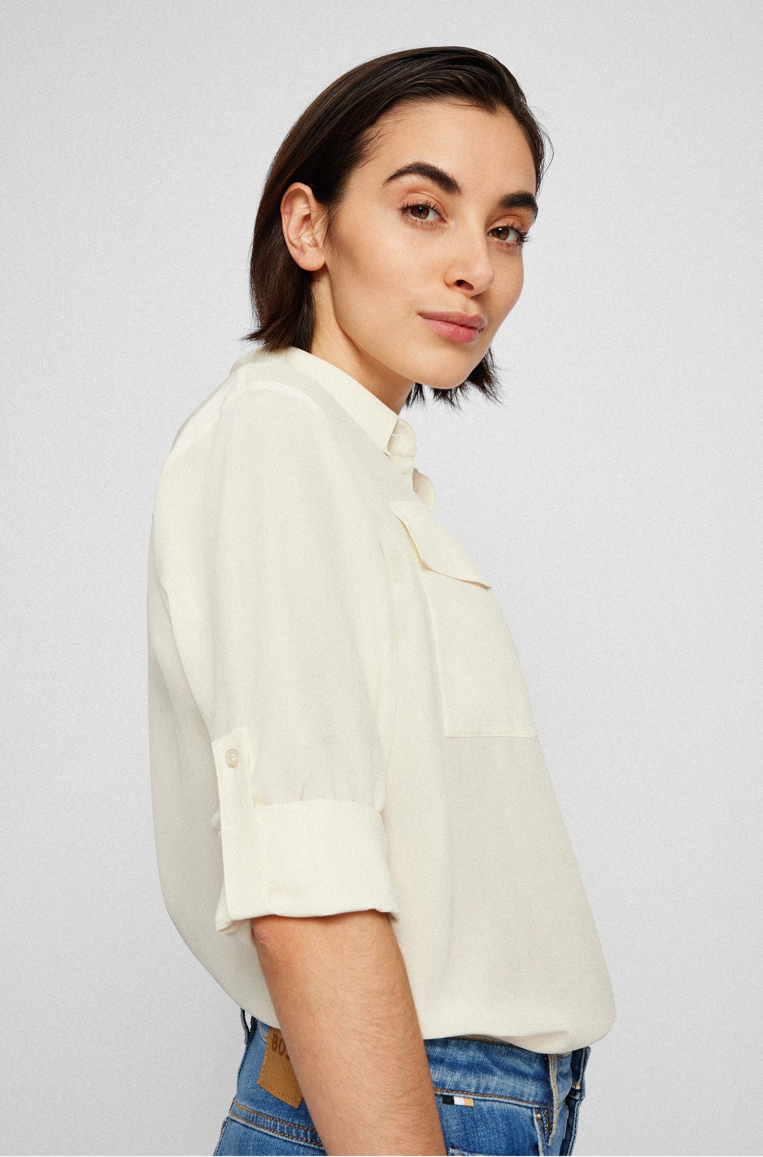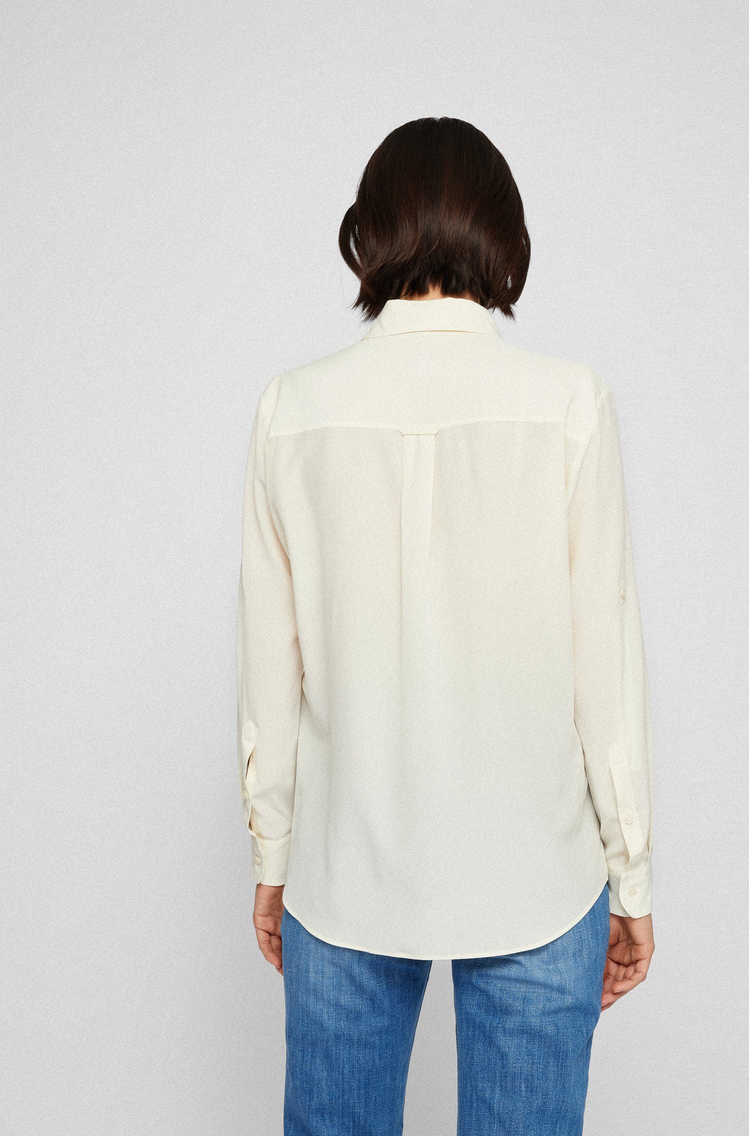 Elegante BOSS Bluse mit gerader Passform. Das vielseitig kombinierbare Damen-Essential ist aus sandgewaschener Seide mit dezenter Struktur gefertigt. Zwei Brusttaschen und praktische Ärmel zum Hochkrempeln runden das Design ab. In Kombination mit einem Lederrock entsteht ein feminines Ensemble.