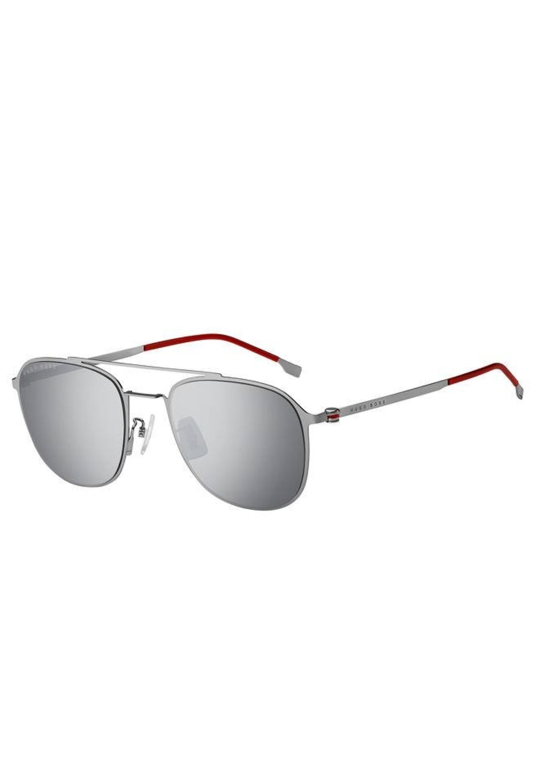 Elegante BOSS Sonnenbrille mit Acetat-Enden. Die zeitgemäße Herren-Sonnenbrille wird präzise in Italien gefertigt und überzeugt mit einer breiten Fassung, verspiegelten Gläsern und Aussparungen an den Bügeln. BOSS Logos und ein Doppelsteg runden den Style ab.