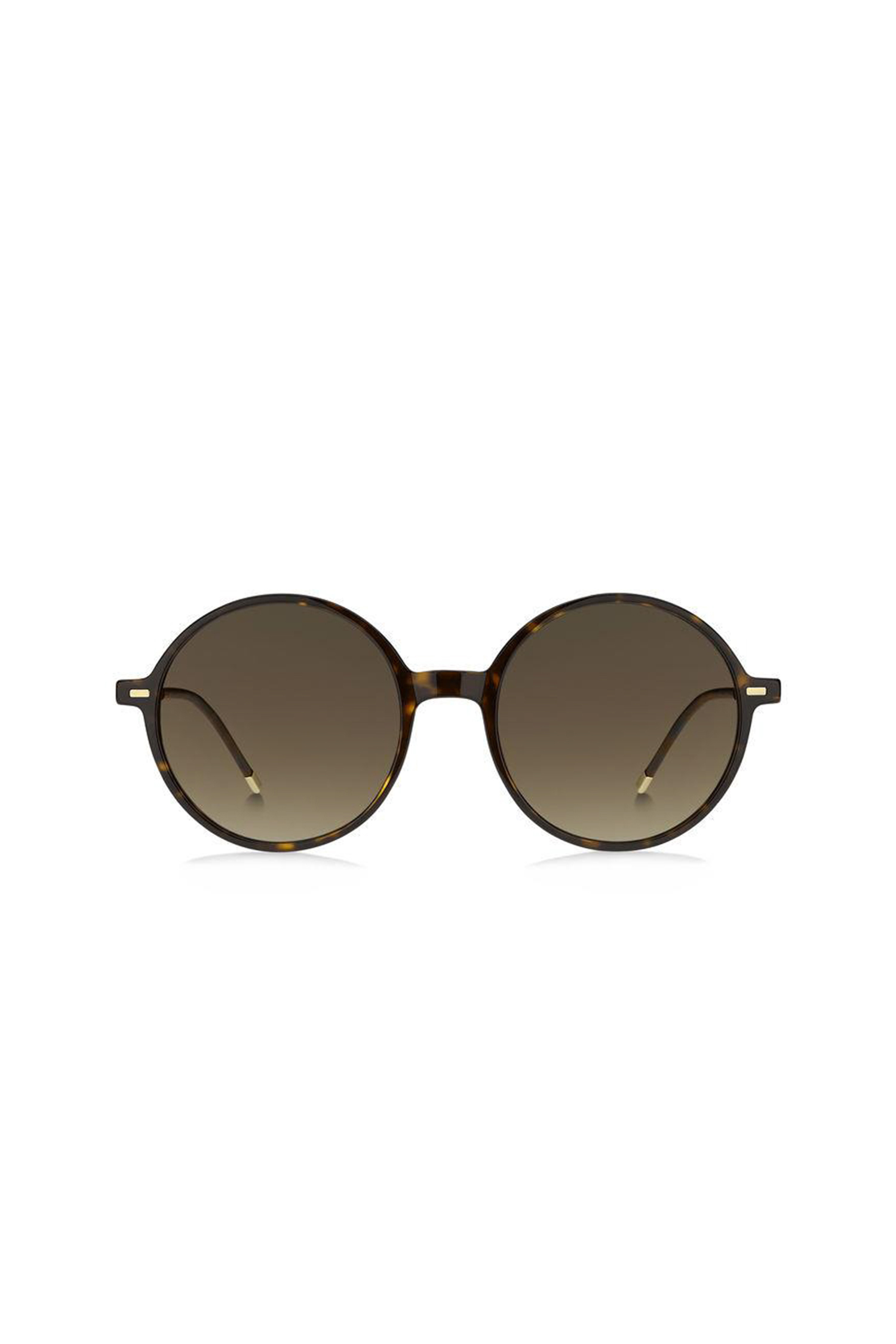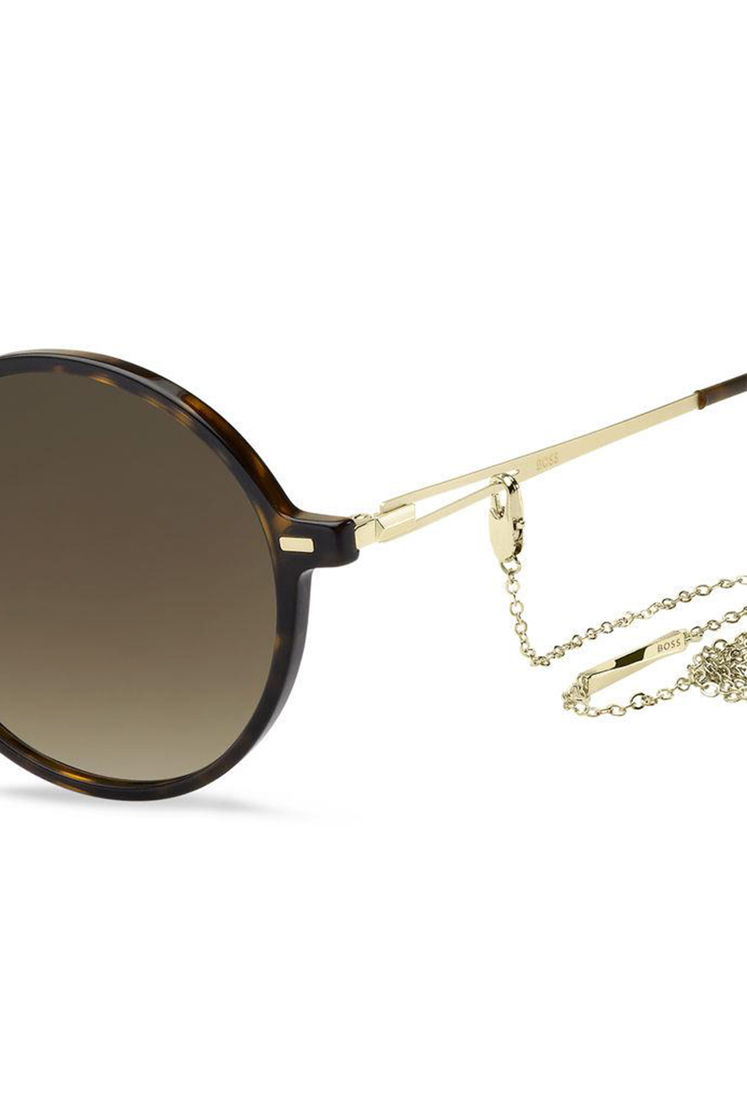 Elegante BOSS Sonnenbrille. Die Damen-Sonnenbrille ist mit einer runden Fassung aus Acetat und einer metallenen Kette mit Logo-Besatz versehen. Geteilte Bügel mit gelasertem Logo und charakteristischen Metalldetails runden das Design ab. Ein thermoelastischer Überzug sorgt für hohen Tragekomfort.