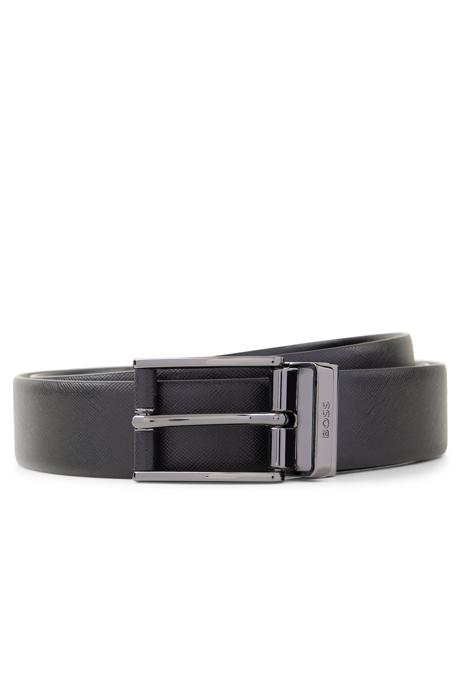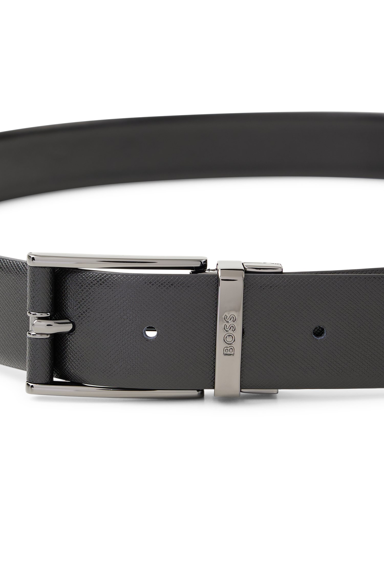 Zeitloser BOSS Wendegürtel, der in Italien gefertigt wird. Das 3,5 Zentimeter breite Herren-Accessoire aus italienischem Leder ist mit einer Dornschließe aus poliertem Metall mit Logo-Gravur versehen. Auf der einen Seite hat der Style ein glattes Finish, auf der anderen eine geprägte Struktur. Für unsere RESPONSIBLE Produkte verwenden wir immer mindestens 60 % nachhaltigere Rohmaterialien. Mindestens 60 % des Leders für dieses Produkt stammen aus zertifizierten Gerbereien, die mit umweltschonenden Methoden arbeiten, um die Auswirkungen auf den Planeten zu reduzieren. Mit dem Kauf dieses Produkts unterstützt du die nachhaltigere Lederherstellung durch die Leather Working Group (LWG). Wir verwenden nur Leder, das als Nebenprodukt in der Lebensmittelbranche anfällt.