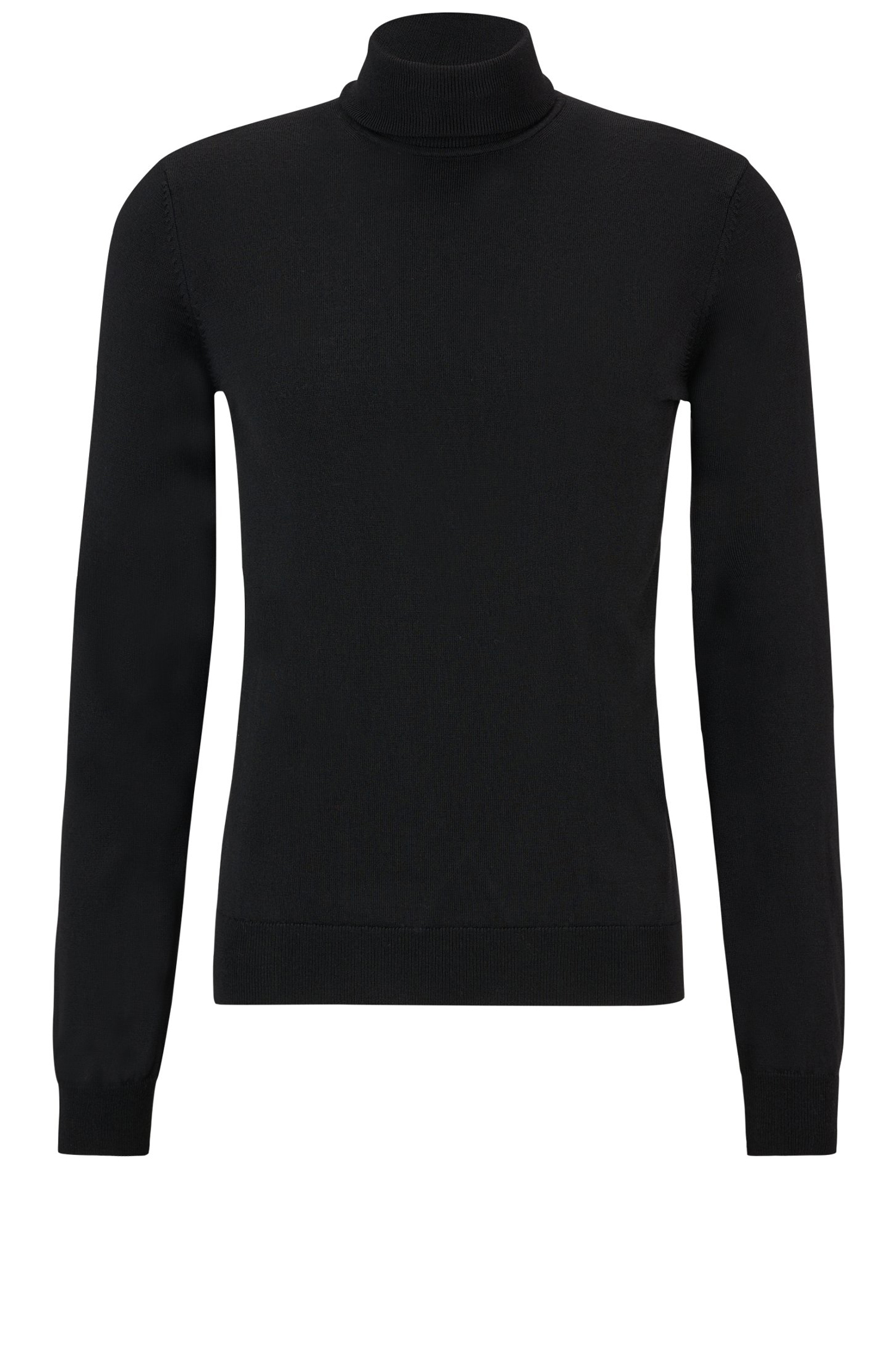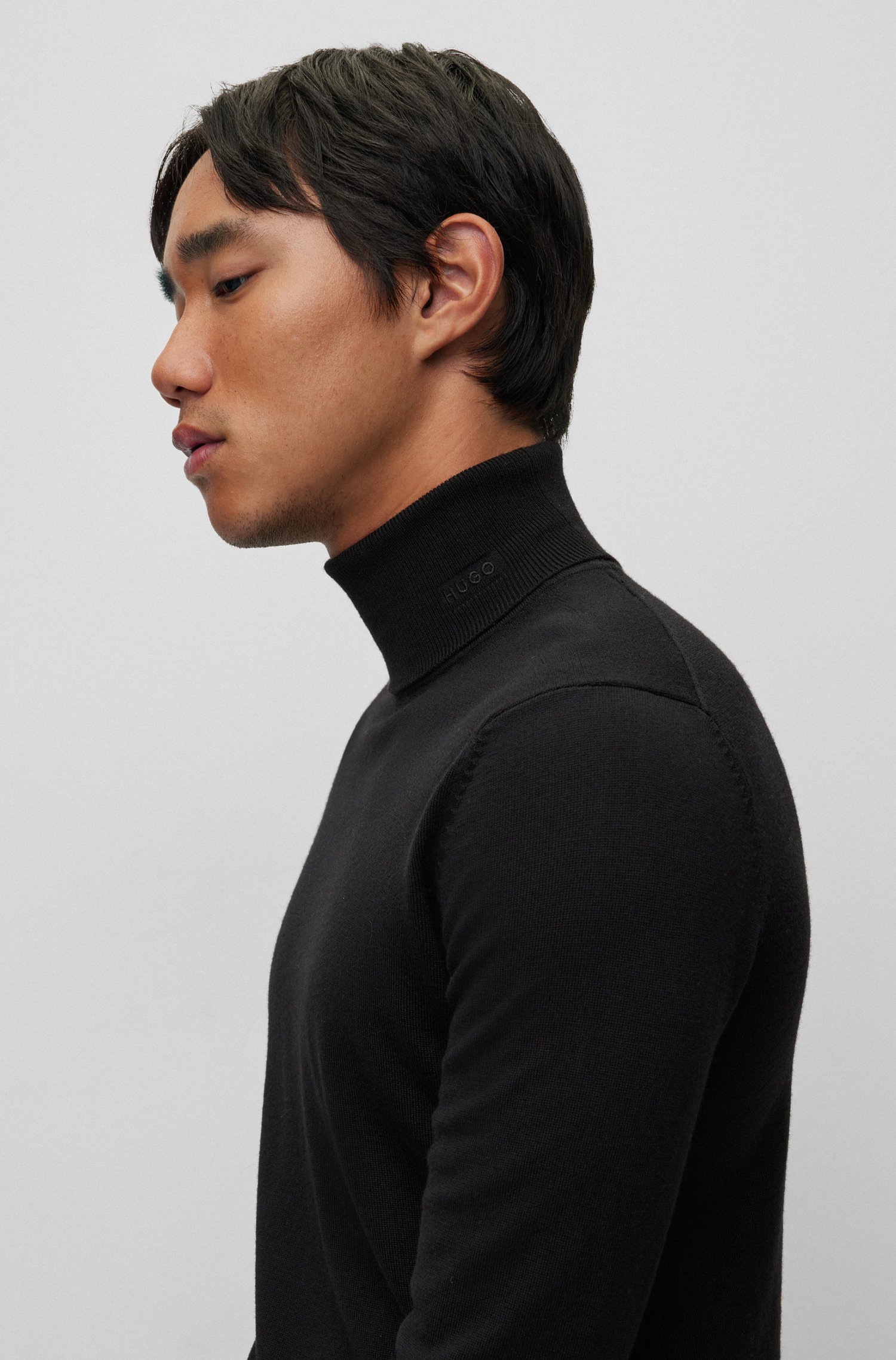 HUGO Rollkragenpullover. Der maskuline Herren-Pullover mit schmaler Passform ist aus besonders feiner Schurwolle gestrickt, die die Temperatur reguliert und optimalen Tragekomfort verspricht. Eine HUGO Logo-Stickerei setzt ein dezentes Branding.
