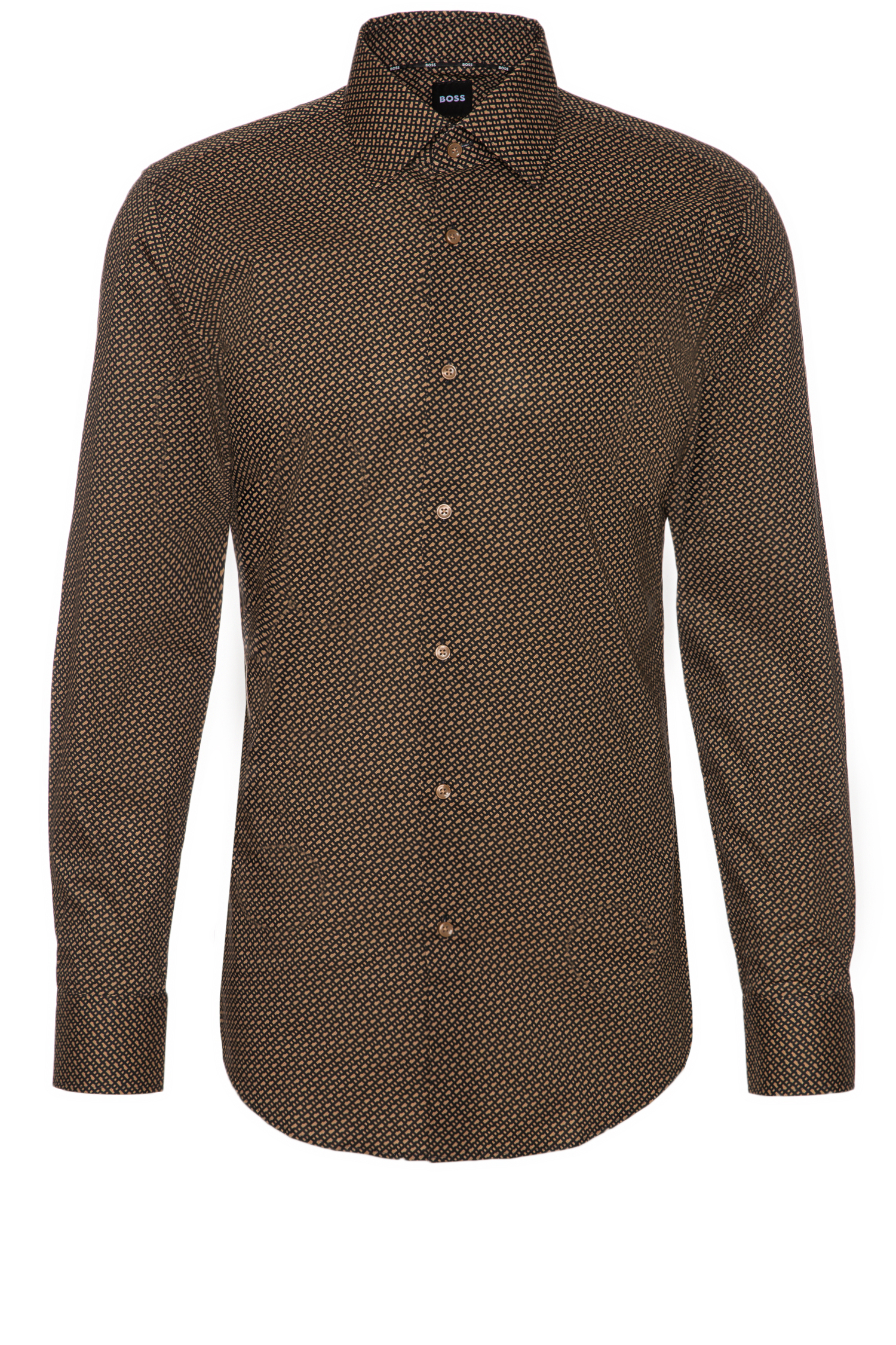 Zeitgemäßes BOSS Business-Hemd. Das Herren-Hemd aus softer Baumwoll-Popeline mit Elasthan-Anteil verspricht optimale Bewegungsfreiheit und ist durchgehend mit einem zeitgemäßen Monogramm-Print bedruckt. Dank der schmalen Passform entsteht eine cleane Silhouette.