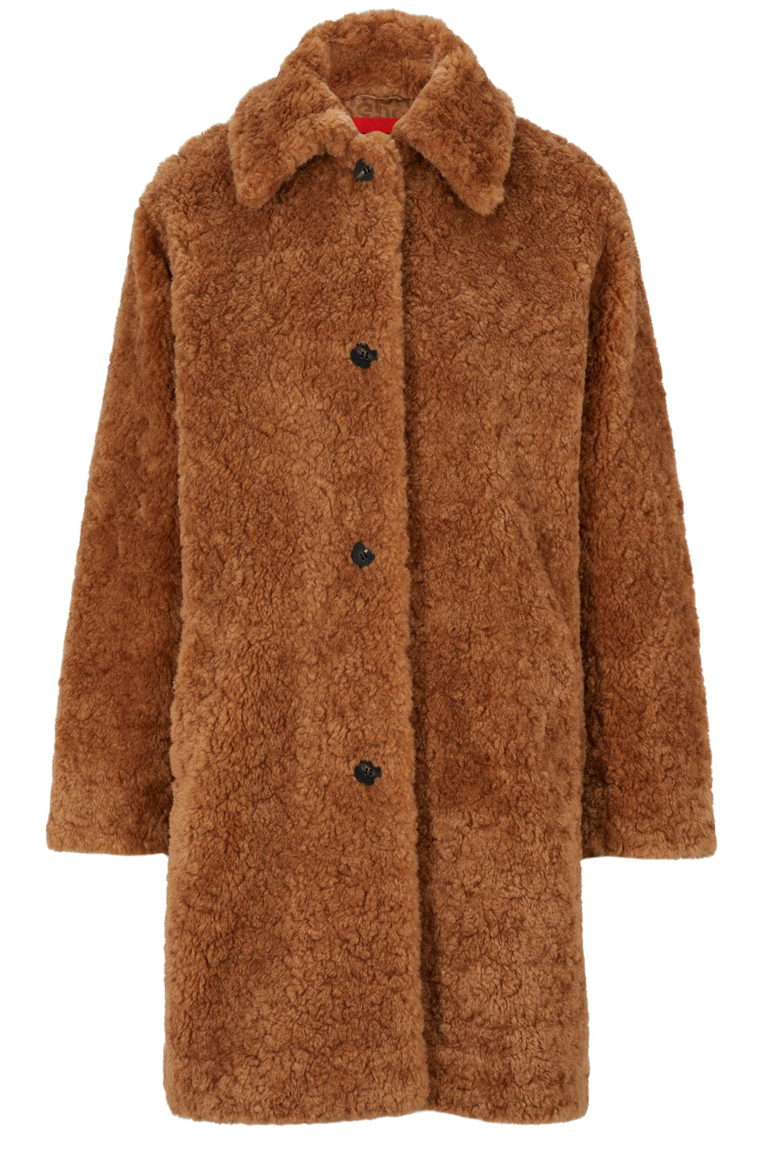 Progressiver HUGO Mantel. Der gerade geschnittene Damen-Mantel aus einem besonders soften Teddy-Gewebe ist mit einem durchgehenden Innenfutter versehen, das sich mit einem glatten Finish und HUGO Stack-Logos präsentiert. Ein Knopfverschluss und ein Spitzkragen runden den Style ab.