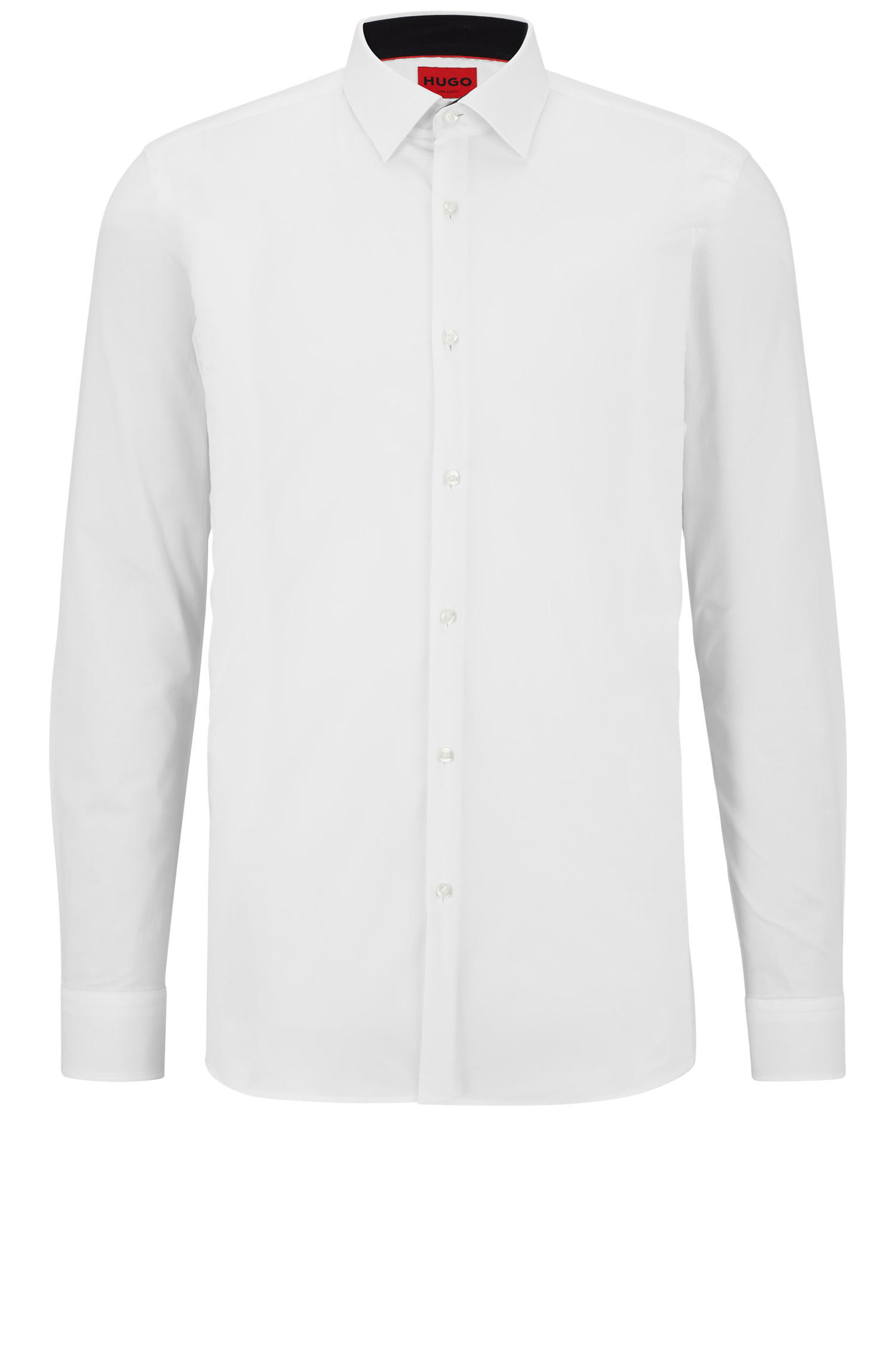 Progressives HUGO Hemd. Das extra schmal geschnittene Herren-Hemd mit cleaner Silhouette ist aus elastischer Baumwoll-Popeline gefertigt, die optimale Bewegungsfreiheit verspricht. Ärmelbündchen, Kragen und die Unterseite der Blende sind in einem kontrastierenden Gewebe gehalten.