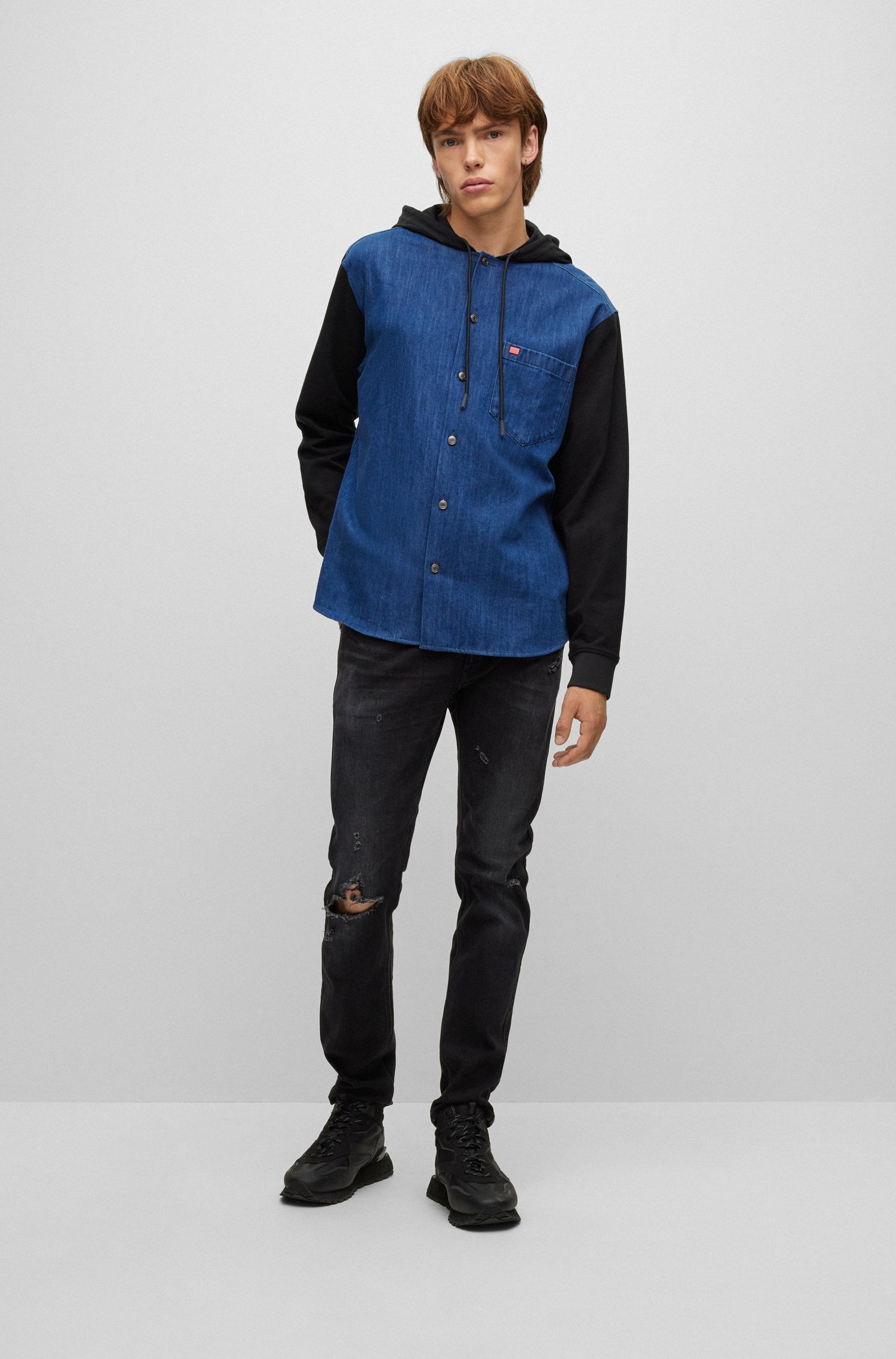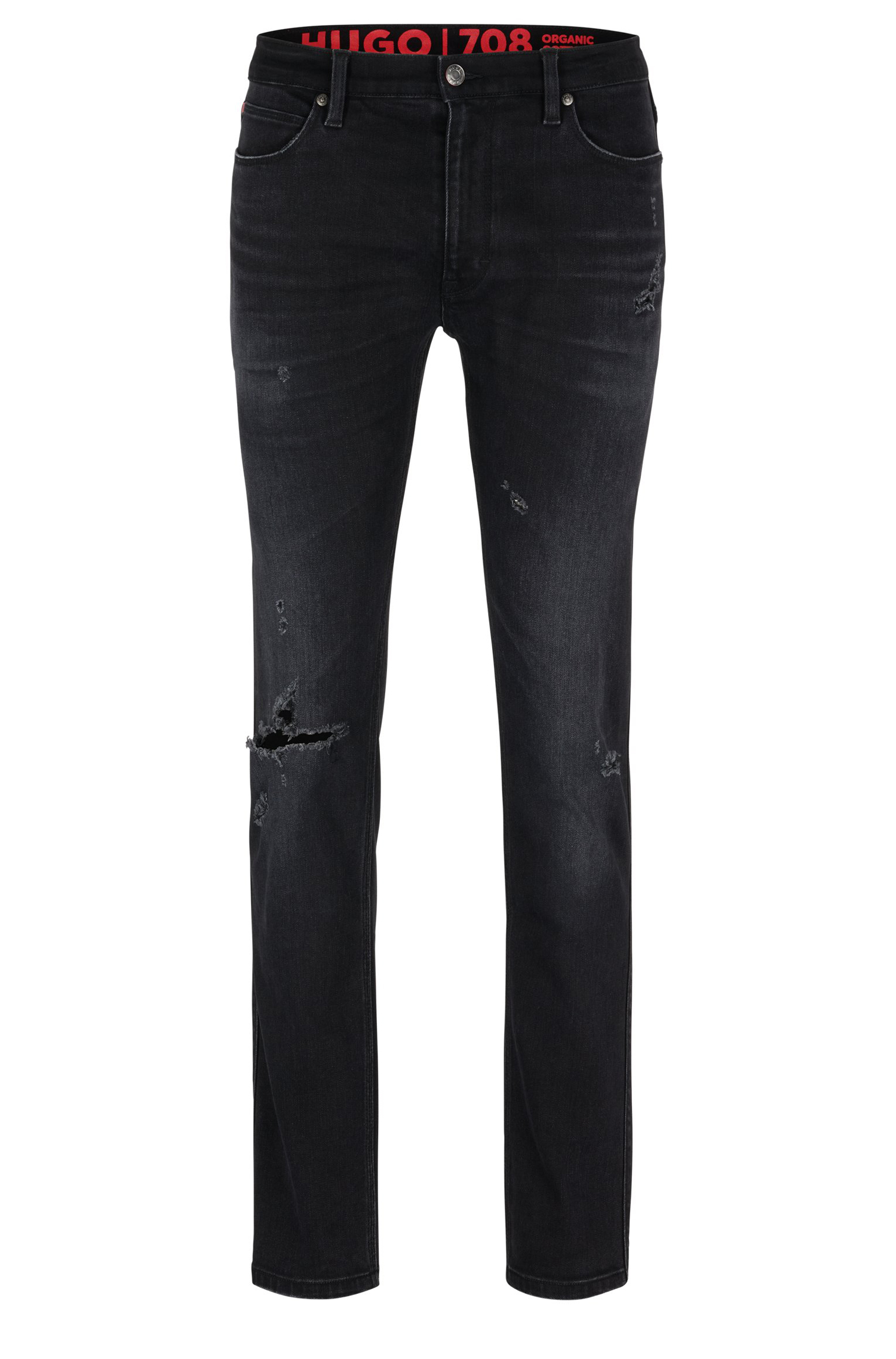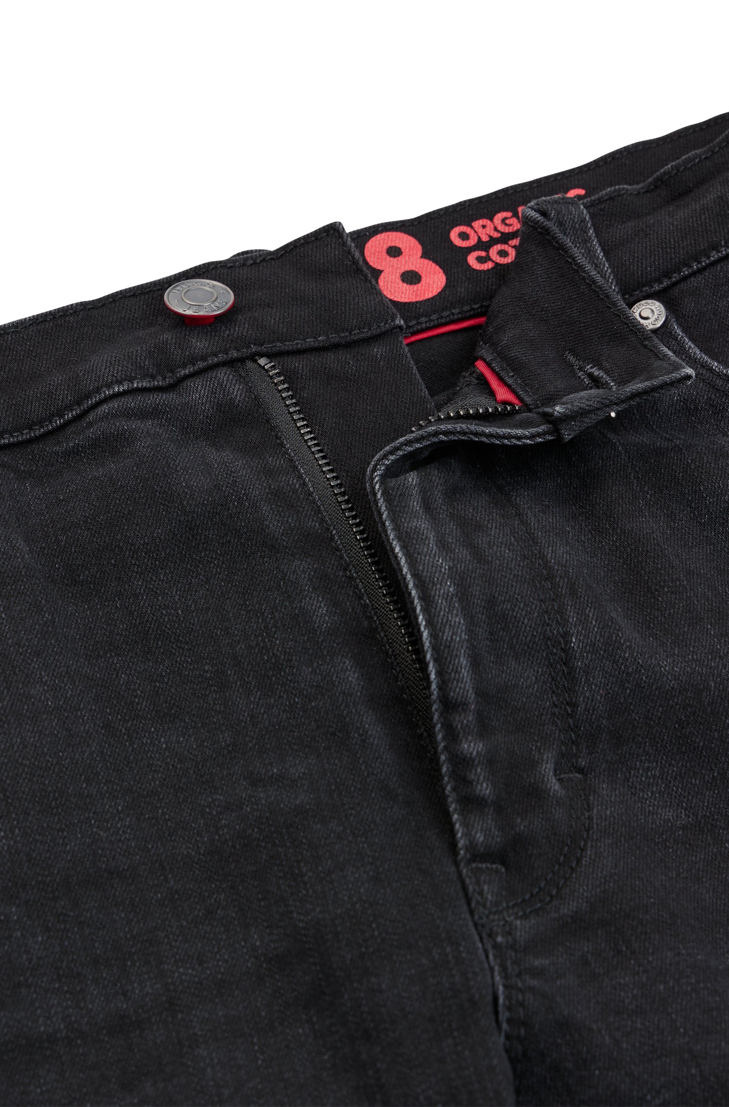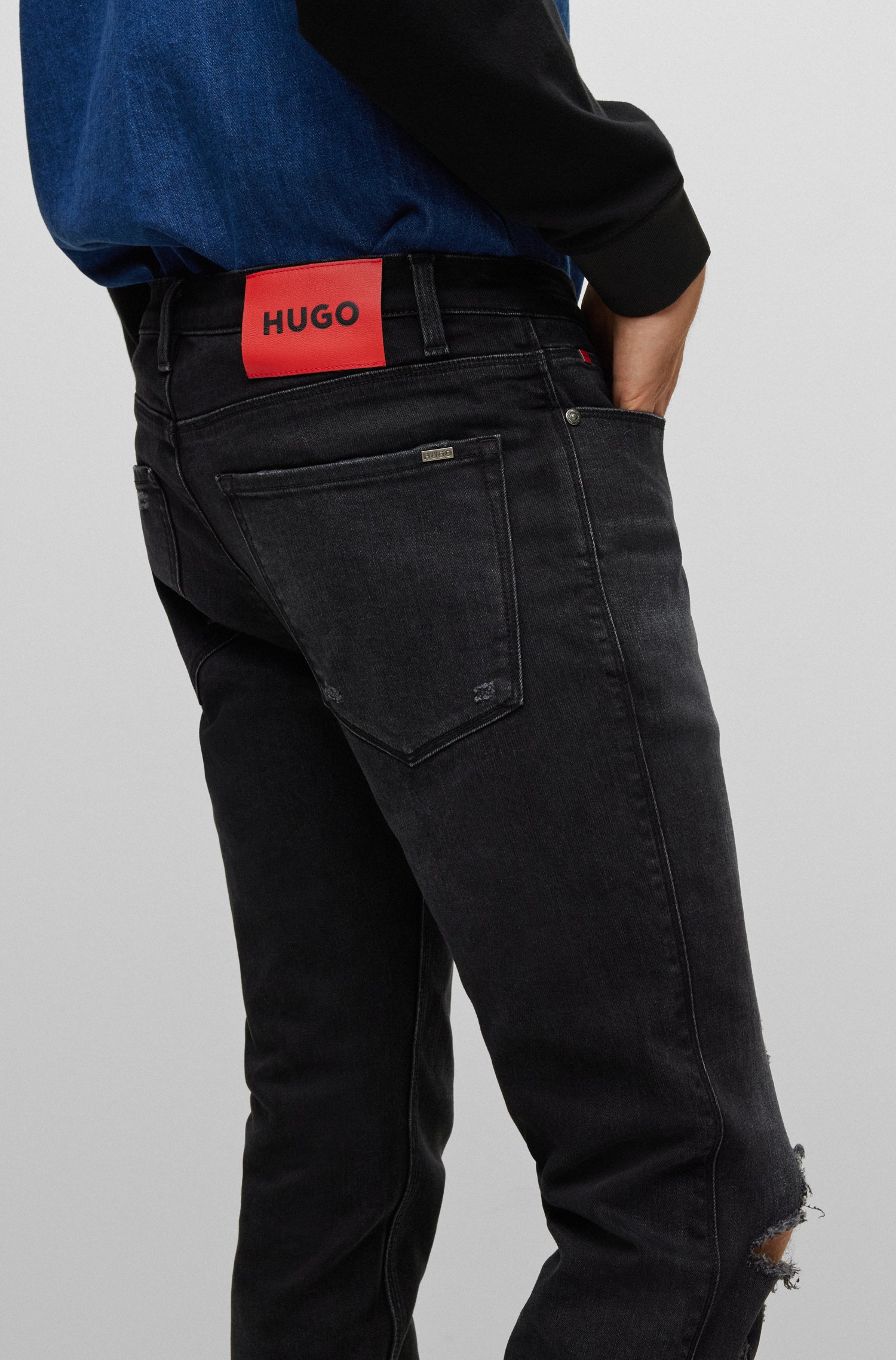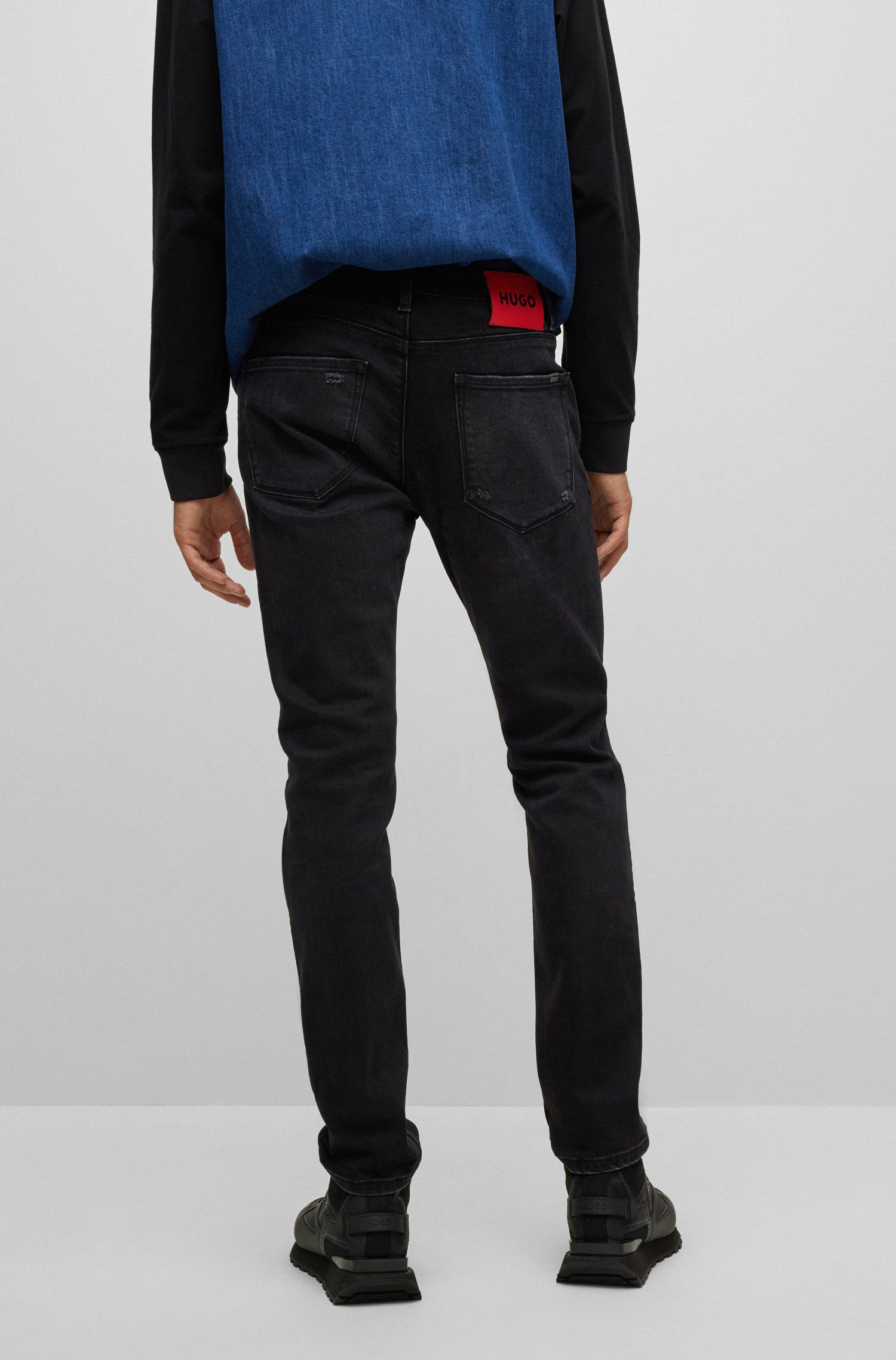Legere HUGO Jeans mit charakteristischen Details in Used-Optik. Die schmal geschnittene Herren-Hose mit mittlerer Bundhöhe und geradem Beinverlauf ist aus komfortablem Stretch-Denim gefertigt und präsentiert sich in einem schwarzen Used-Look.