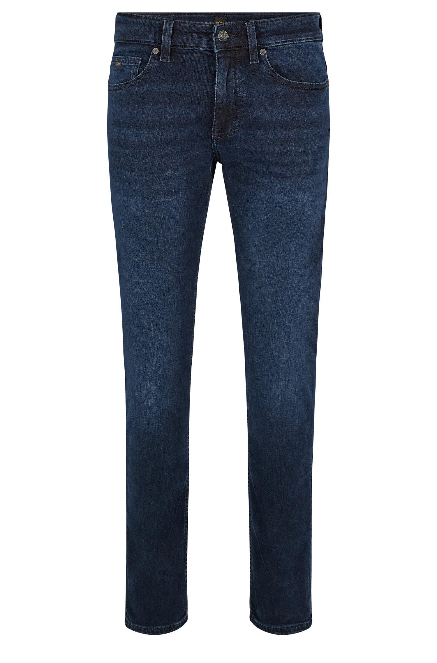 Frische BOSS ORANGE Jeans mit intensiver und origineller Farbgebung. Die schmal geschnittene Herren-Hose mit mittlerer Bundhöhe ist aus bequemem Stretch-Denim gefertigt und verspricht optimale Bewegungsfreiheit. Die blaue Grundfarbe wird mit Schwarz überfärbt und durch Falten-Details und Abnutzungen abgerundet. Charakteristische Elemente, darunter ein Logo-Aufnäher hinten am Bund, verleihen dem Style den letzten Schliff.
