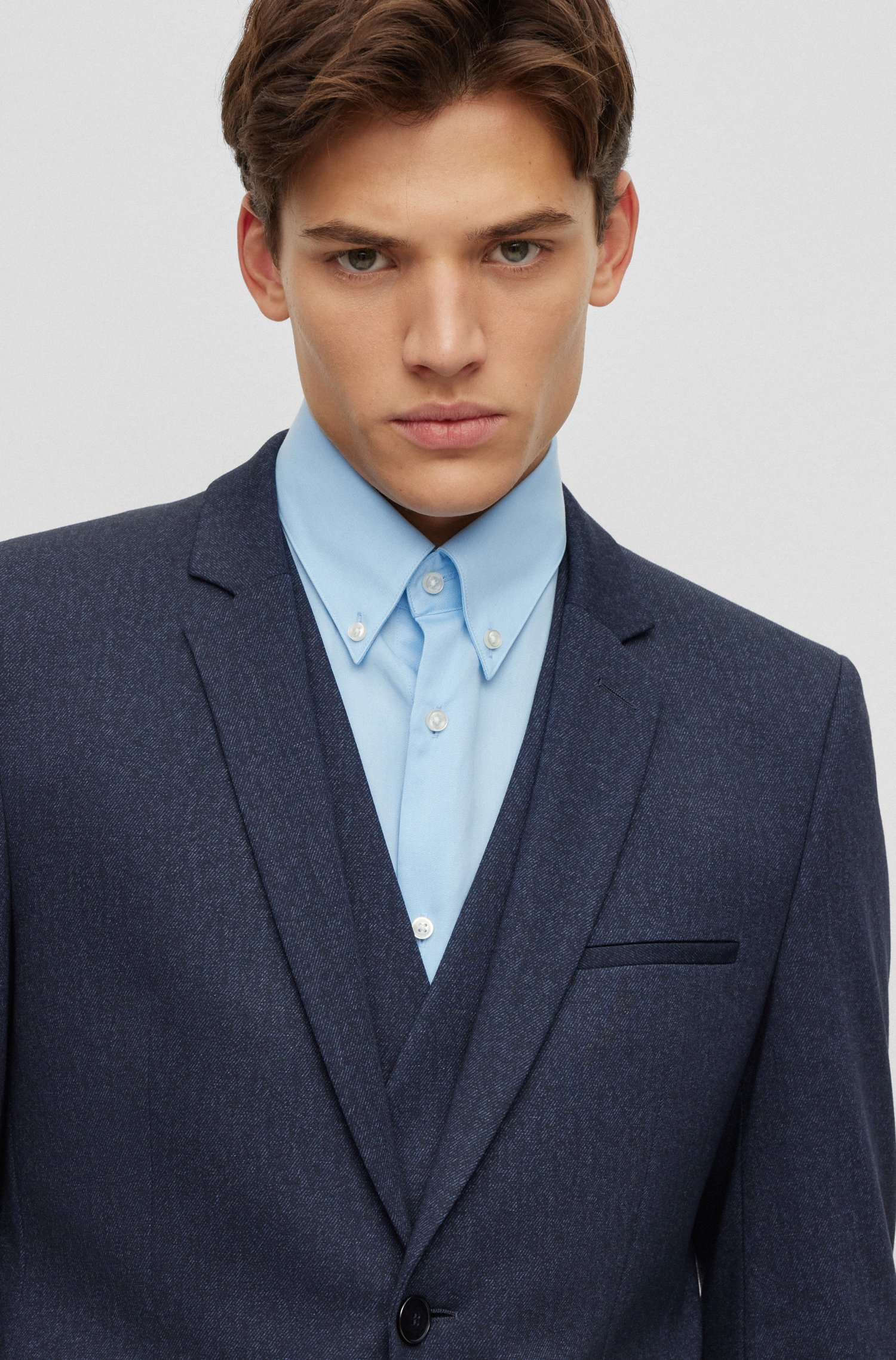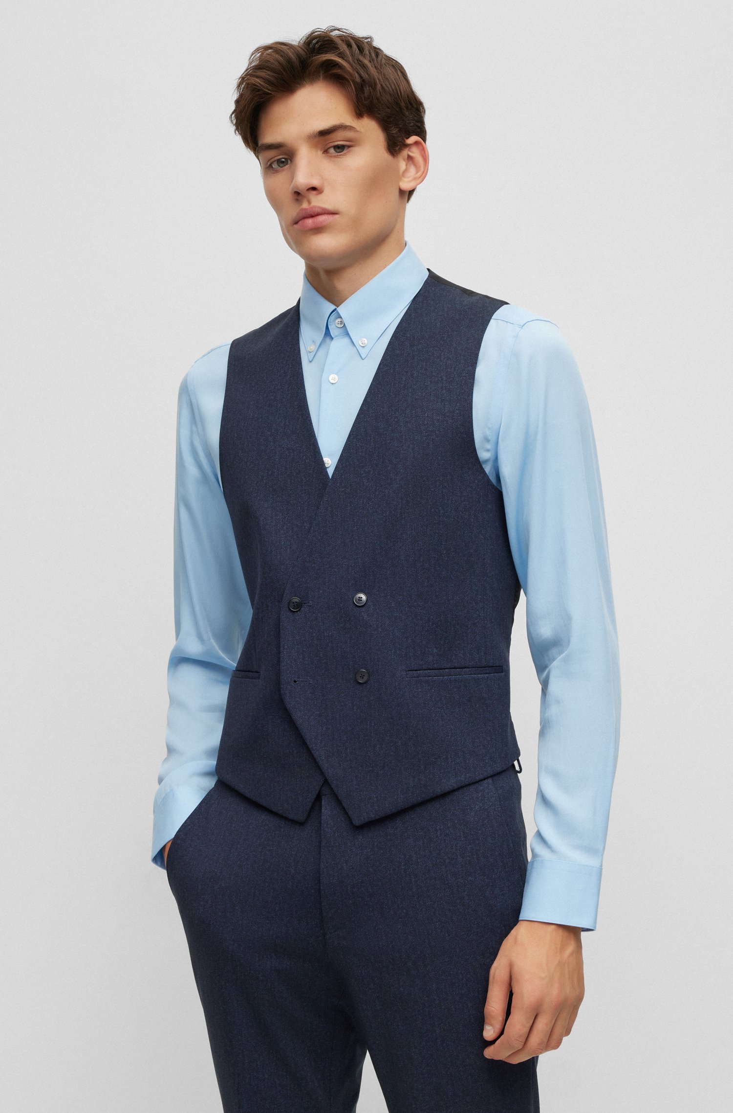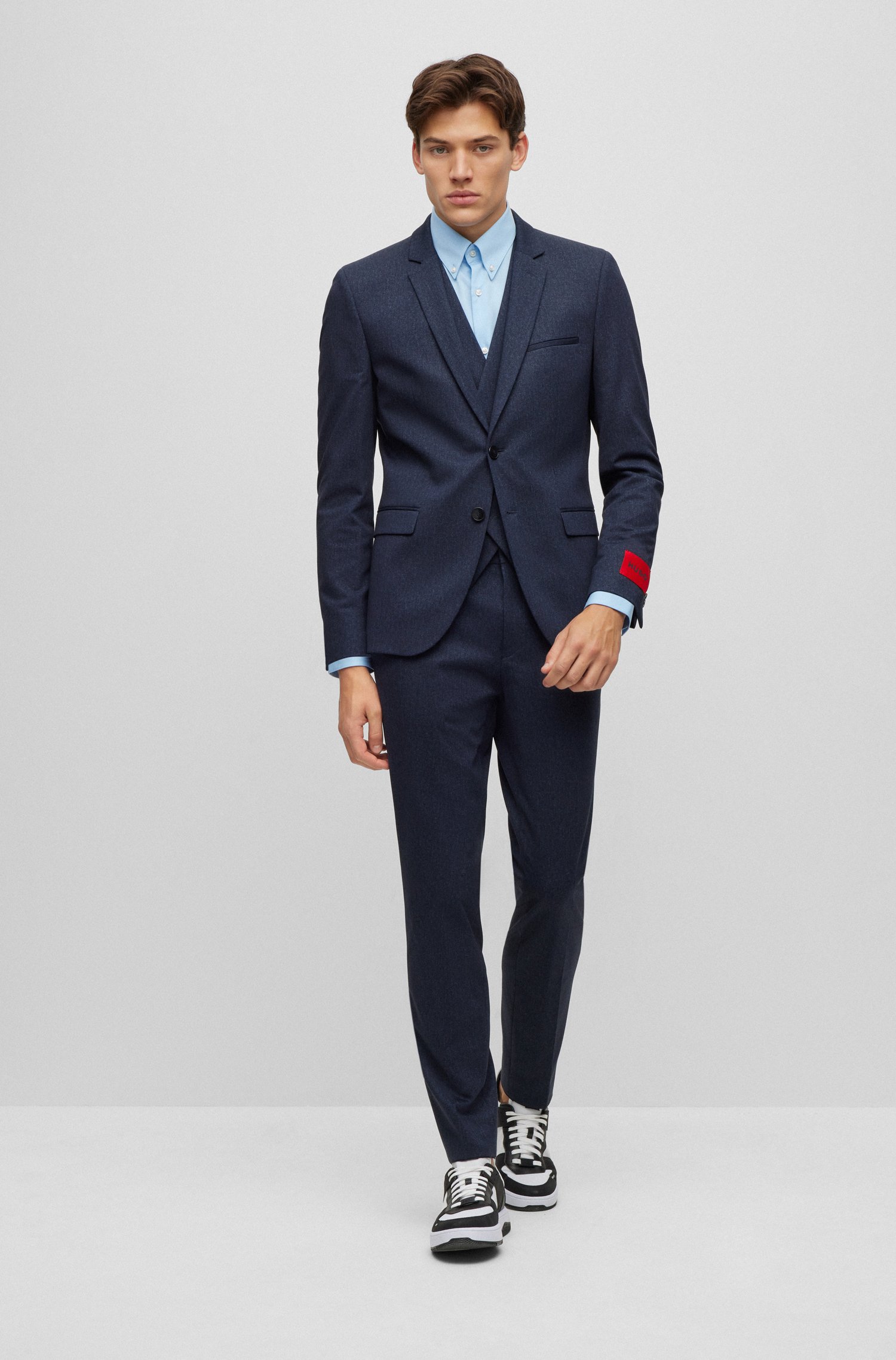 Vielseitig kombinierbarer HUGO Dreiteiler. Der formelle Herren-Anzug mit extra schmaler Passform und zeitgemäßer Silhouette ist aus einem funktionalen Stretch-Gewebe mit Allover-Muster gefertigt. Eine zweireihige Weste setzt einen progressiven Akzent.