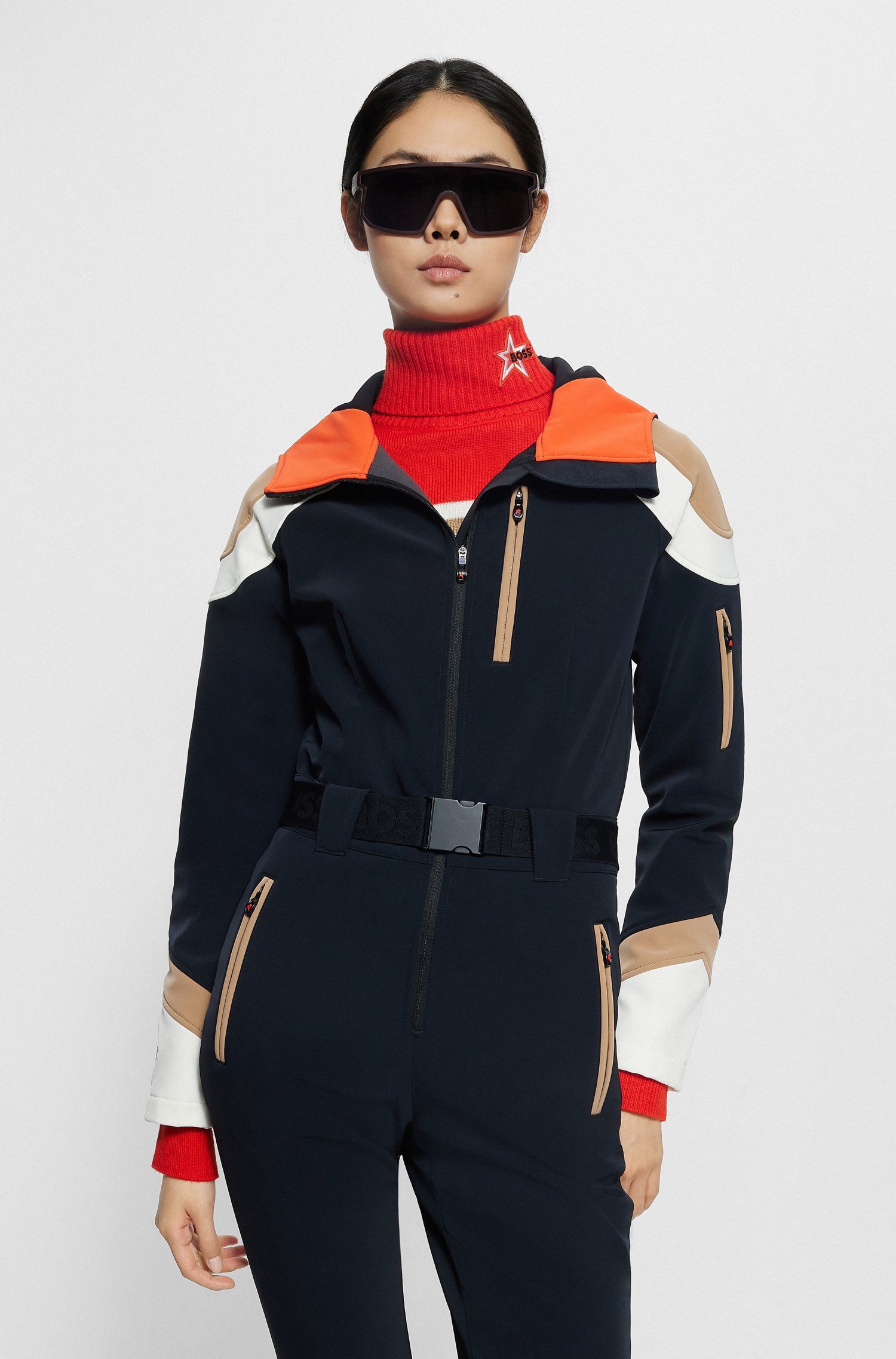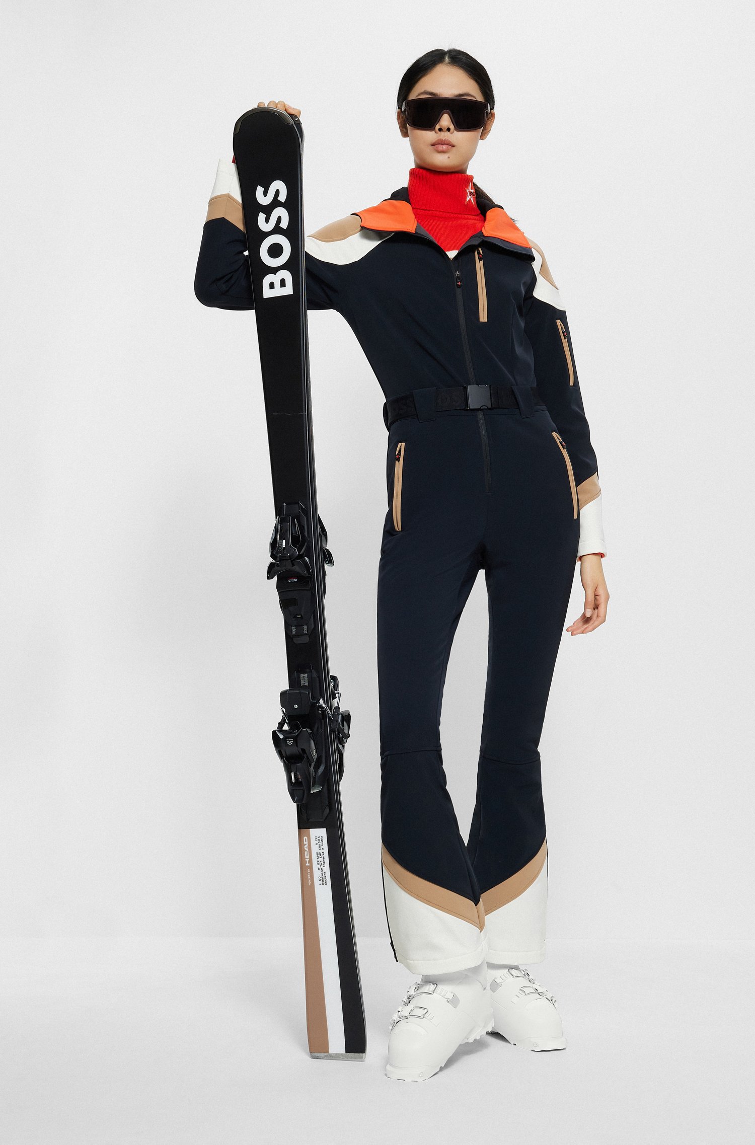 Schnell trocknender, wasserdichter BOSS Skianzug mit helmkompatibler Kapuze, Thermofleece-Innenfutter, Außentasche für den Skipass und Colour-Block-Design. Die BOSS x Perfect Moment Capsule-Kollektion vereint traditionelles Design mit funktionaler Activewear im Retro-Look, damit du nicht nur auf der Piste ein markantes Statement setzt.