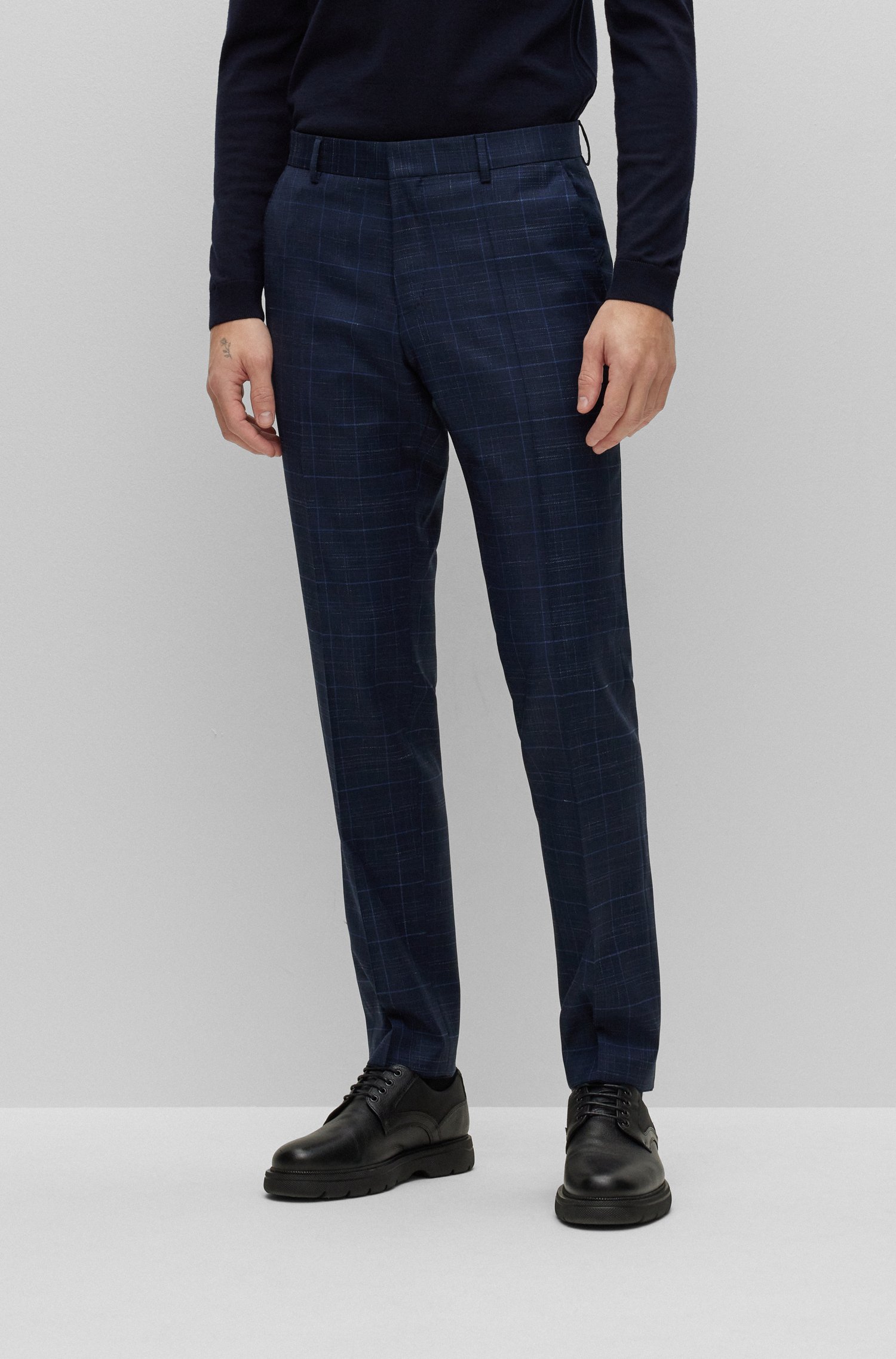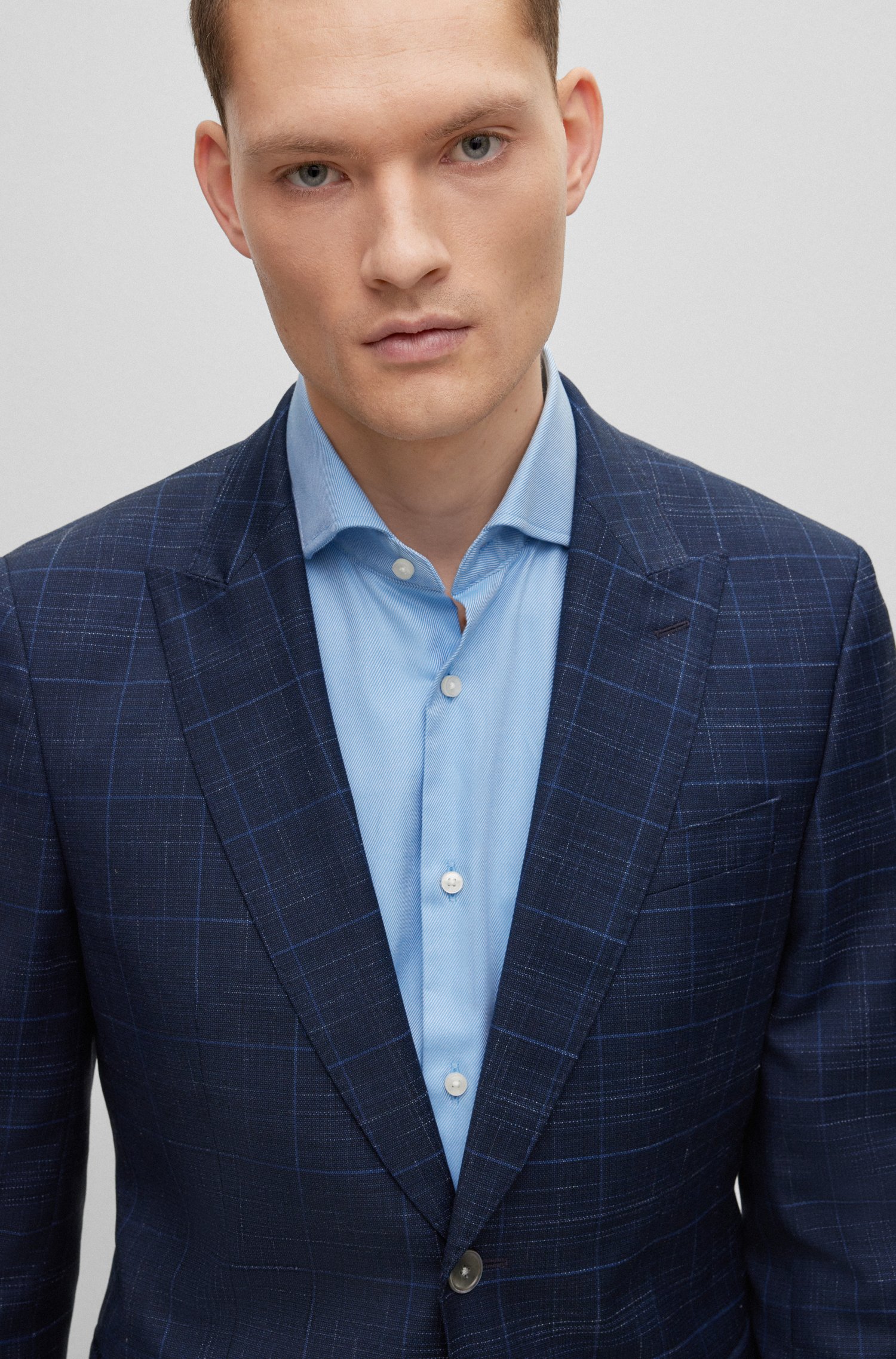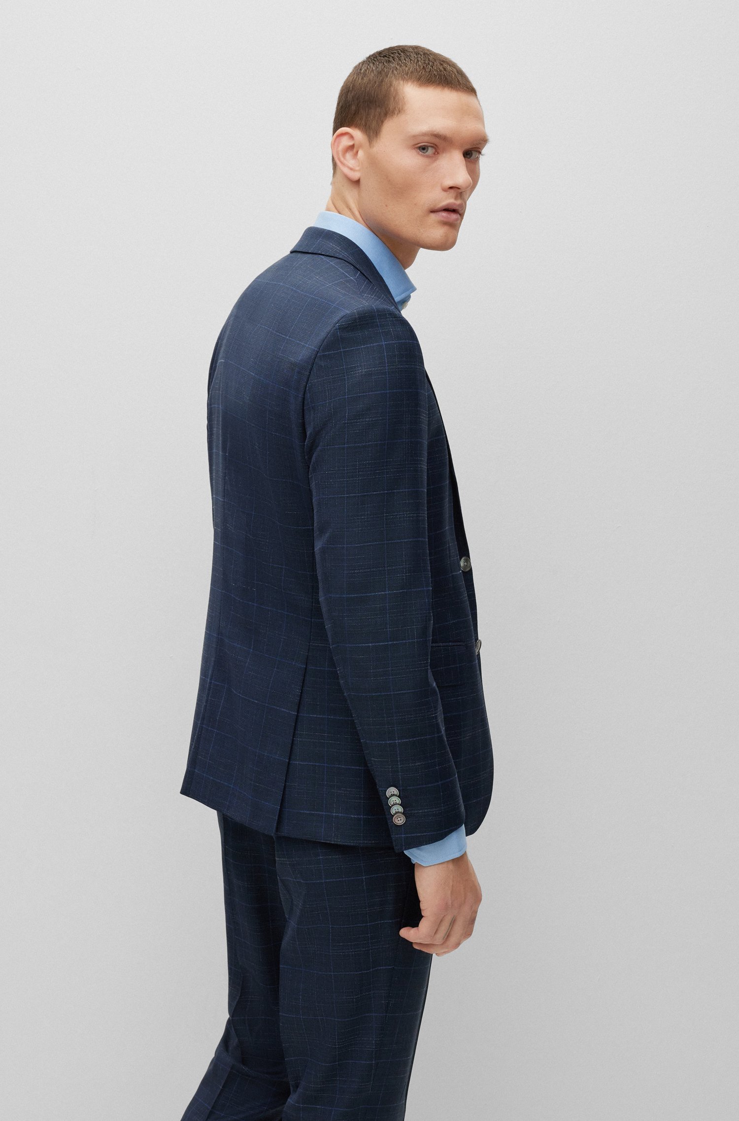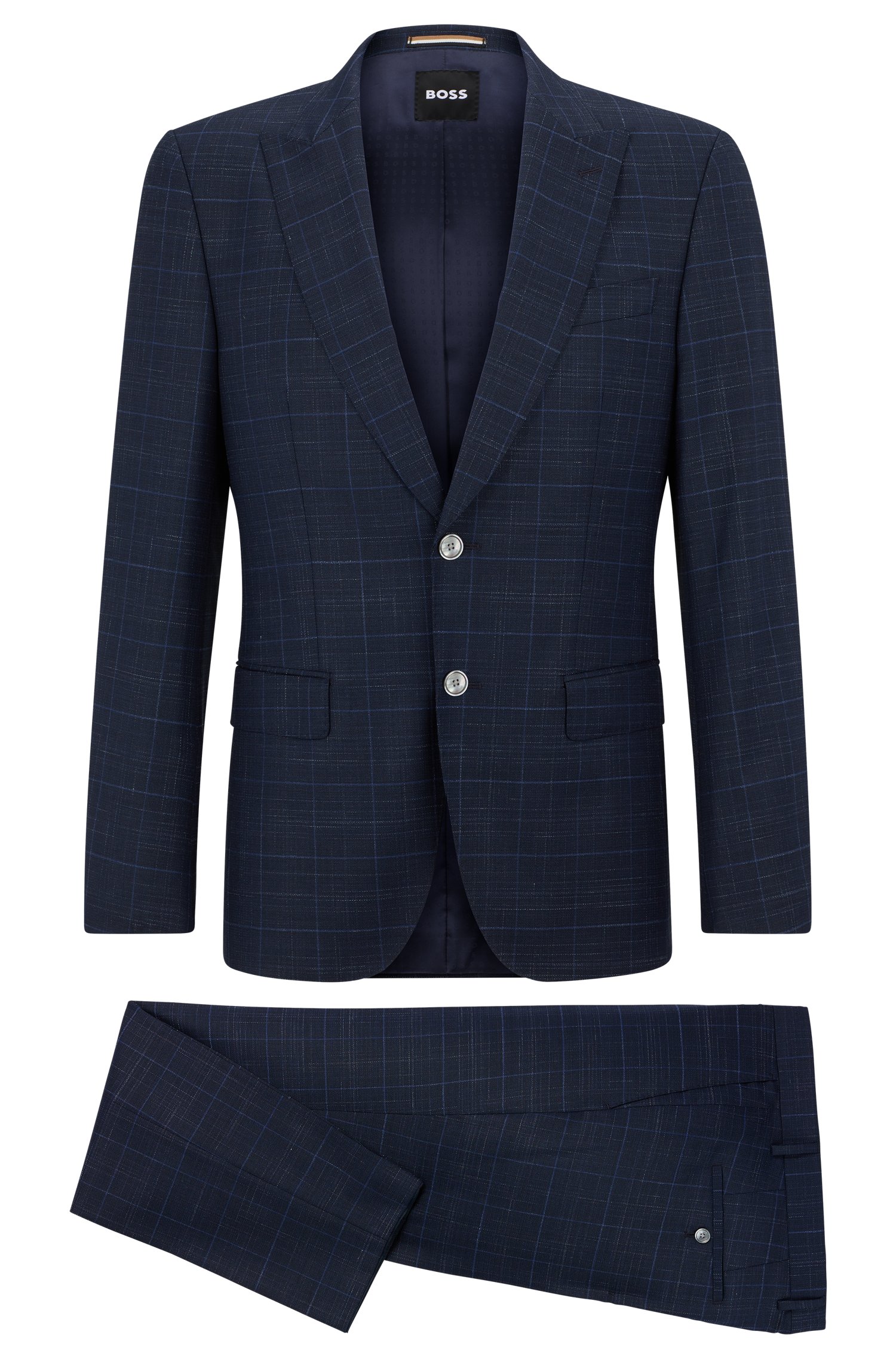 Markanter BOSS Anzug mit charakteristischem Innenfutter. Der schmal geschnittene Herren-Zweiteiler mit klassischem Karo-Muster ist aus einem Schurwoll-Mix mit Seiden-, Elasthan- und Leinen-Anteil gefertigt. Das cleane Sakko ist mit einem steigenden Revers und Pattentaschen versehen.