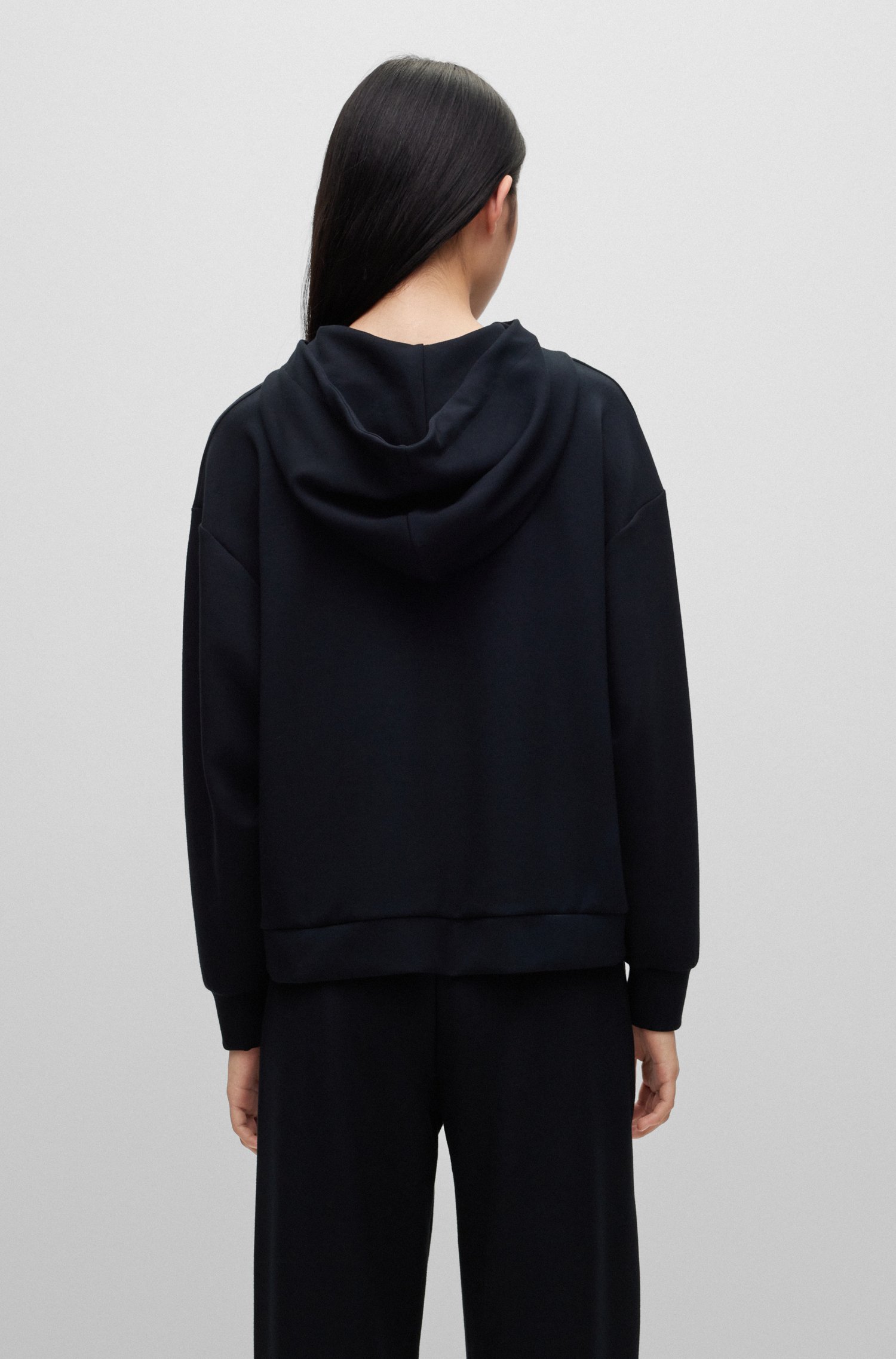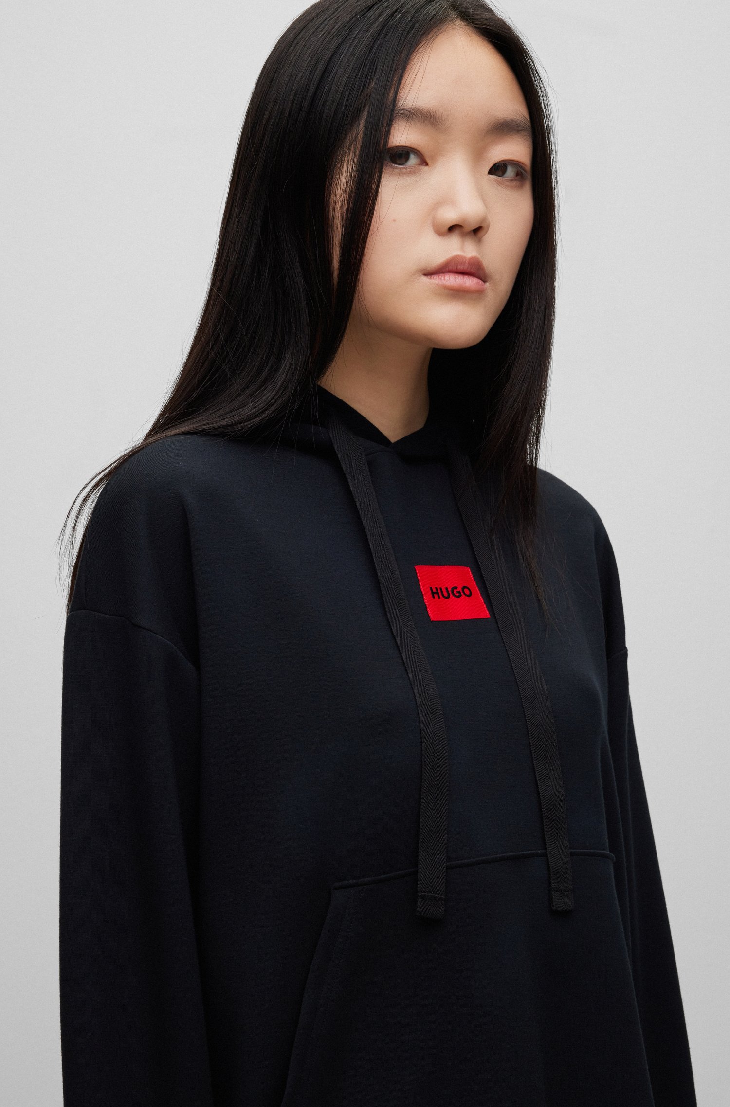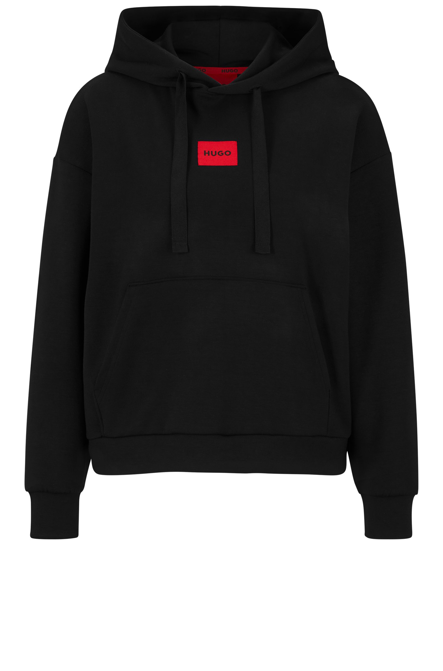 Markanter HUGO Loungewear-Hoodie. Das locker geschnittene Damen-Sweatshirt mit Kapuze und rotem HUGO Logo-Etikett auf der Brust eignet sich ideal für Layering-Looks. Das elastische Gewebe mit Modal-Anteil verspricht atmungsaktiven Tragekomfort.