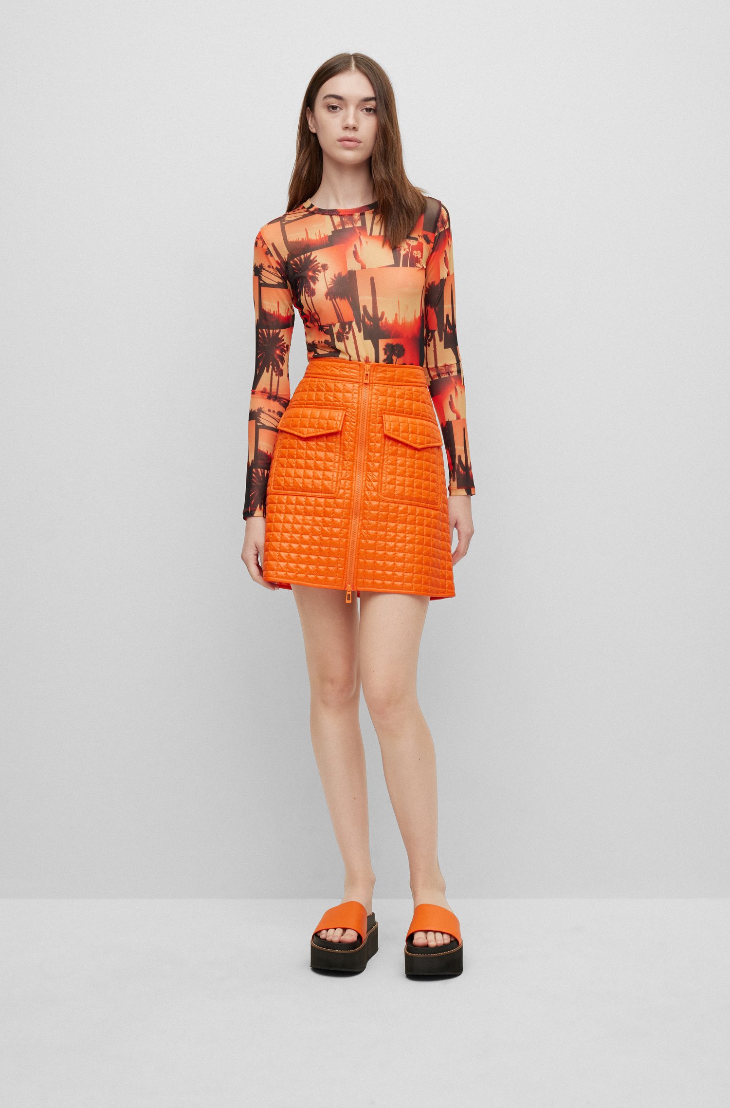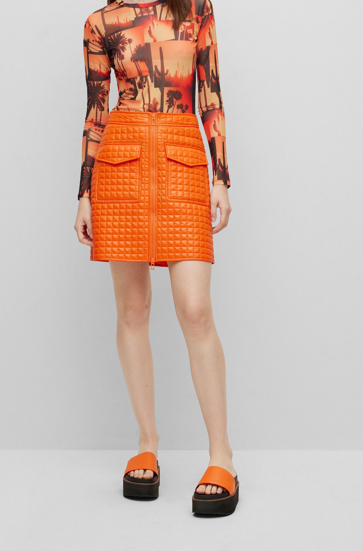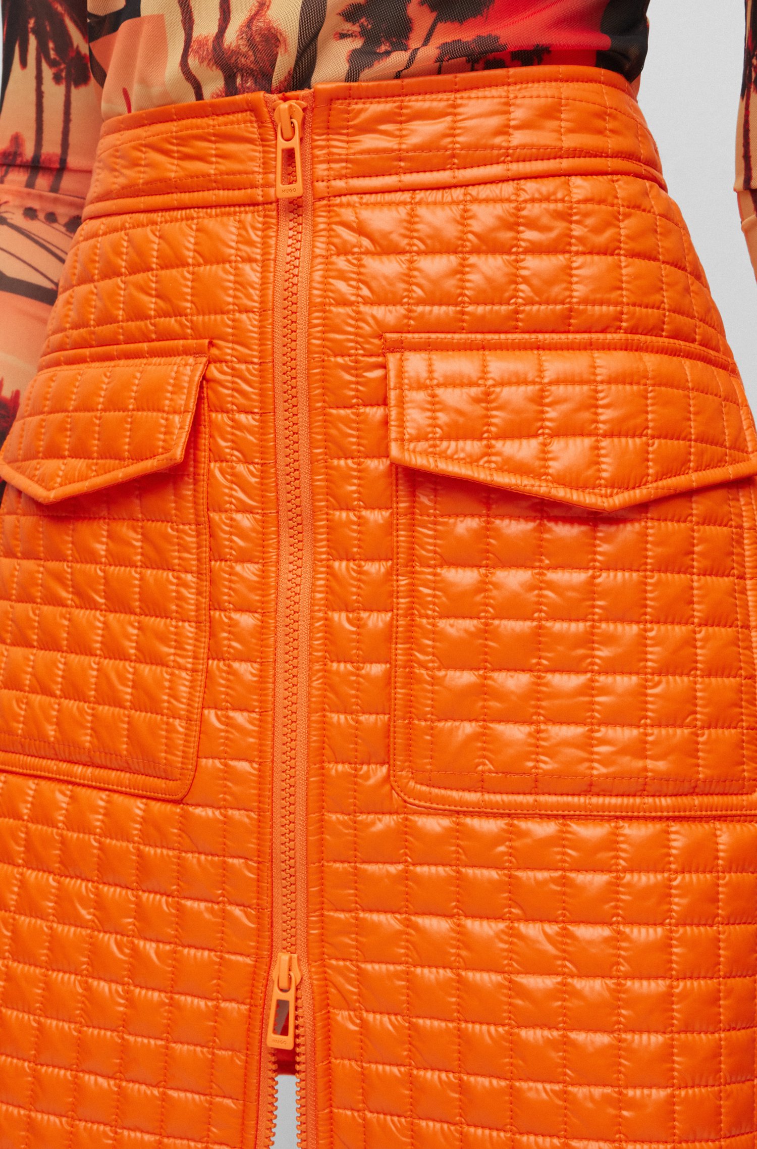 Setzt ein Statement: der gerade geschnittene HUGO Damen-Minirock aus einem gesteppten Material-Mix mit Reißverschluss auf der Vorderseite, aufgesetzten Taschen und Logo-Detail.