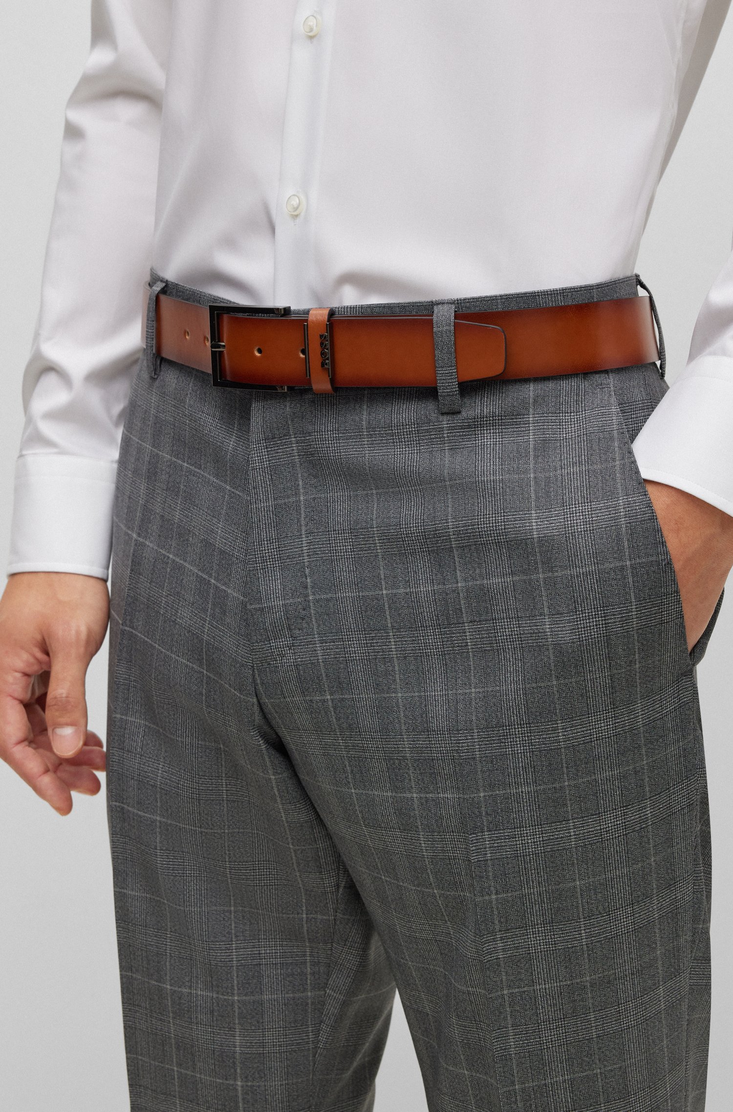 Edler BOSS Gürtel mit 3,5 Zentimetern Breite, der in Italien aus italienischem Leder gefertigt wird und mit einer Gürtelschlaufe mit Metall-Logo ausgestattet ist. Für eine optimale Passform sollte der Gürtel eine Größe größer als dein Taillenumfang sein.