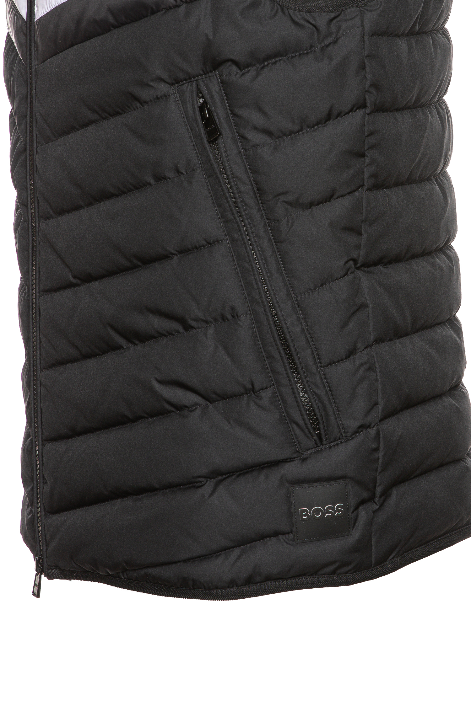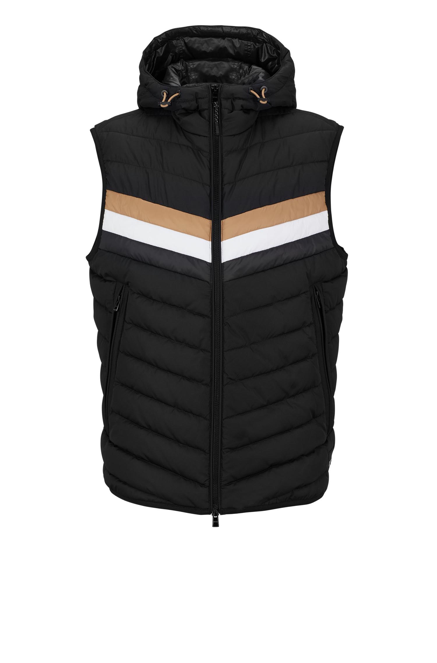 Bequeme BOSS Weste mit wasserabweisendem Finish und wattierten Absteppungen. Signature-Streifen und ein Logo-Aufnäher runden die Herren-Outerwear ab.