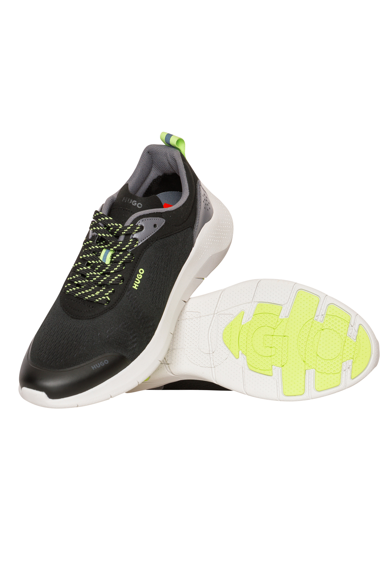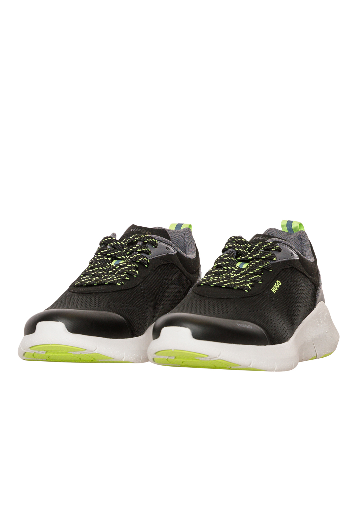 Hybride HUGO Sneakers. Die Herren-Schnürer sind aus verschiedenen Materialien wie sportivem Mesh gefertigt und mit mehreren charakteristischen HUGO Brandings versehen. Die Sohle aus EVA und Gummi hat ein zeitgemäßes Profil.