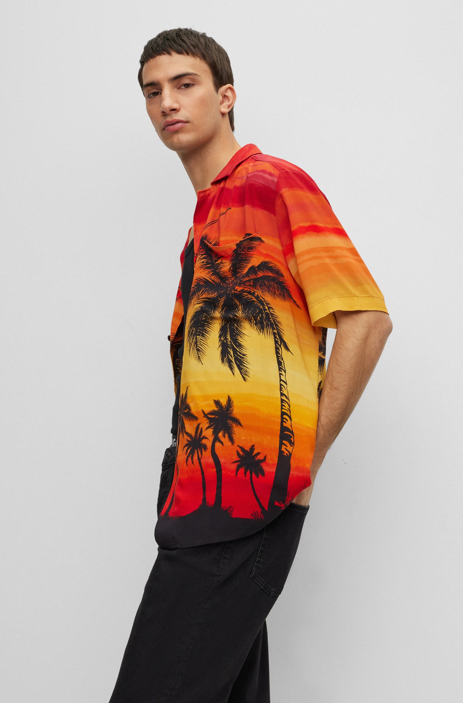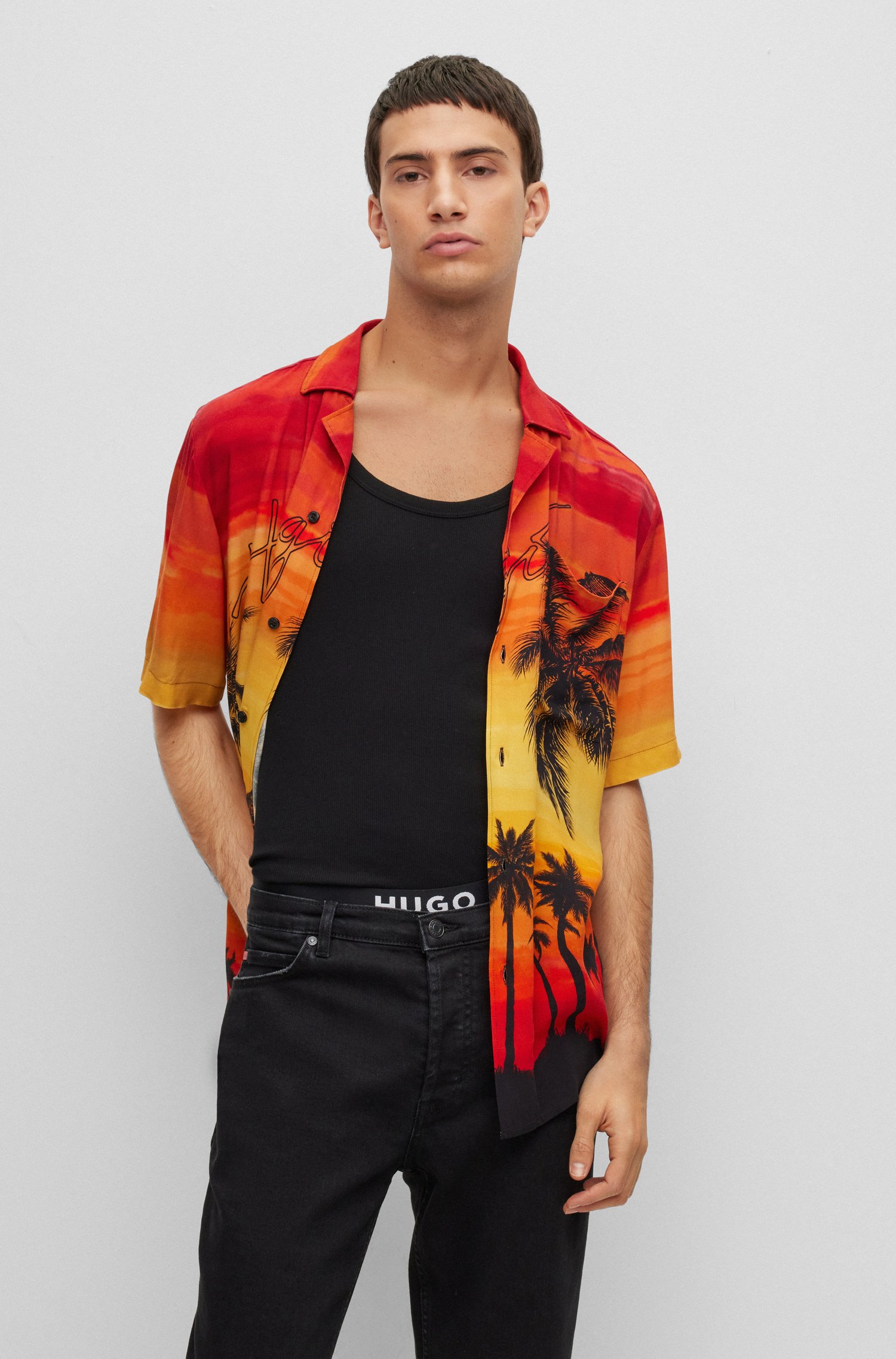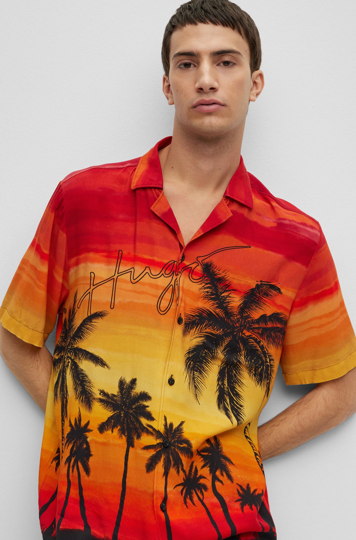 Markantes HUGO Sommer-Hemd aus softem Canvas für Herren mit lockerer Passform, handgeschriebenem Logo und einem Print von Palmen bei Sonnenuntergang.