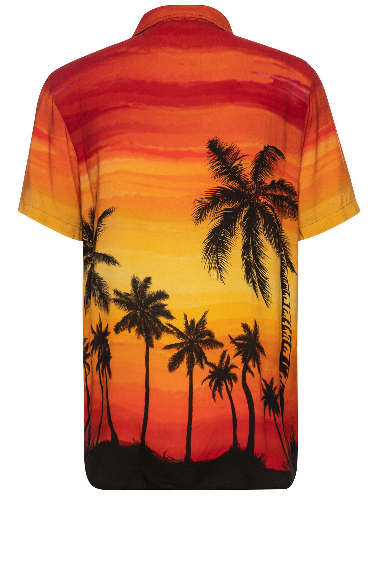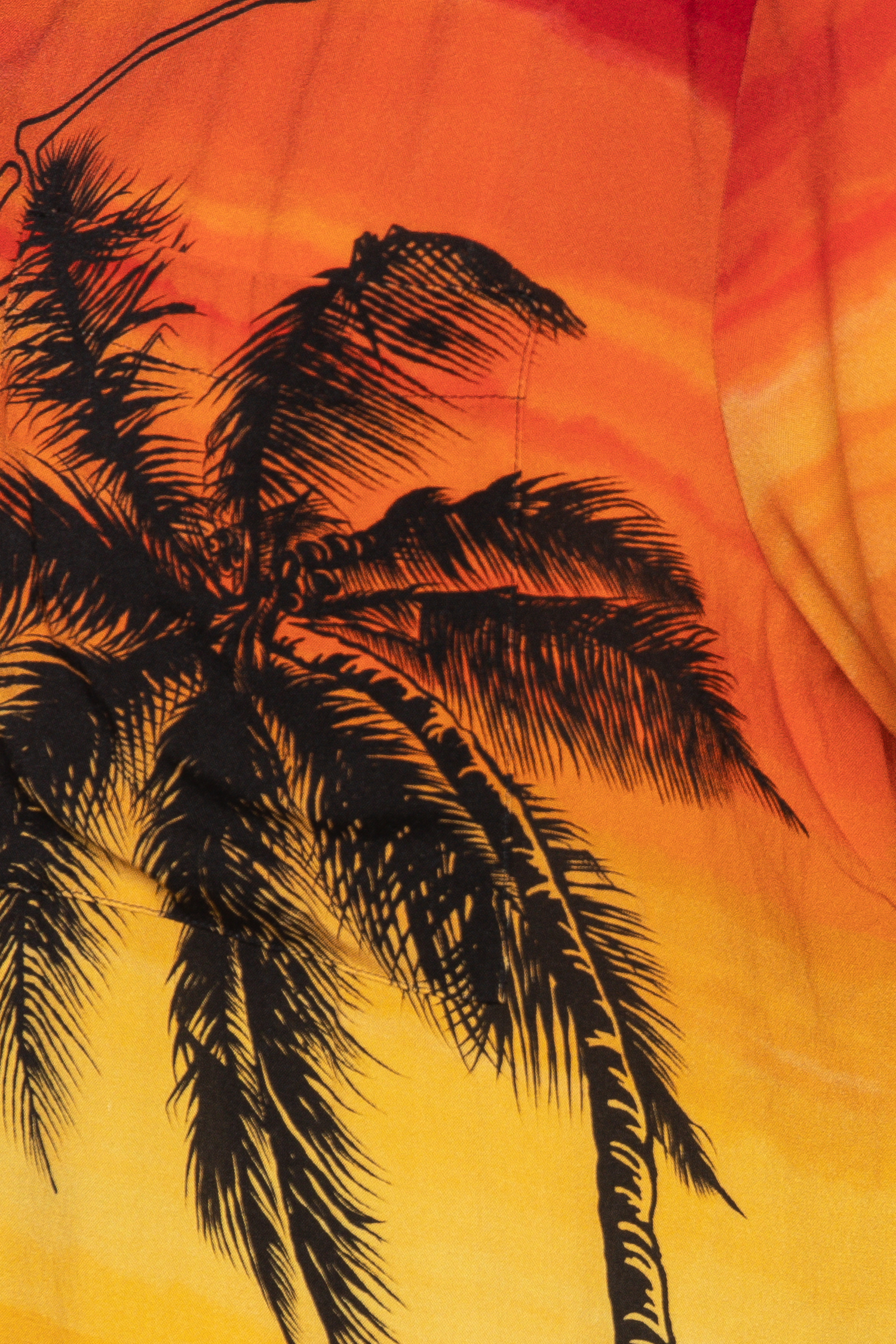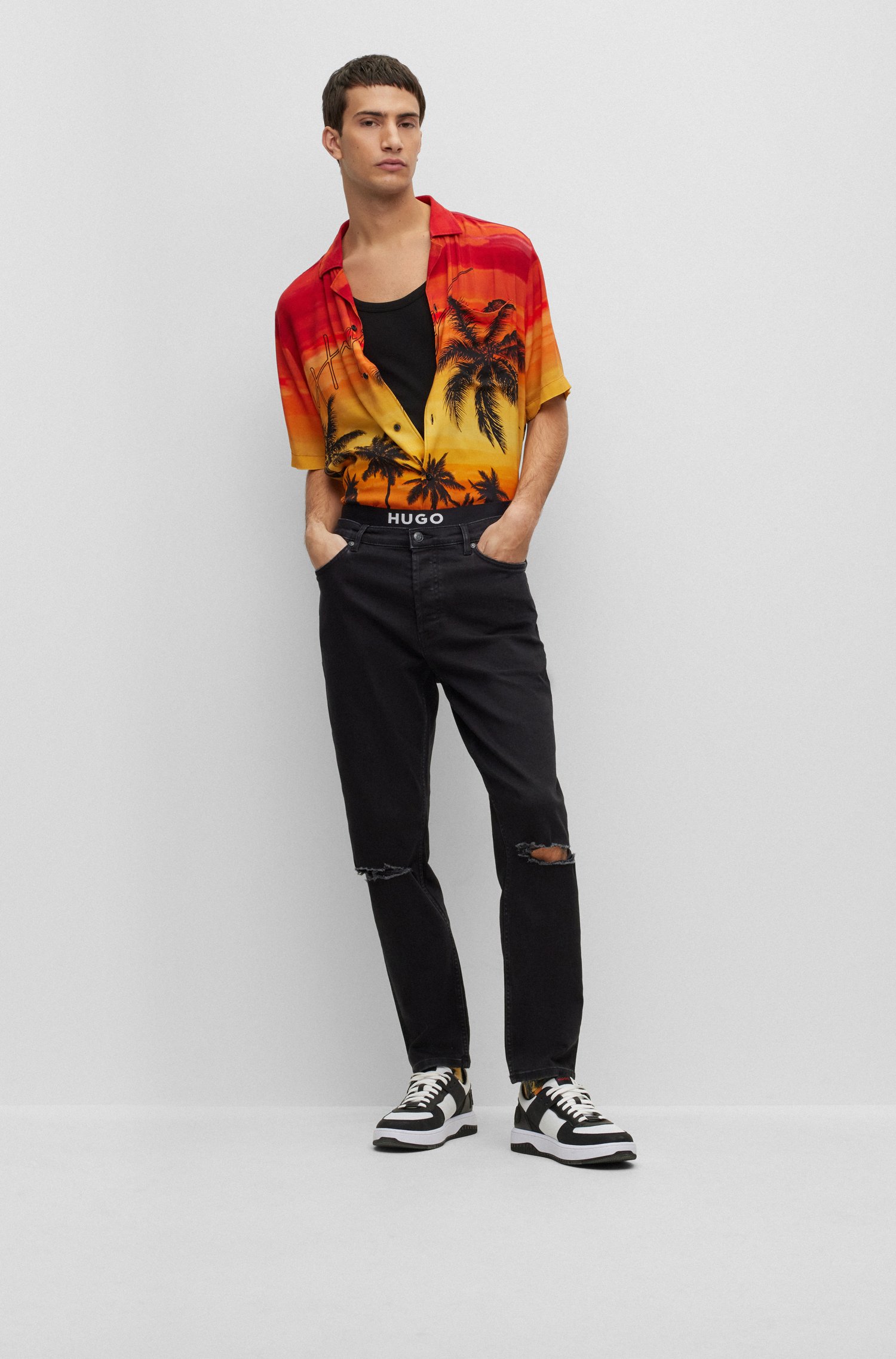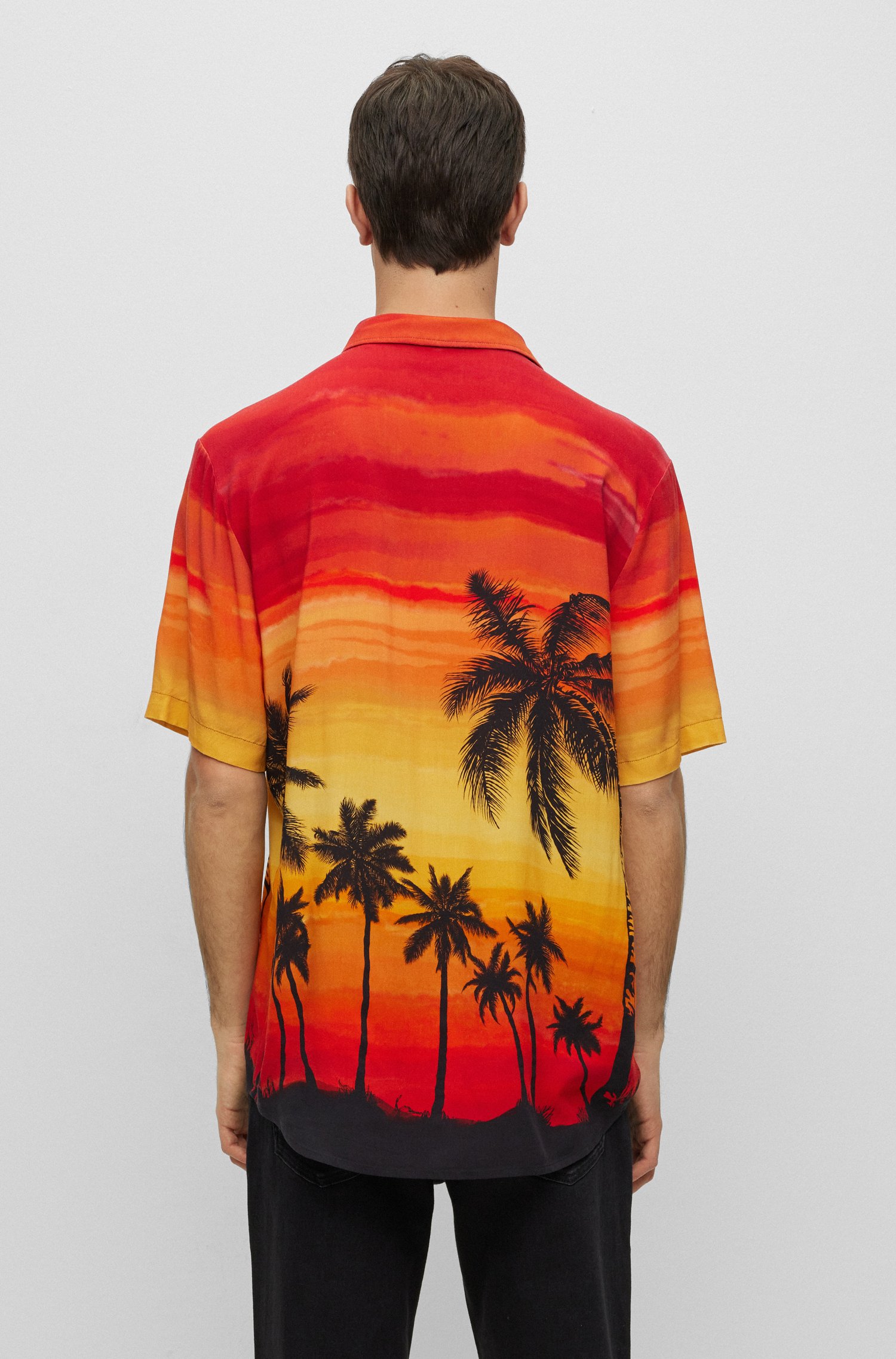 Markantes HUGO Sommer-Hemd aus softem Canvas für Herren mit lockerer Passform, handgeschriebenem Logo und einem Print von Palmen bei Sonnenuntergang.