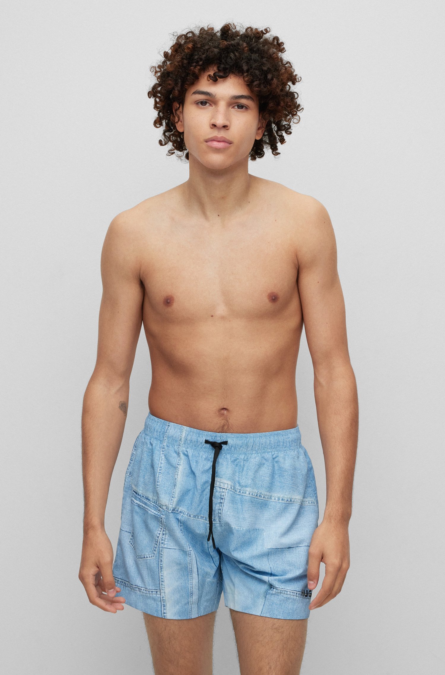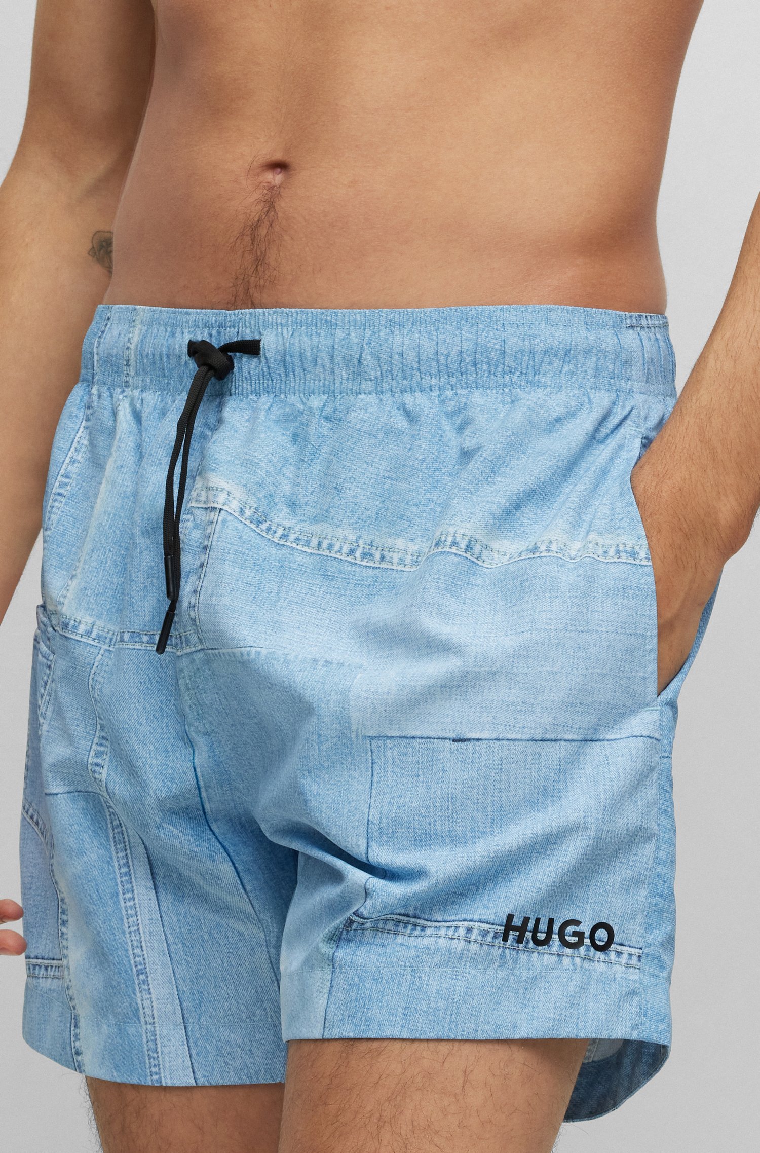 Schnell trocknende HUGO Badeshorts mit Print im Denim-Look, durchgehendem Innenfutter und Logo-Details.