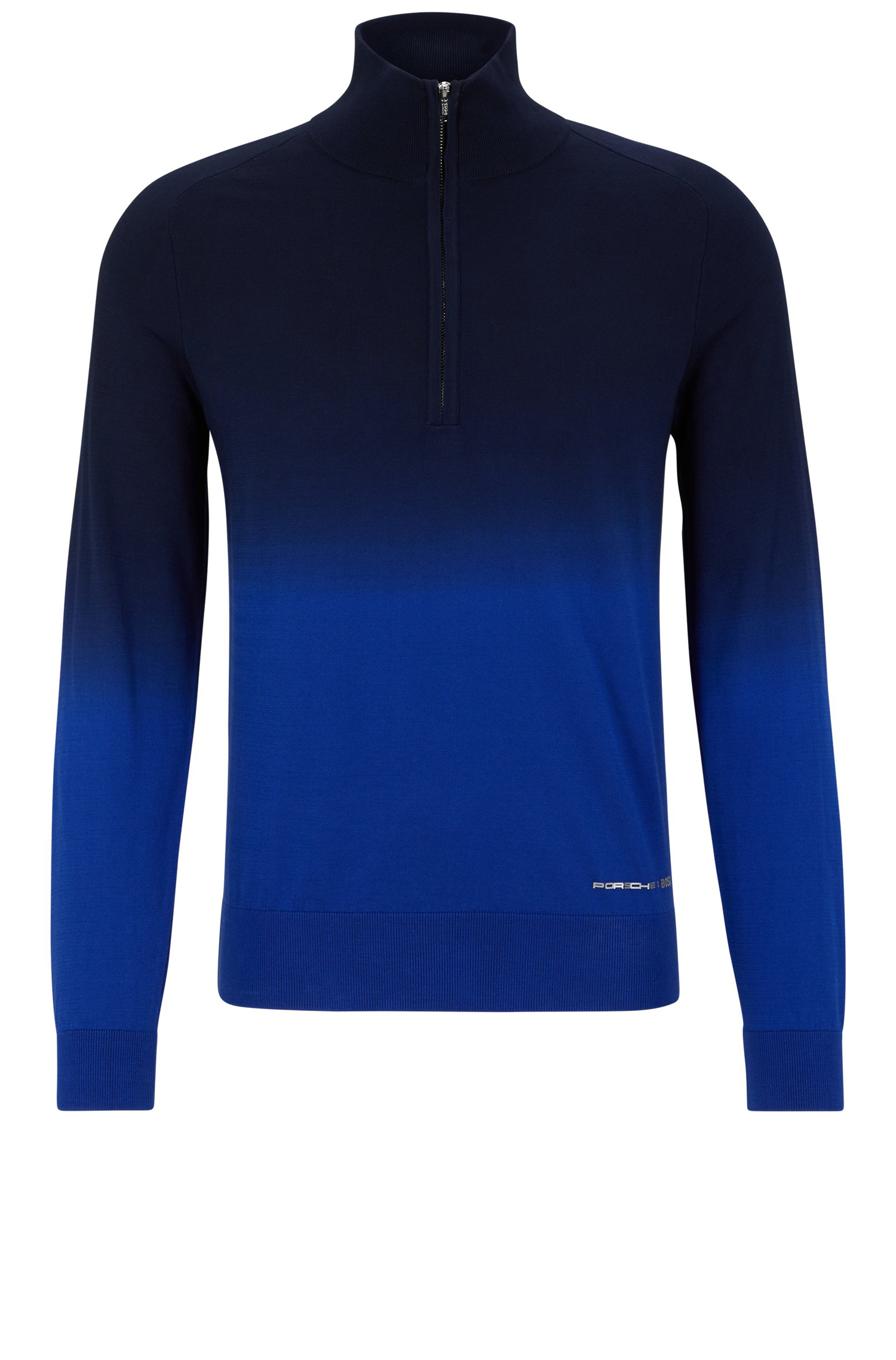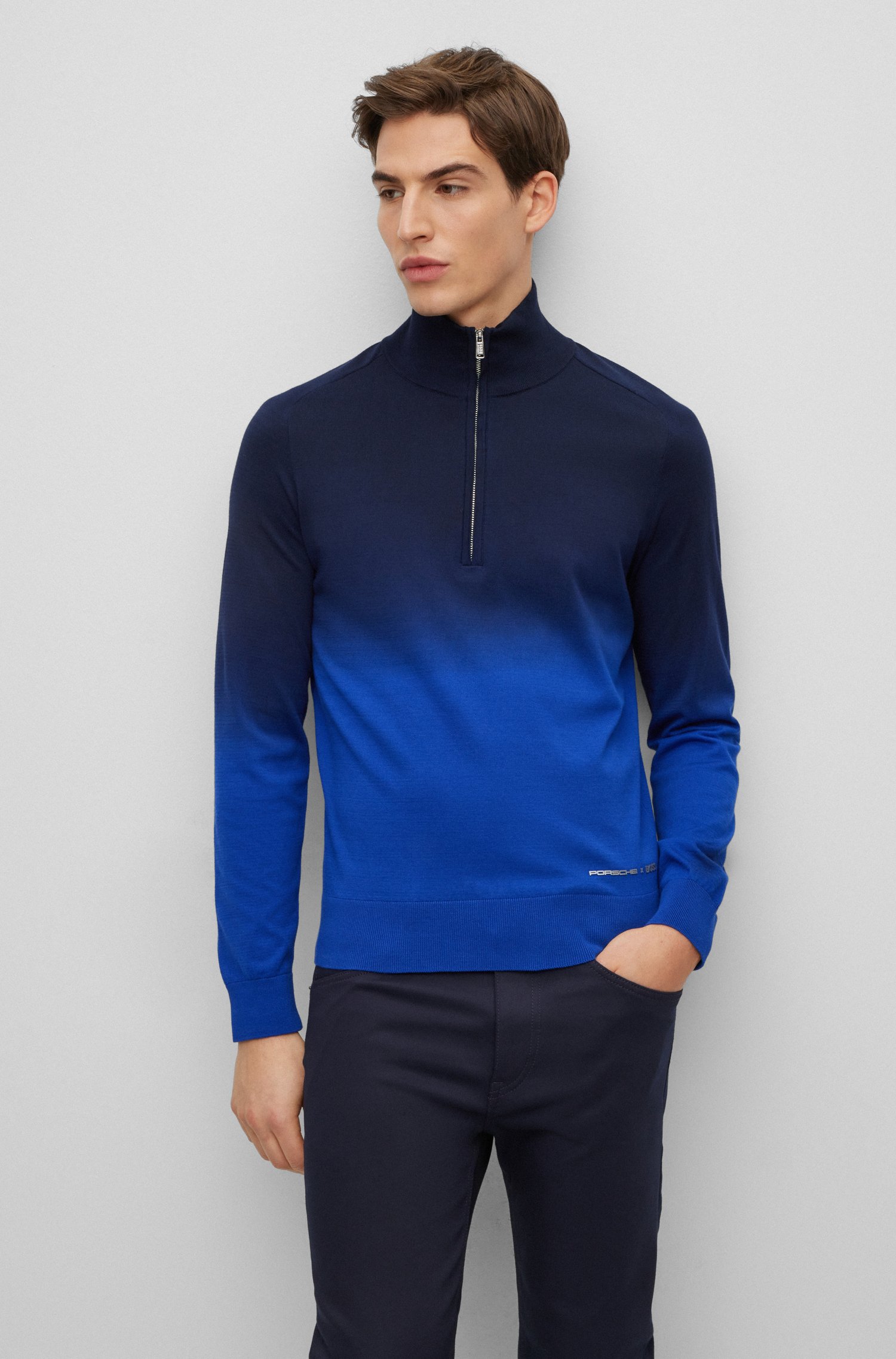 Gerade geschnittener BOSS Pullover mit Logo der Capsule und Troyerkragen. Teil der Porsche x BOSS Kollektion, bei der die ikonische Silhouette der Porsche Sportwagen als Inspiration dient.