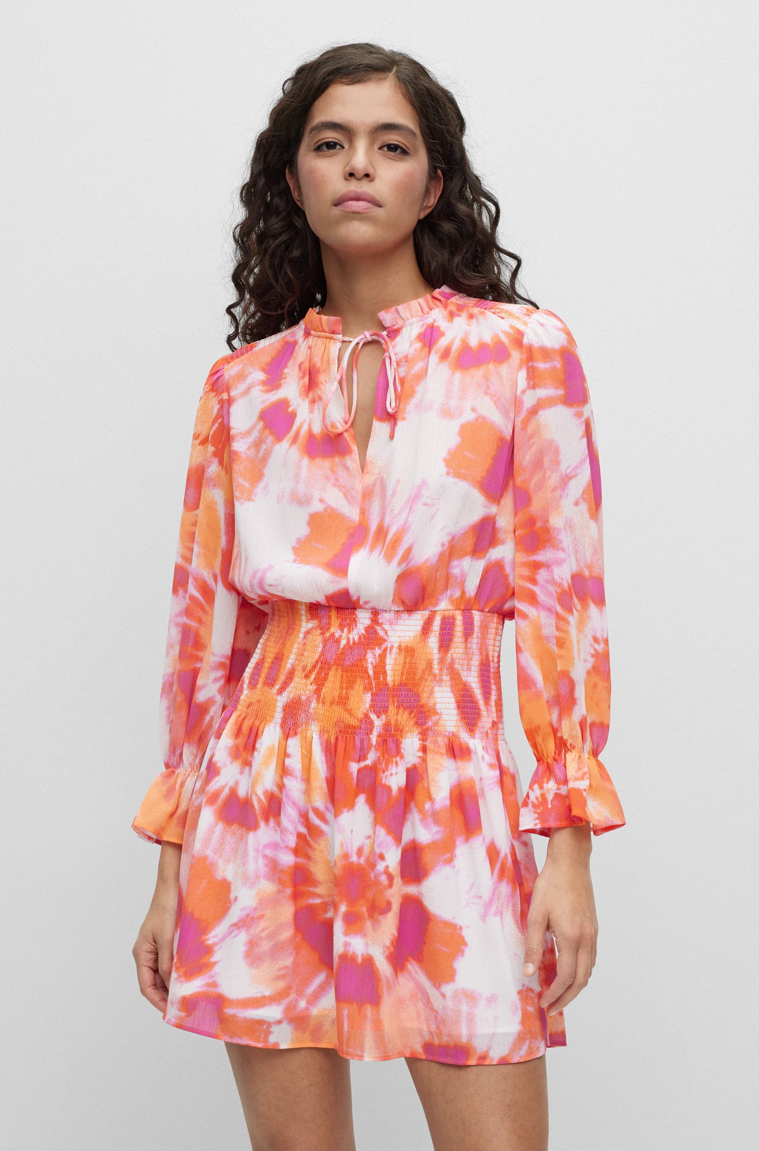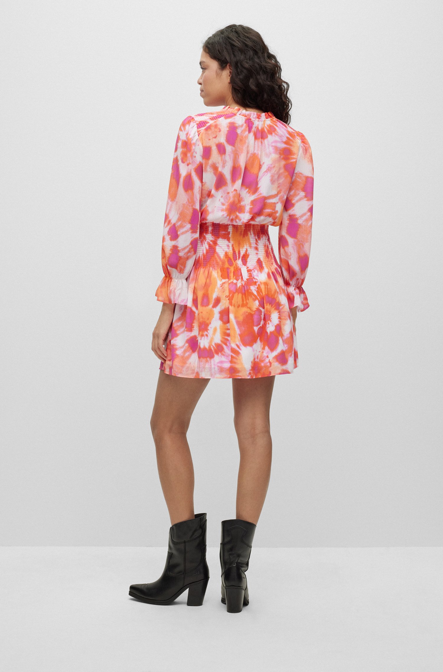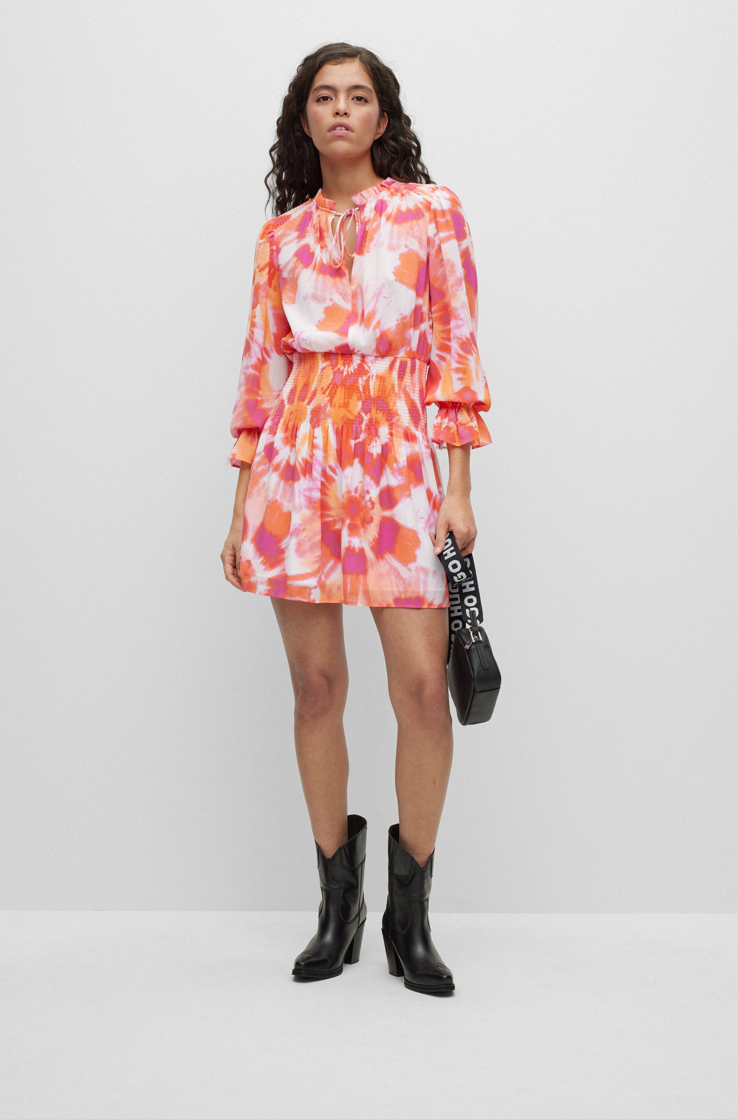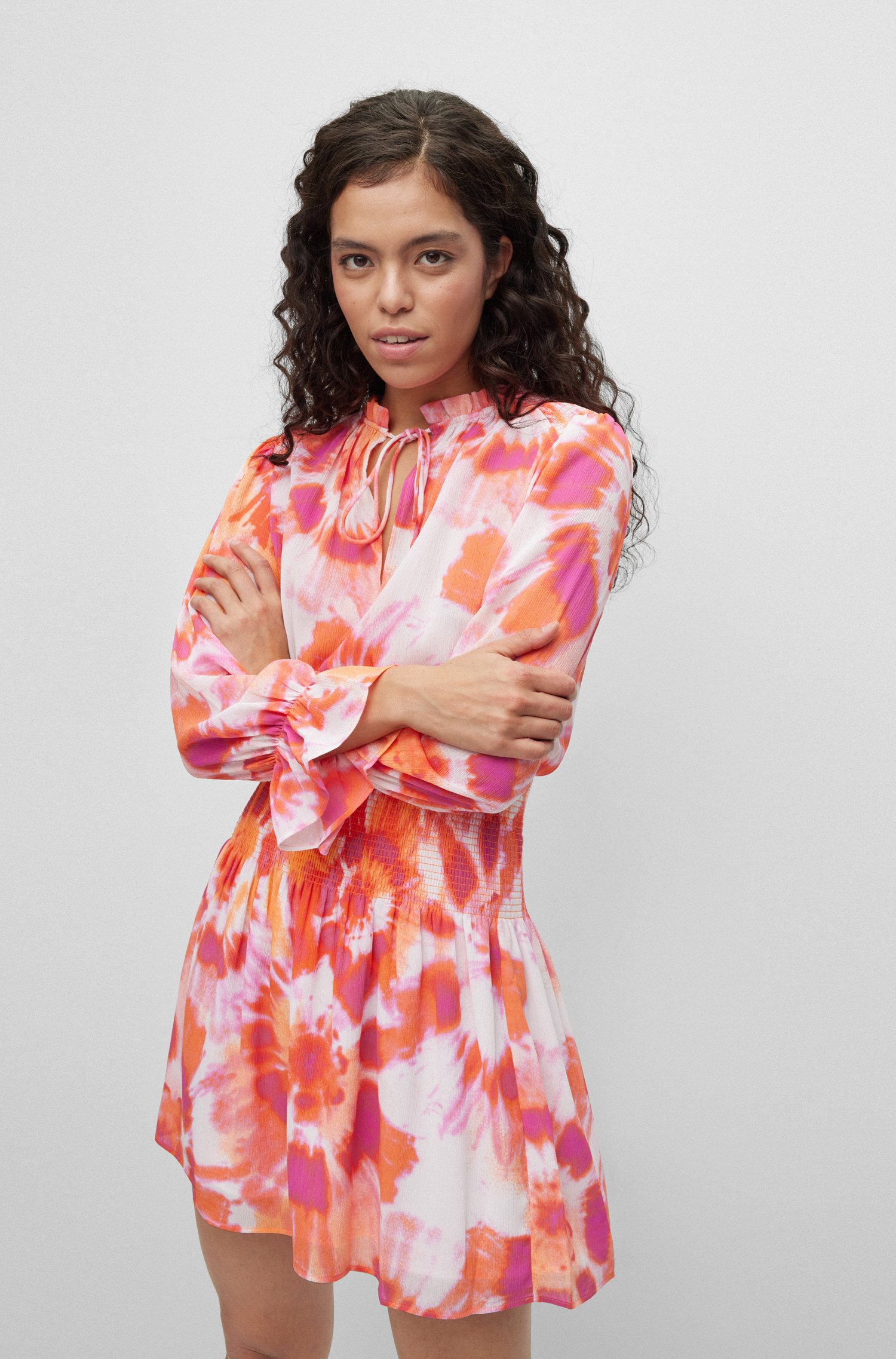 Gerade geschnittenes HUGO Kleid aus einem saisonal bedruckten Material-Mix mit gesmoktem Detail und V-Ausschnitt.