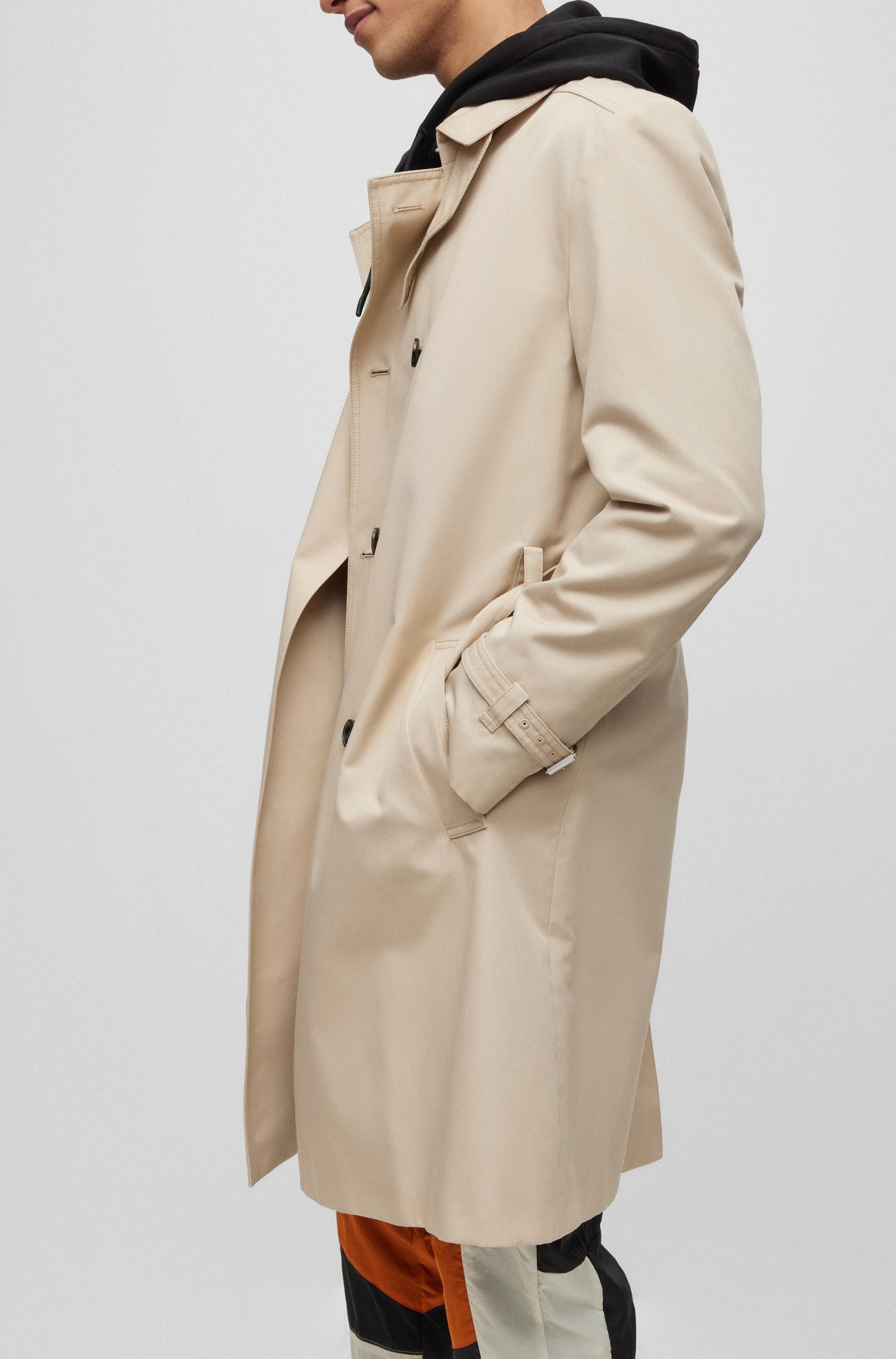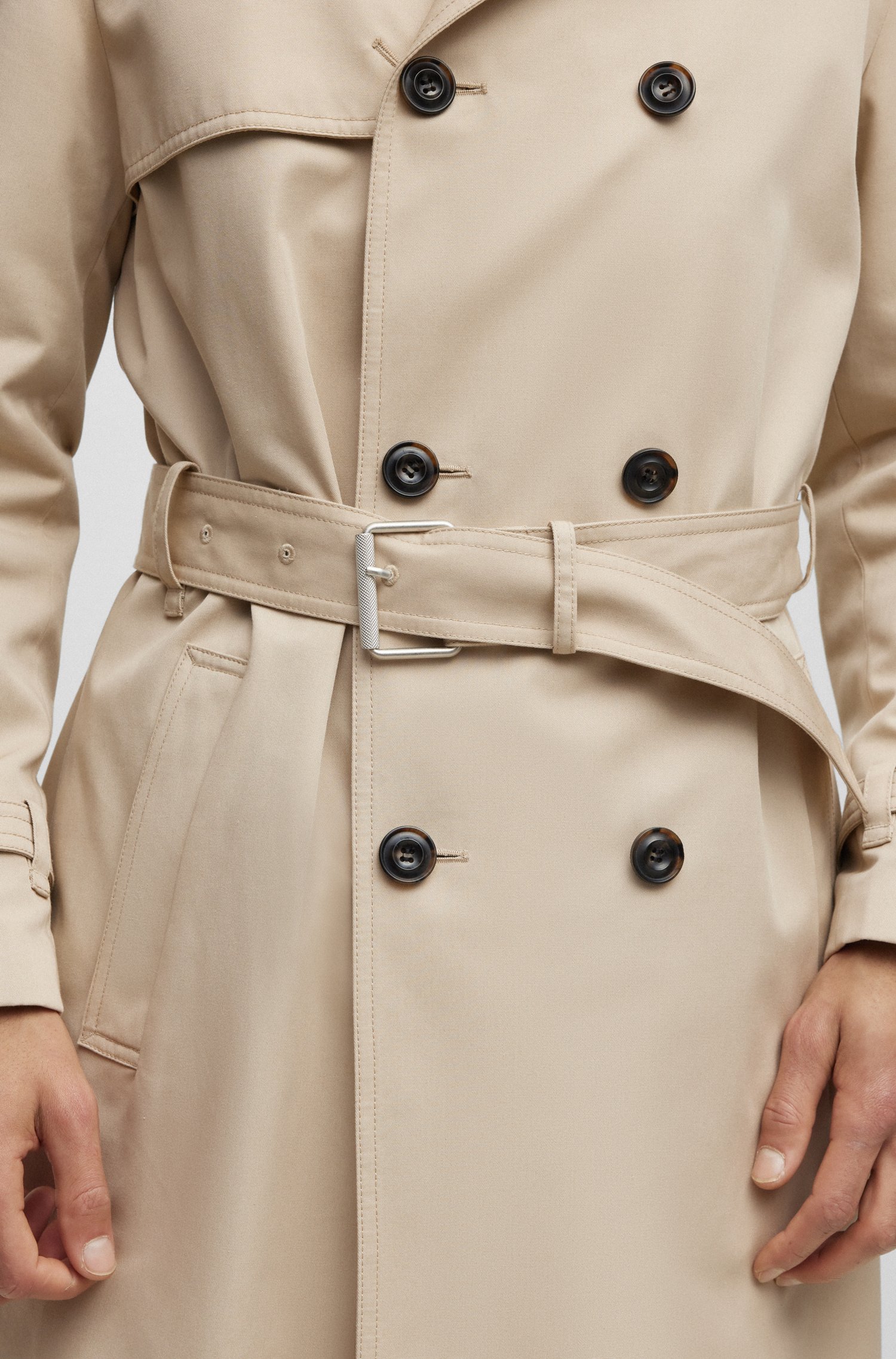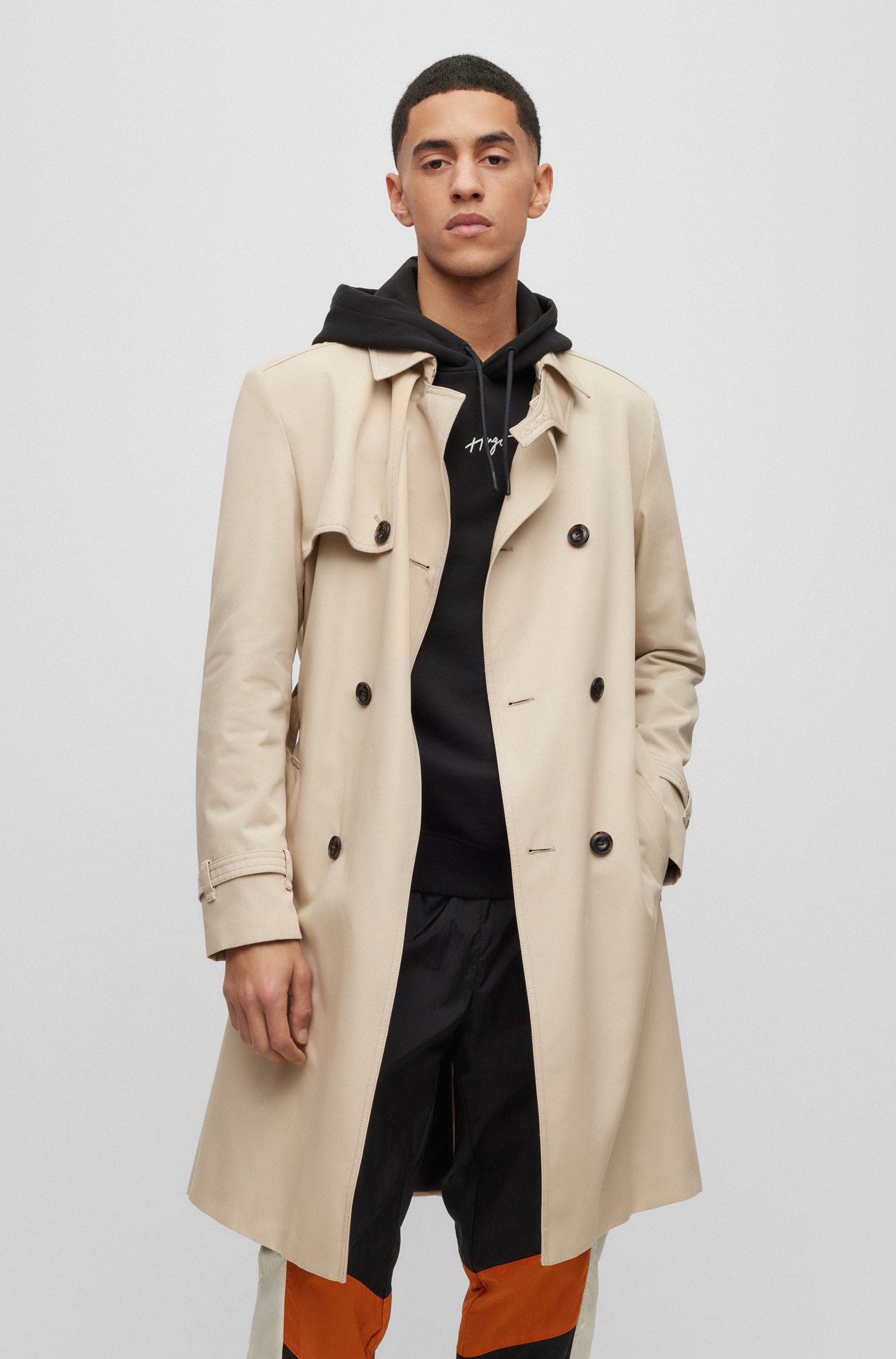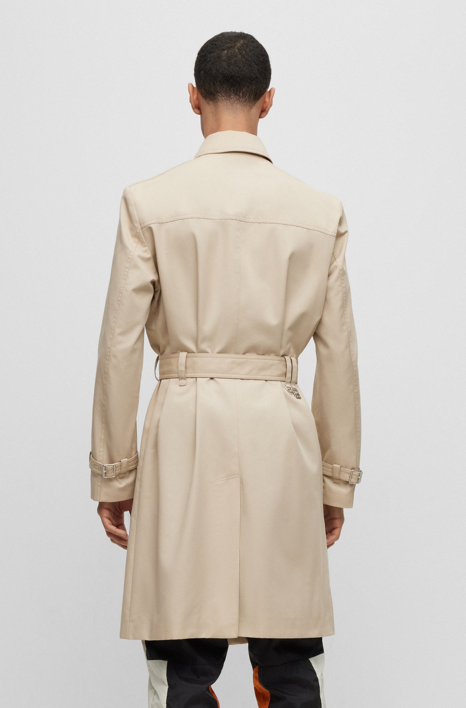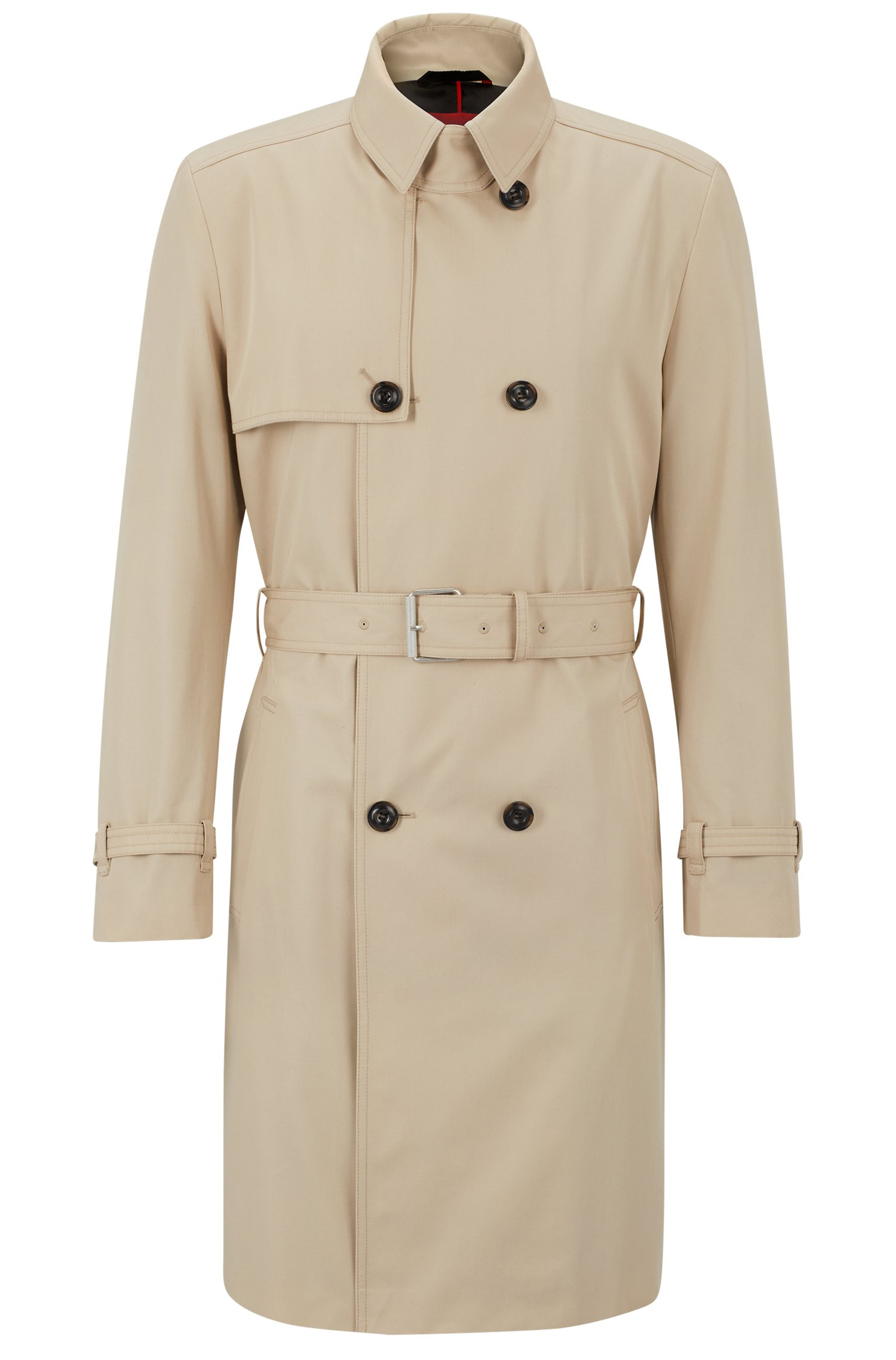 Authentischer HUGO Trenchcoat aus einem wasserabweisenden Material-Mix mit Baumwoll-Anteil, der mit einem Logo-Besatz an der hinteren Gürtelschlaufe versehen ist.