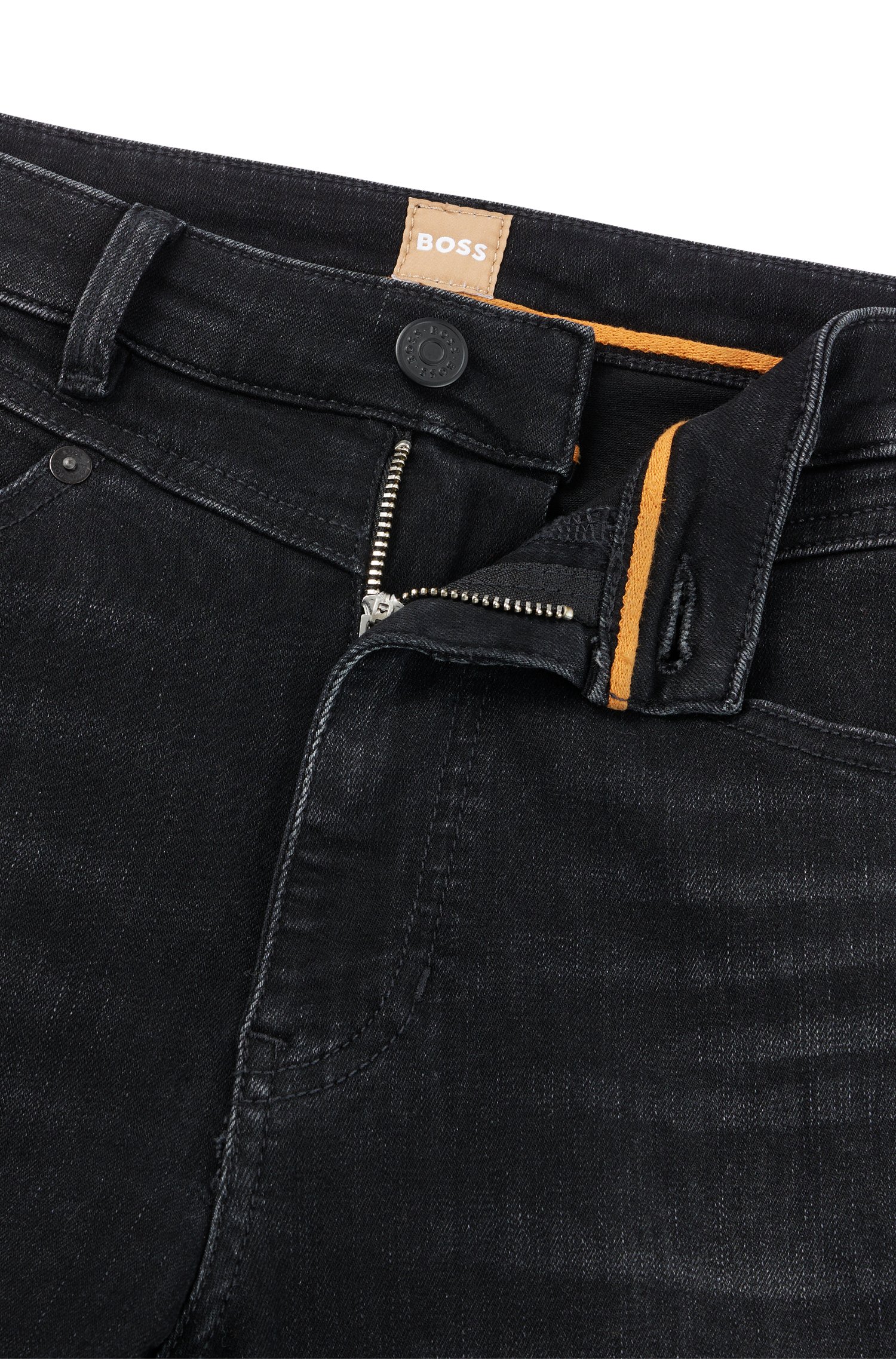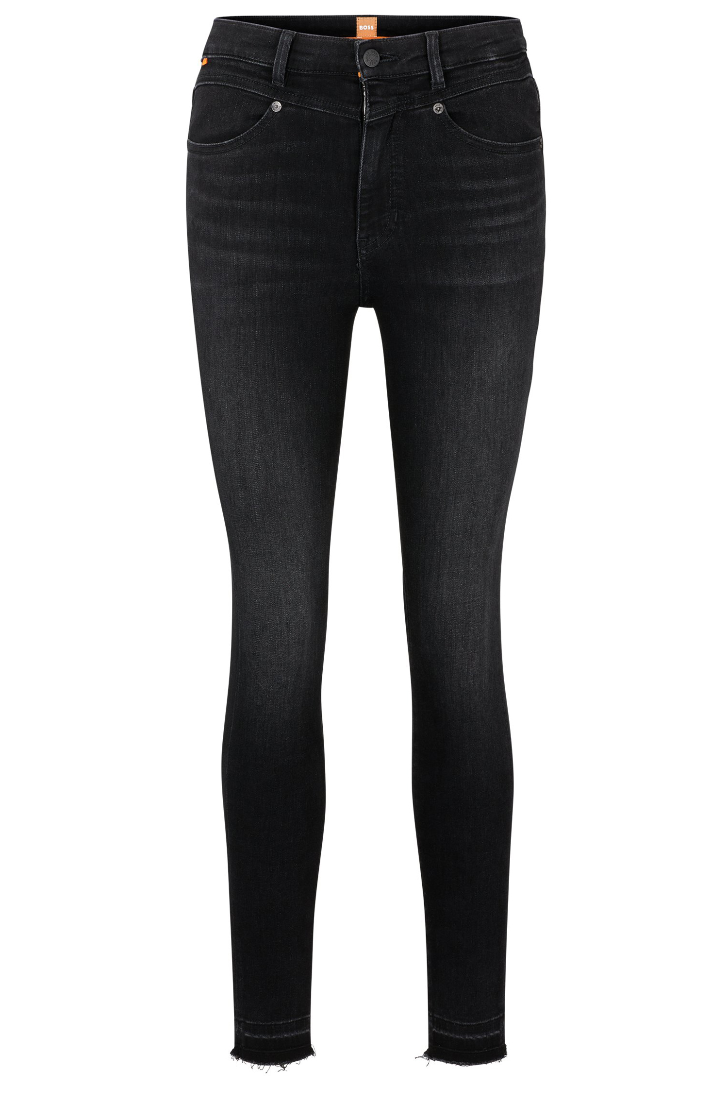 Figurbetonte BOSS Jeans aus schwarzem Stretch-Denim mit hohem Bund, Signature-Details und ausgefranstem Saum.