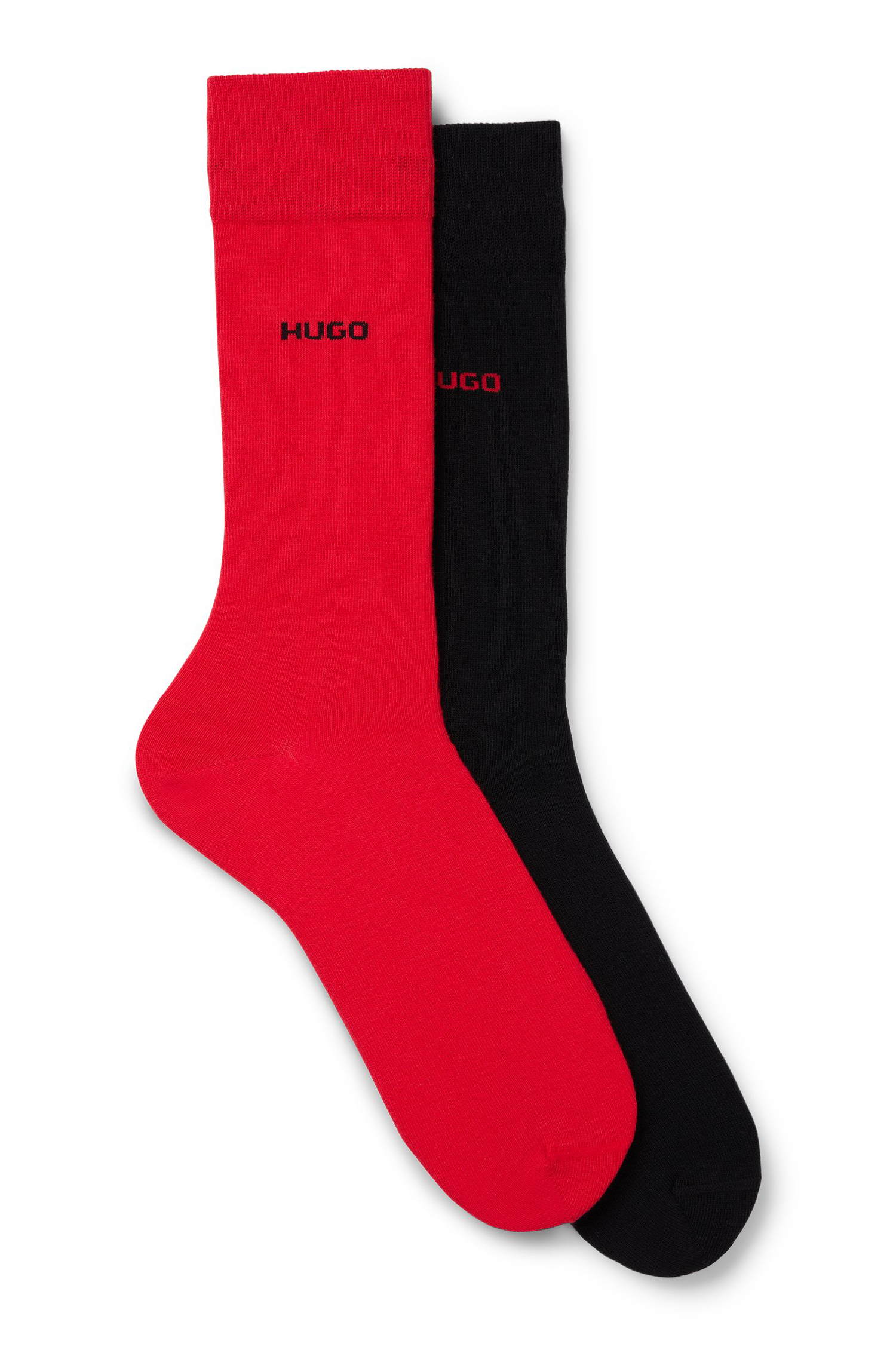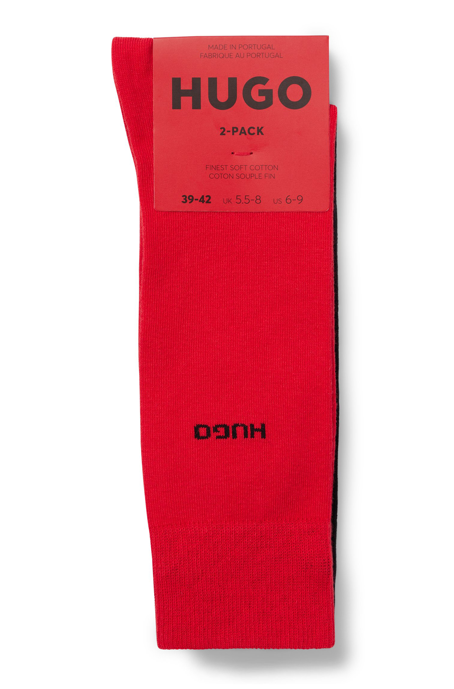 Zwei Paar besonders softe HUGO Socken. Die mittelhohen Herren-Socken für jeden Tag sind aus einem Baumwoll-Mix mit Elasthan-Anteil gefertigt und behalten ihre Form dauerhaft bei. Unverkennbare HUGO Logos am Bund setzen markante Akzente.