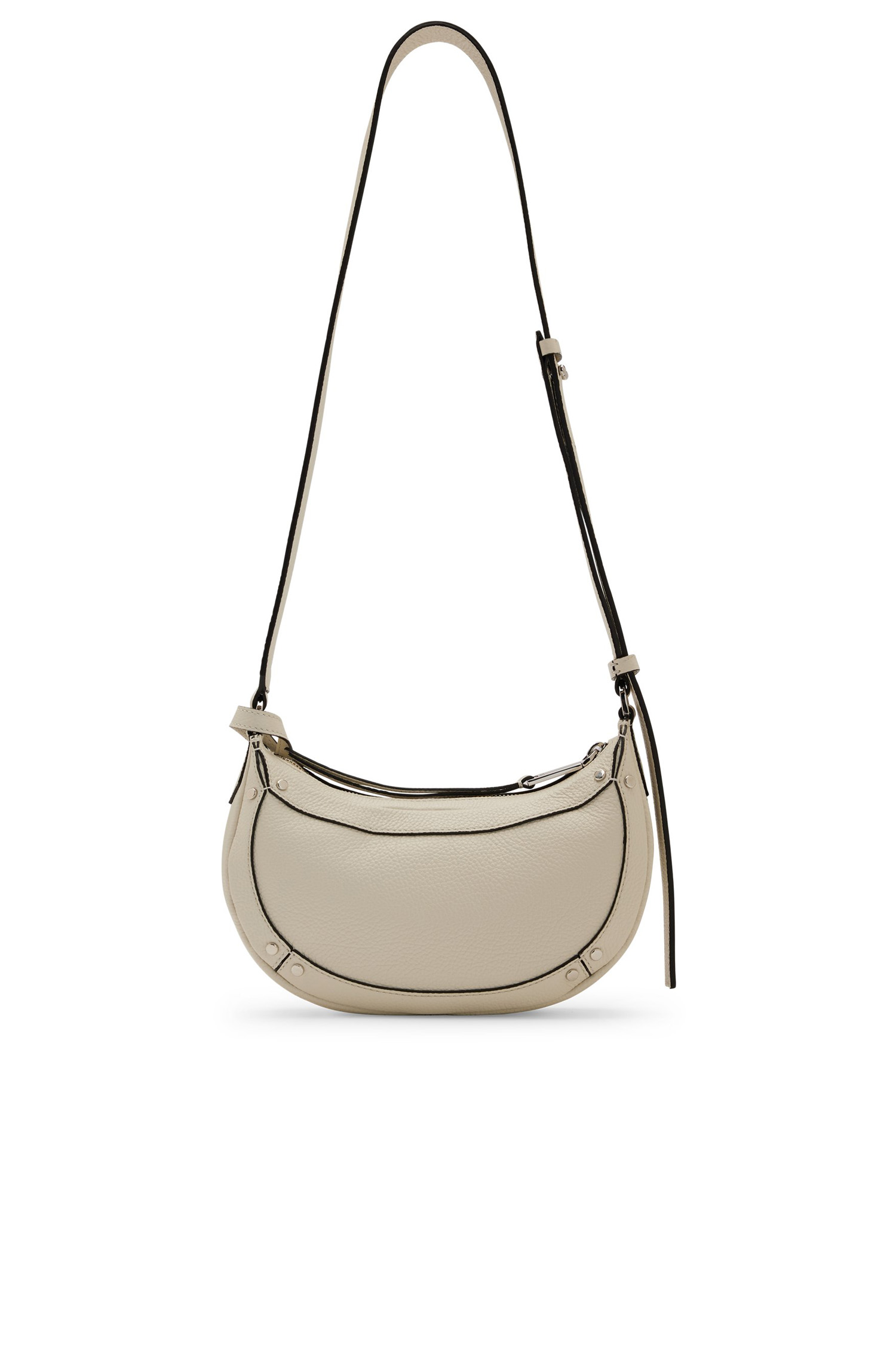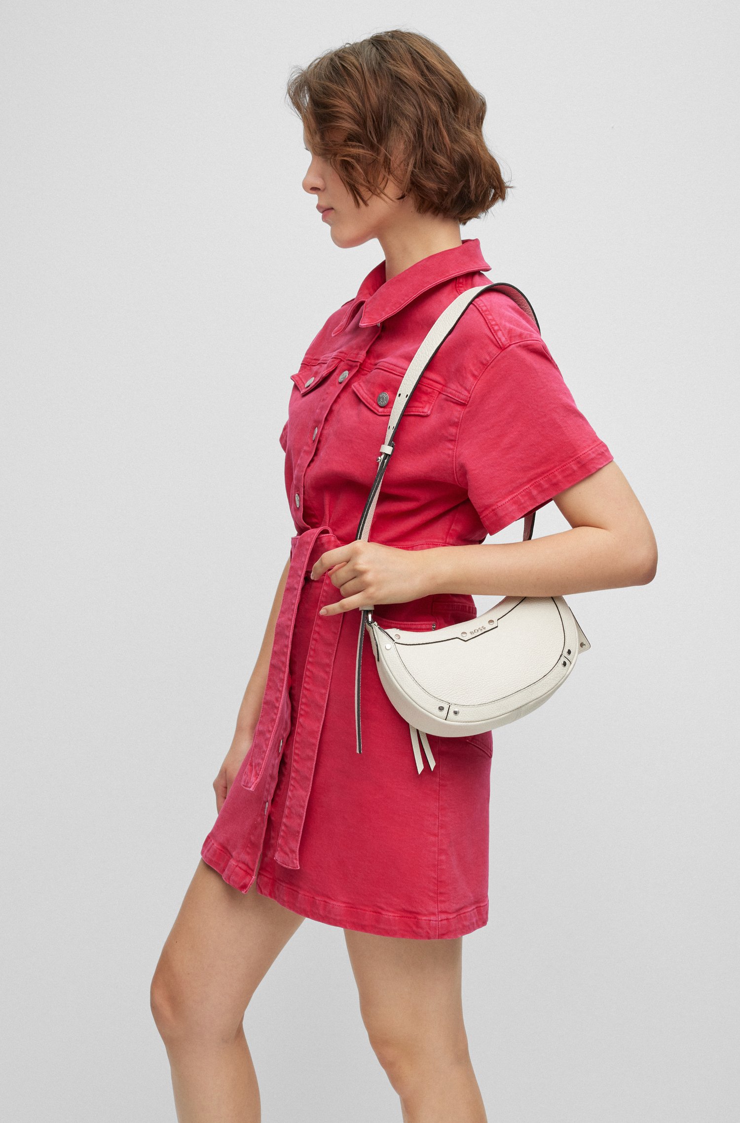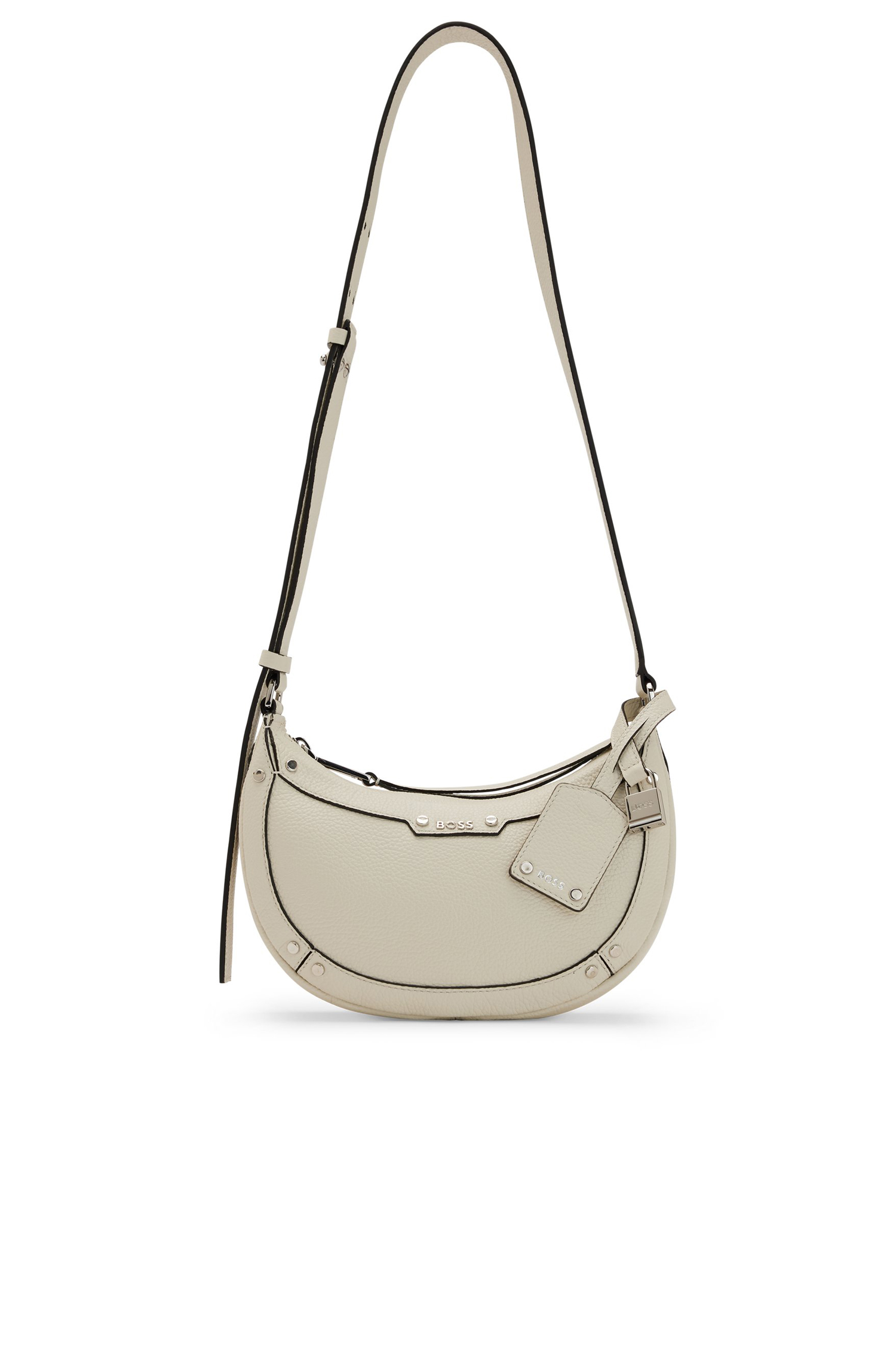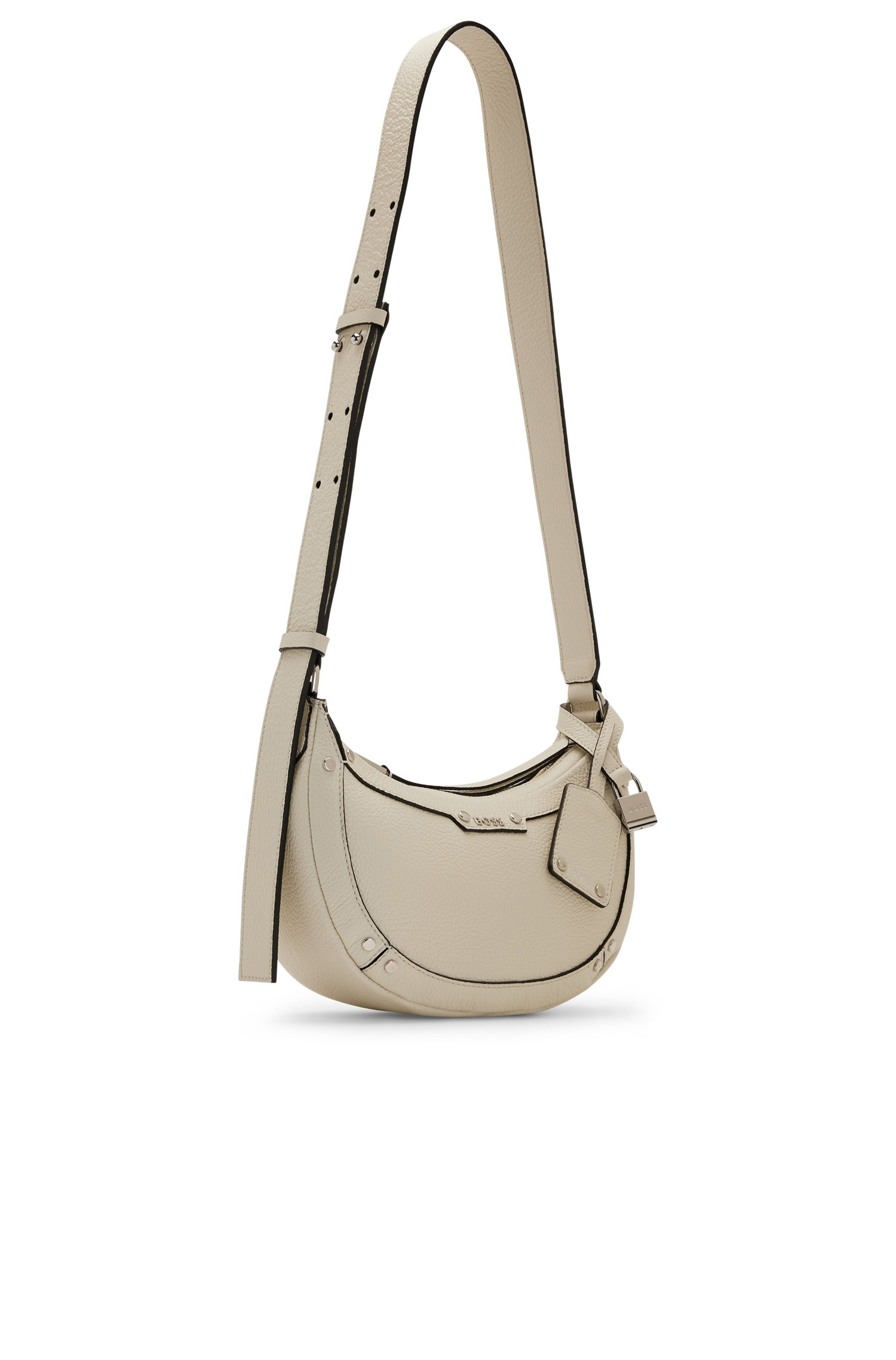 Markante BOSS Hobo Bag aus genarbtem Leder mit Signature-Details, Metallnieten und dekorativem Vorhängeschloss. Für unsere RESPONSIBLE Produkte verwenden wir immer mindestens 60 % nachhaltigere Rohmaterialien. Mindestens 60 % des Leders für dieses Produkt stammen aus zertifizierten Gerbereien, die mit umweltschonenden Methoden arbeiten, um die Auswirkungen auf den Planeten zu reduzieren. Mit dem Kauf dieses Produkts unterstützt du die nachhaltigere Lederherstellung durch die Leather Working Group (LWG). Wir verwenden nur Leder, das als Nebenprodukt in der Lebensmittelbranche anfällt. Die Maße: 17,0 x 24,0 x 7,0 Zentimeter.