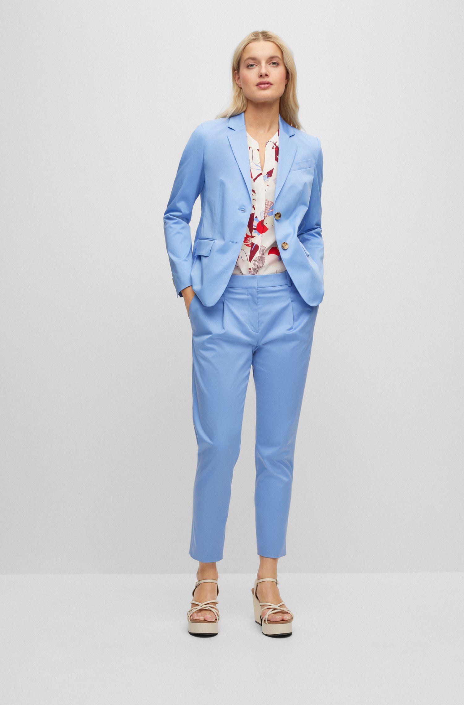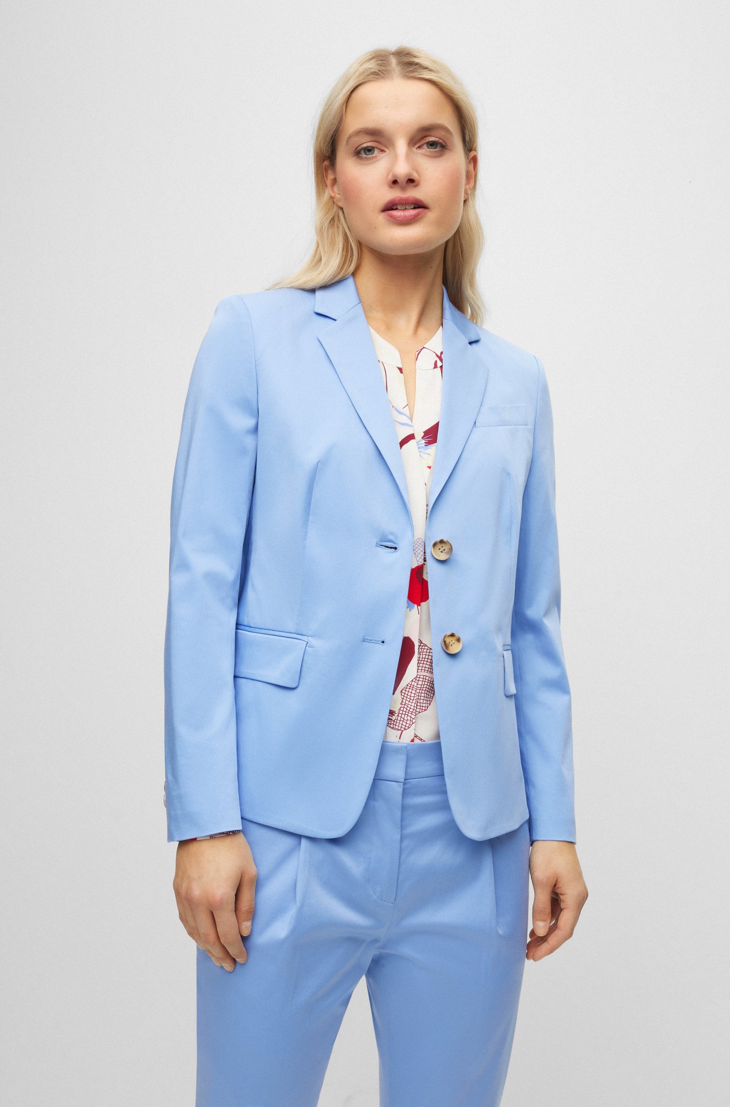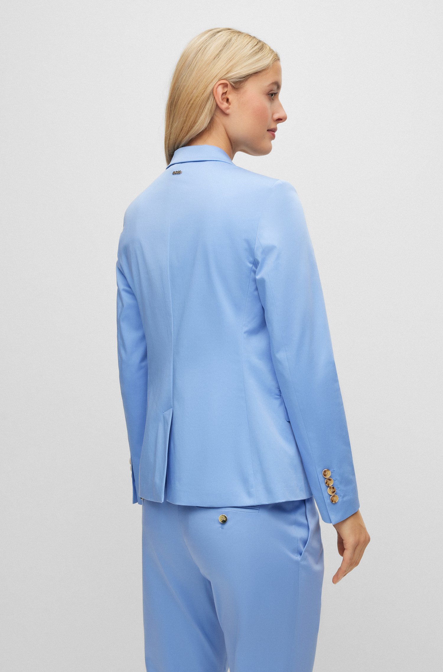 Schmal geschnittener BOSS Damen-Einreiher aus einem Stretch-Gewebe mit Signature-Streifen auf der Innenseite.