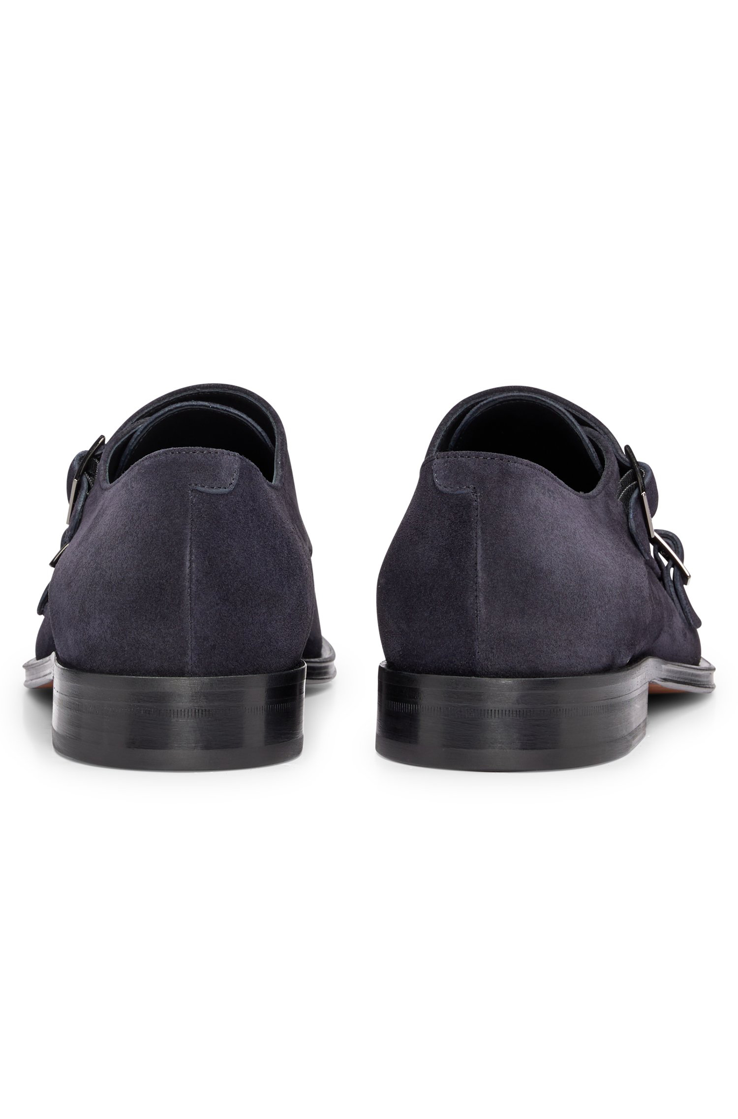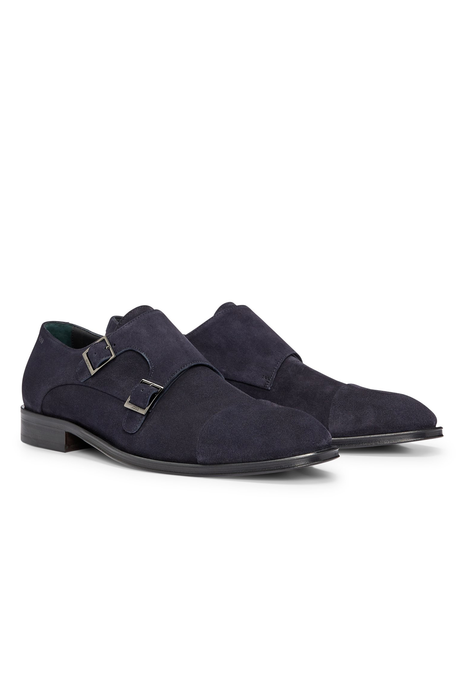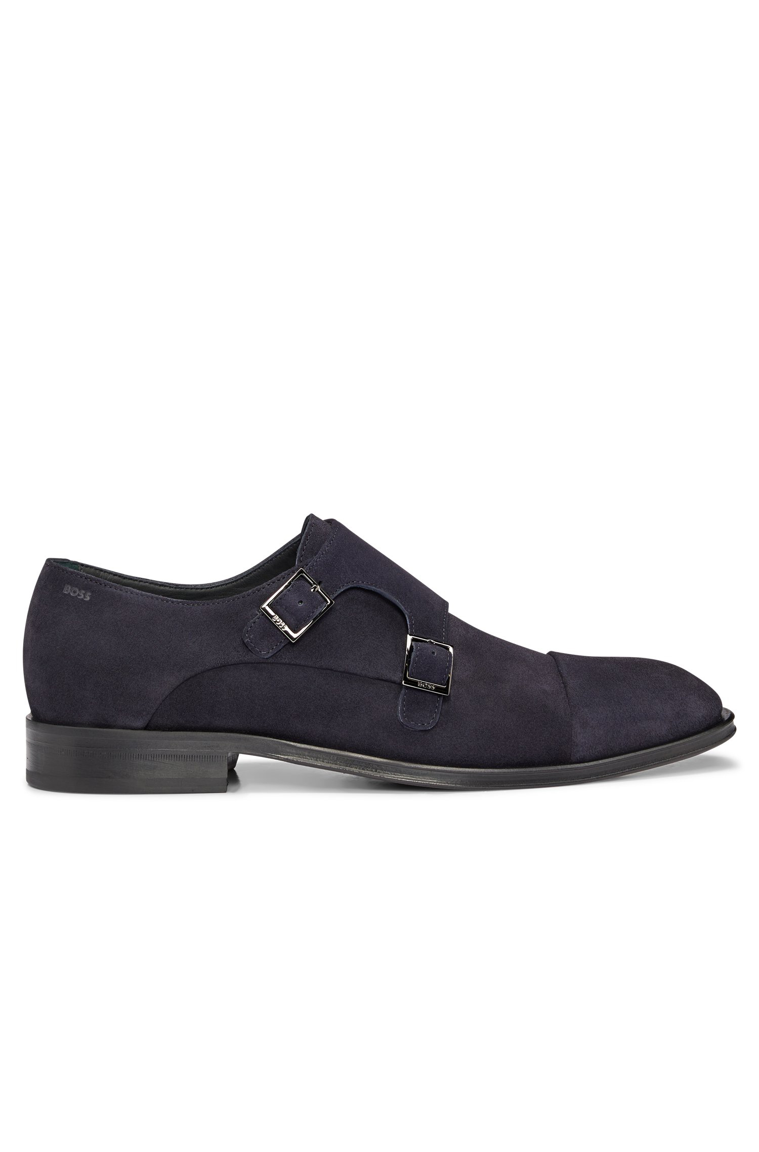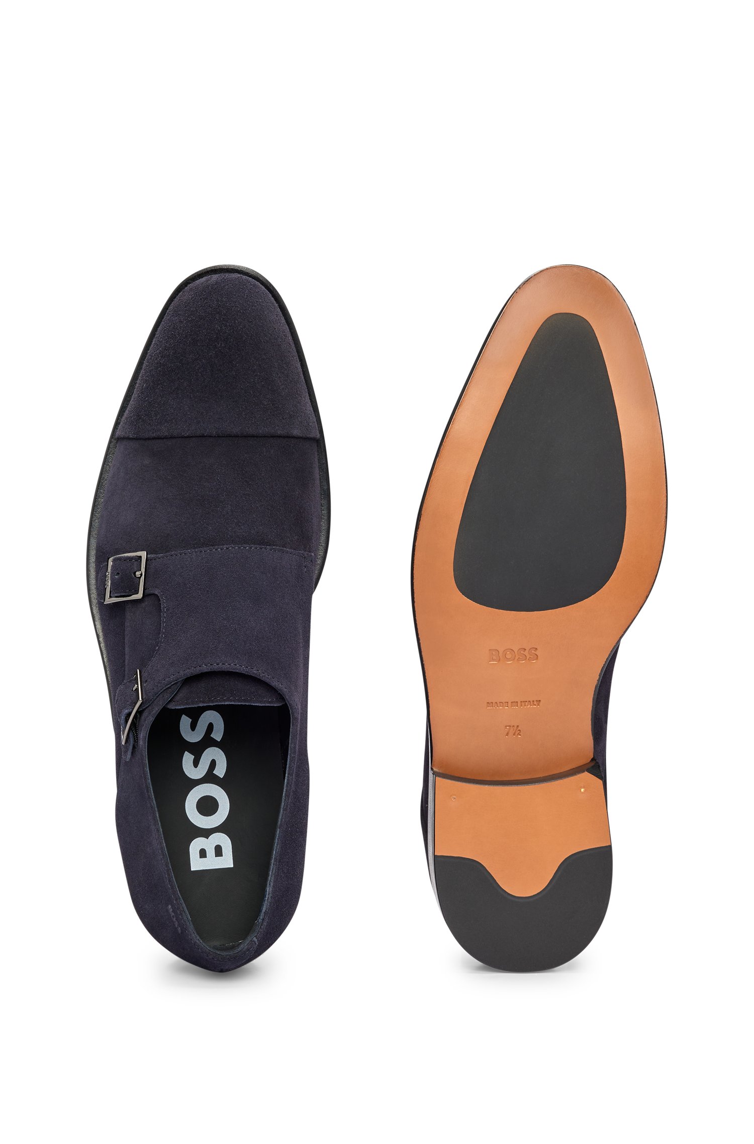 Doppelte BOSS Monkstraps aus Crosta-Leder mit Logo-Schnallen und Logo-Prägung.