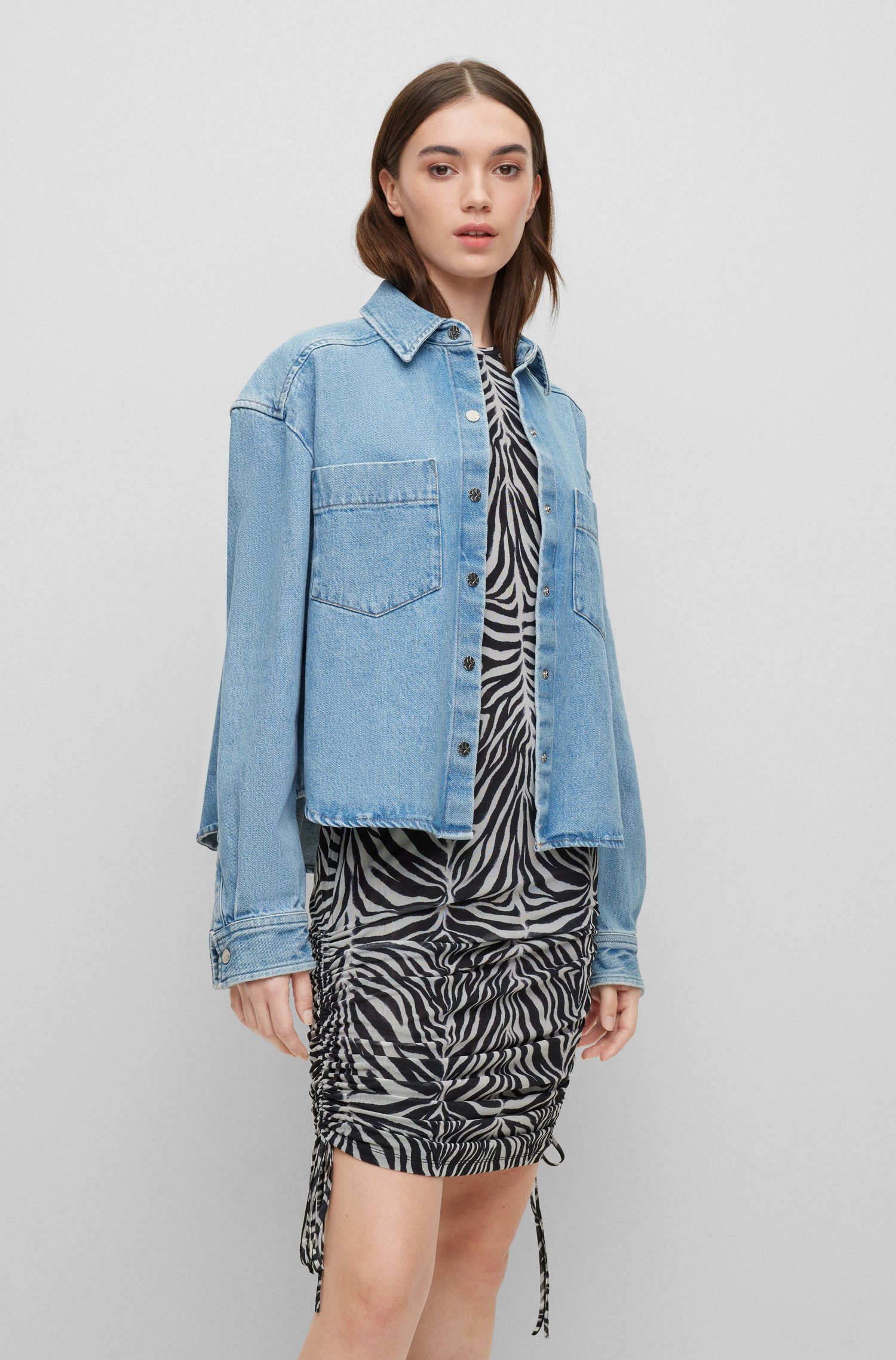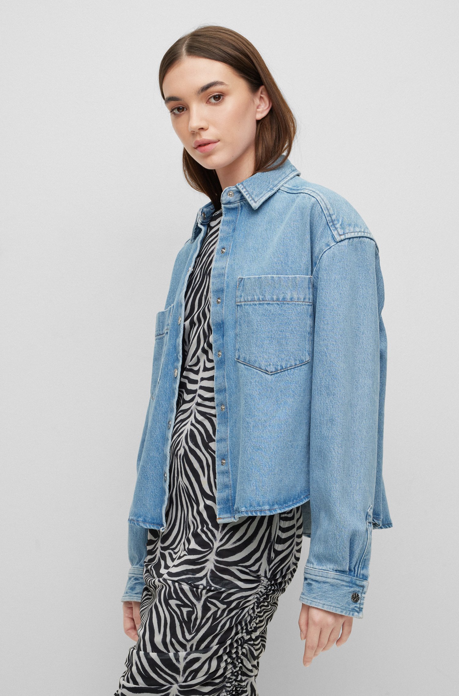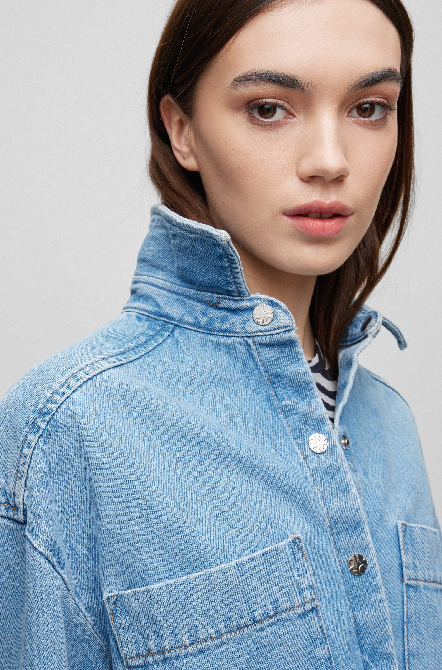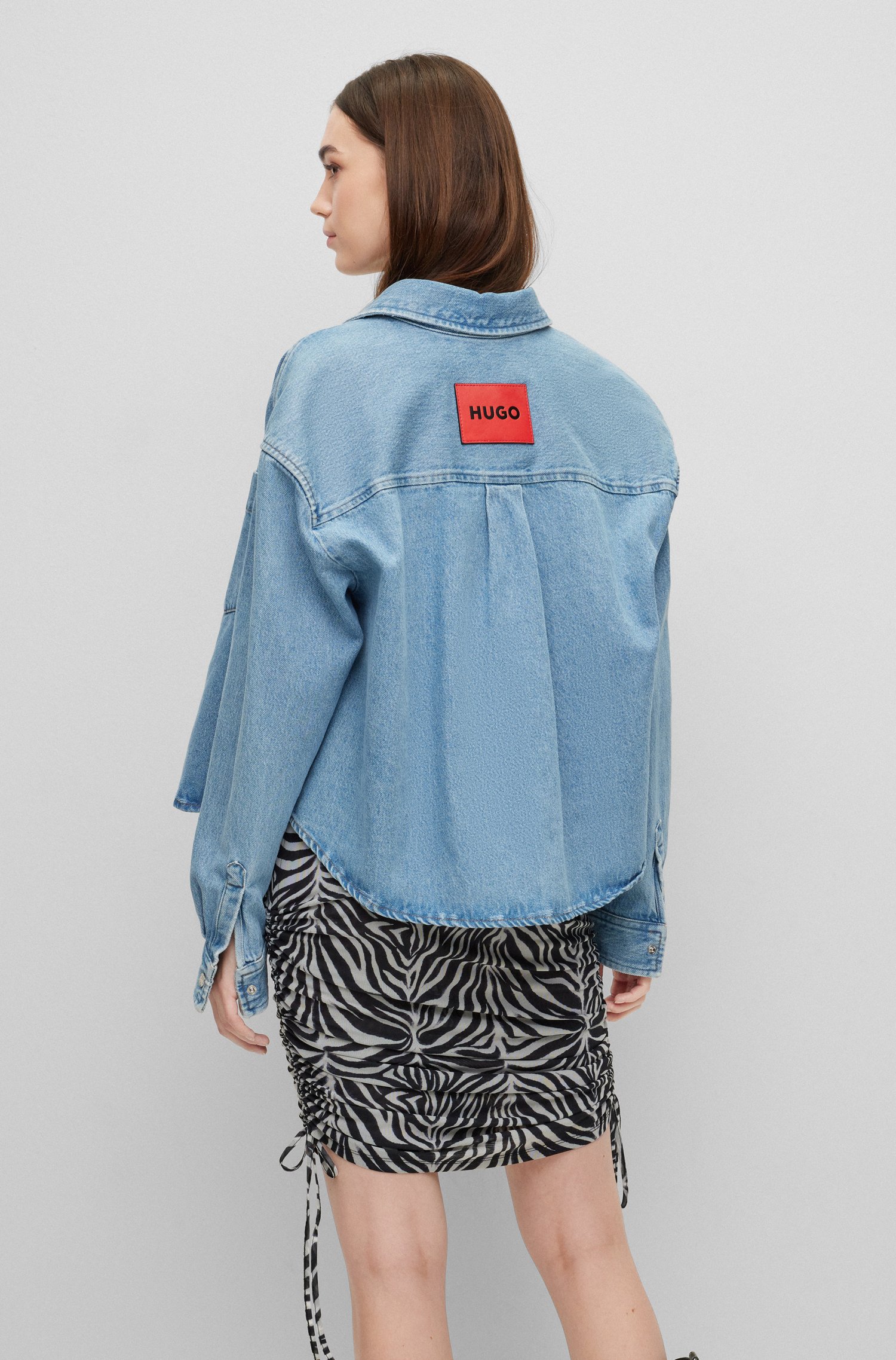 Locker geschnittene HUGO Damen-Bluse aus reinem Baumwoll-Denim mit aufgesetzten Taschen, Logo-Knöpfen und großem rotem Logo-Etikett.