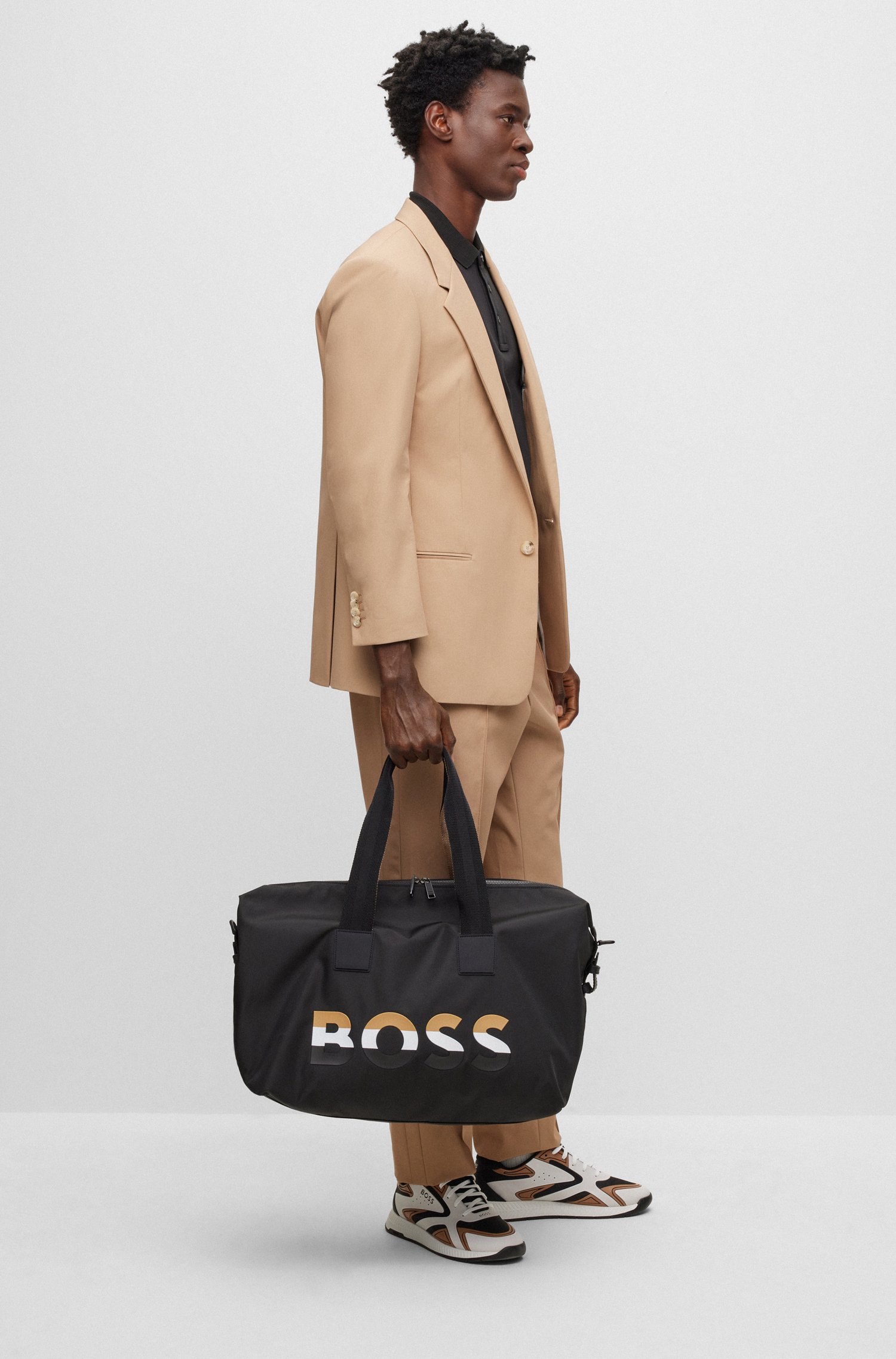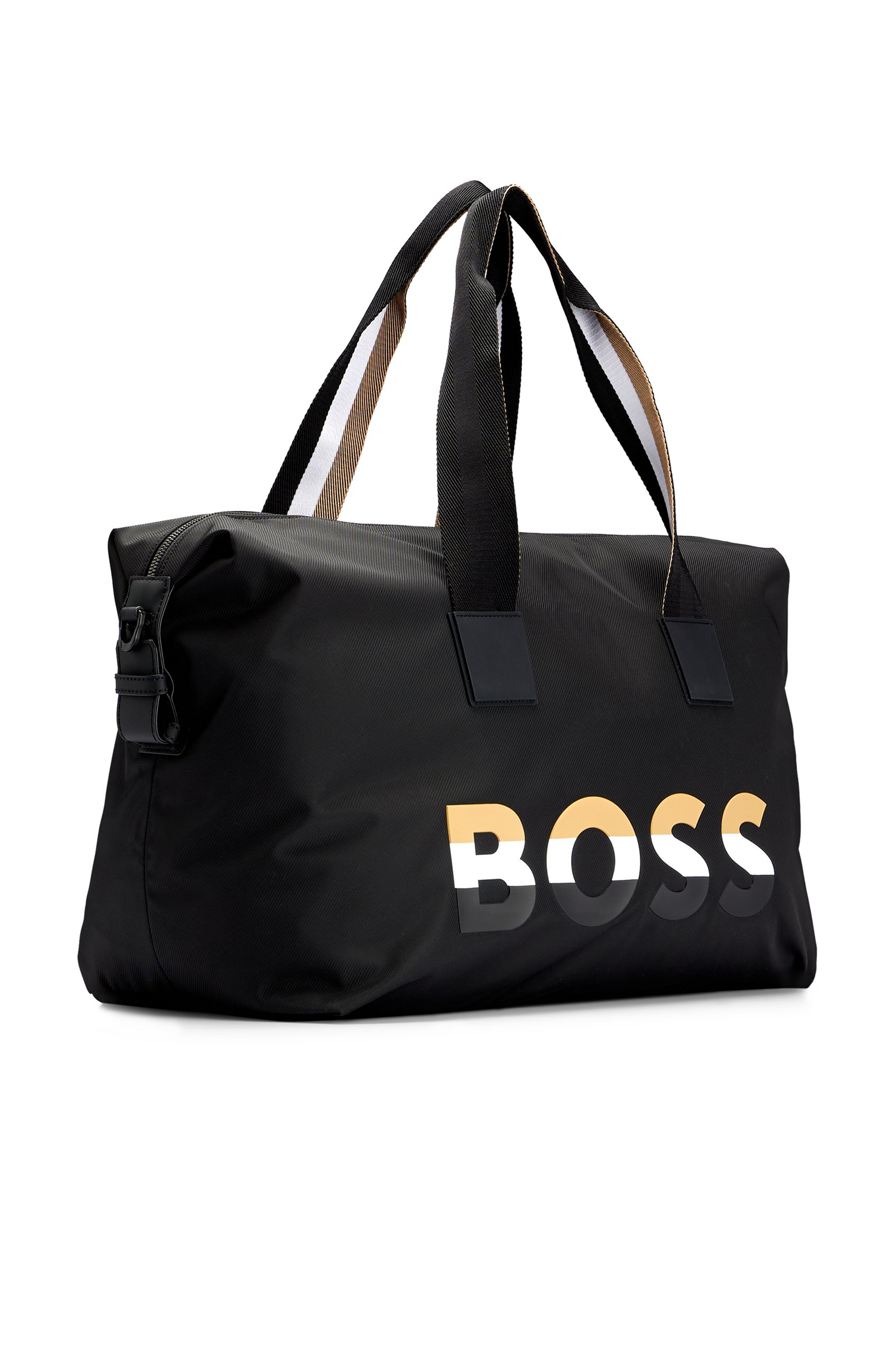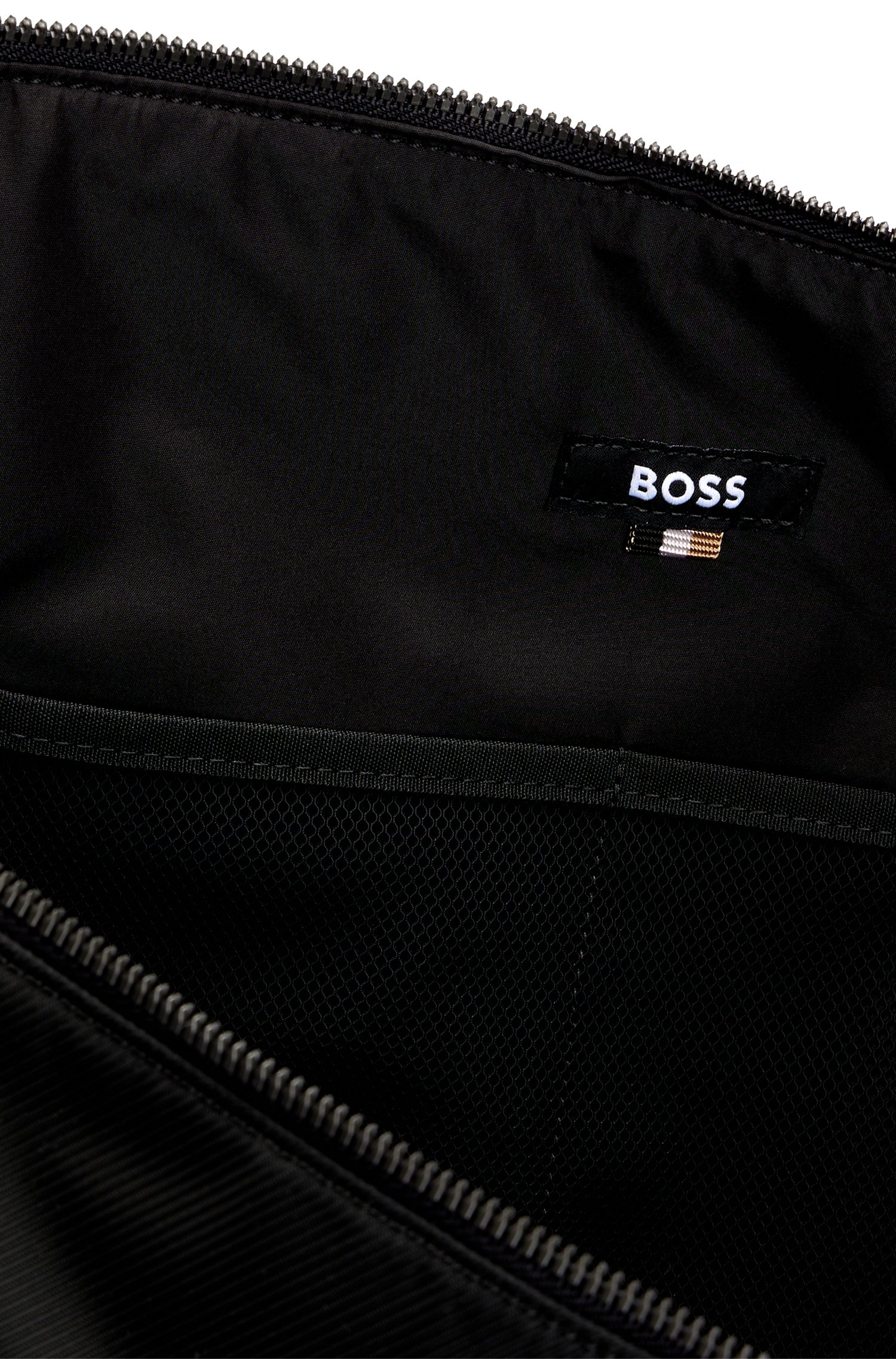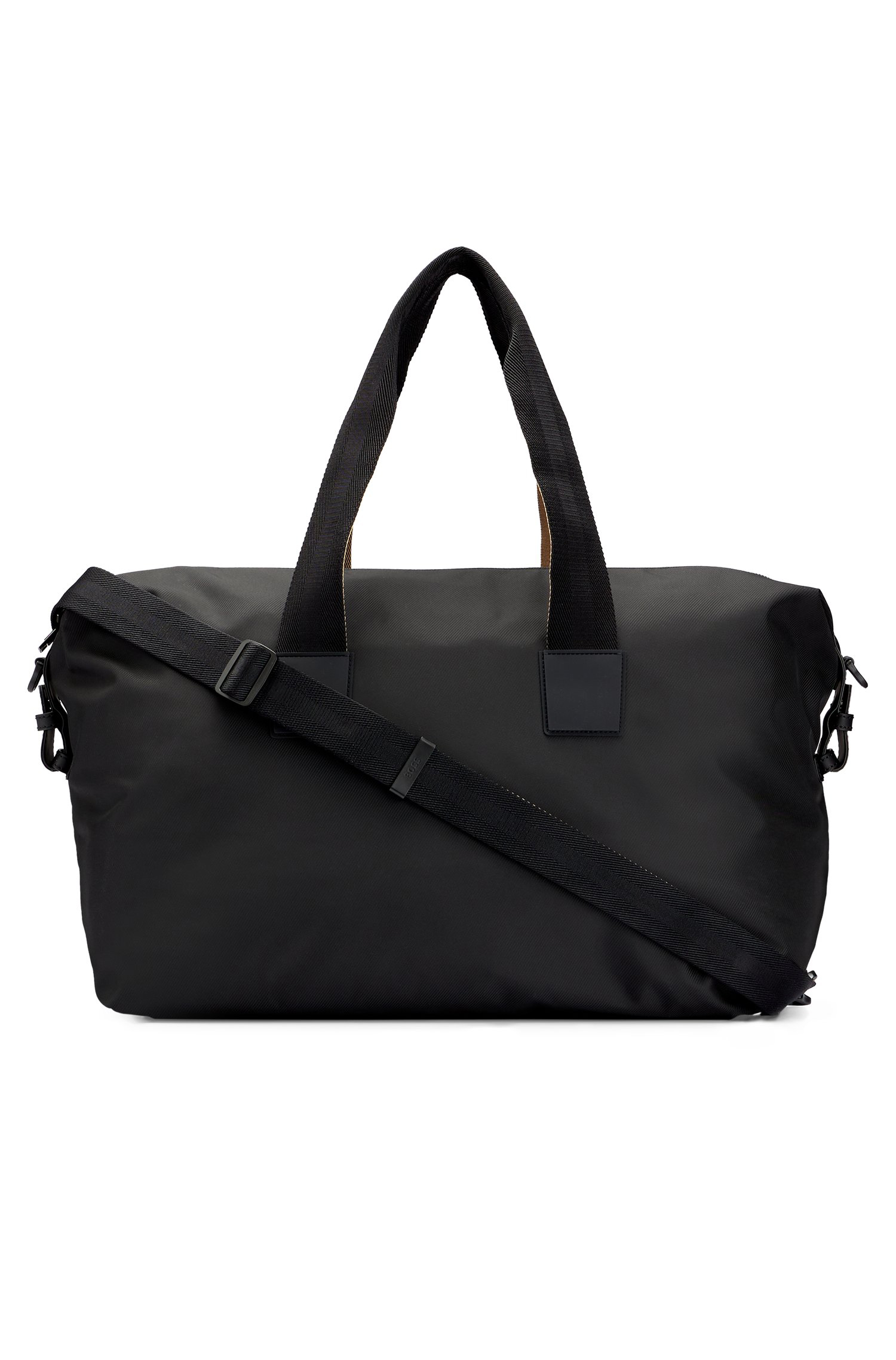 Geräumiger BOSS Weekender aus einem leichten Material-Mix mit charakteristischem Streifen-Riemen und Logo.