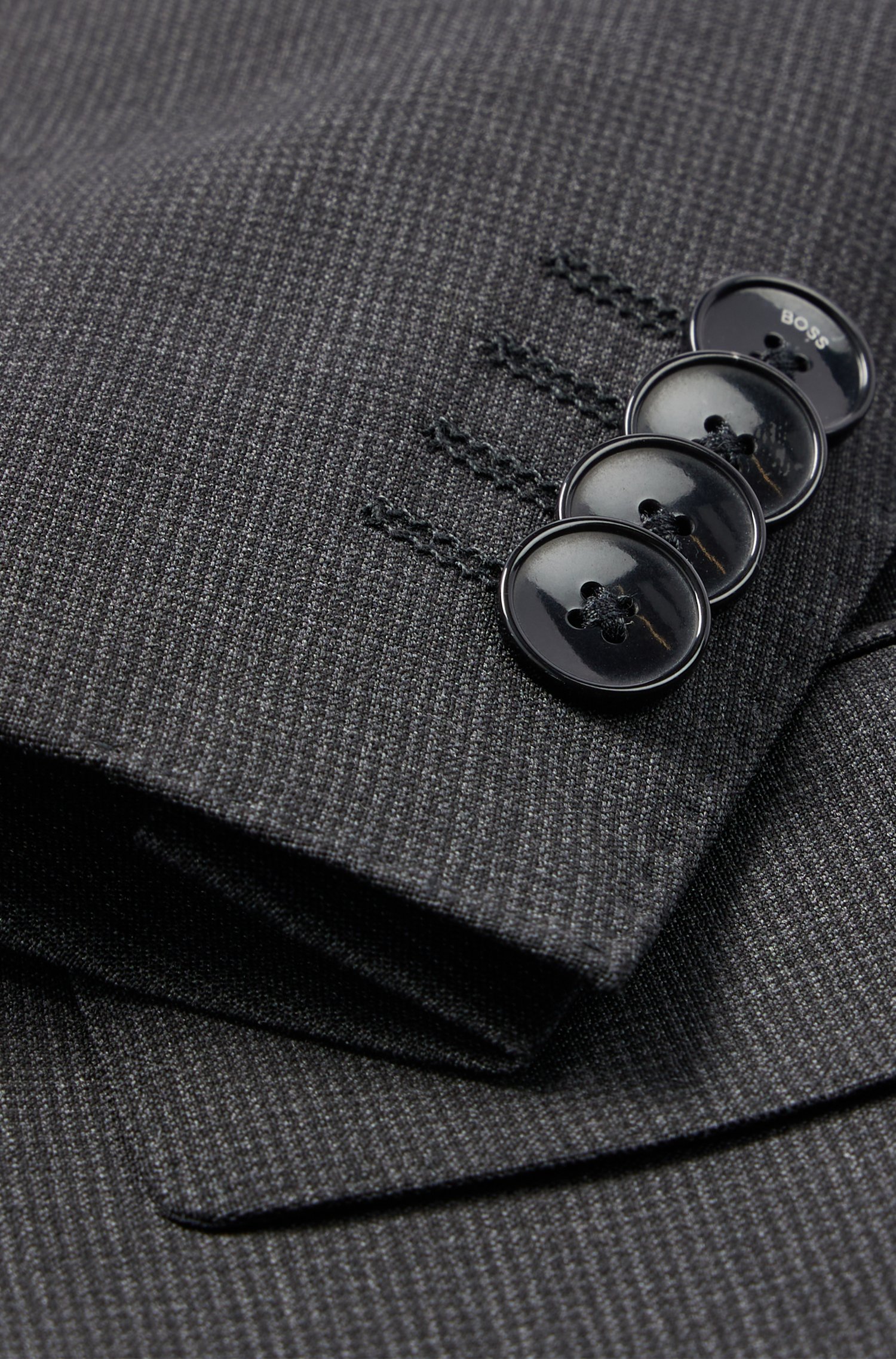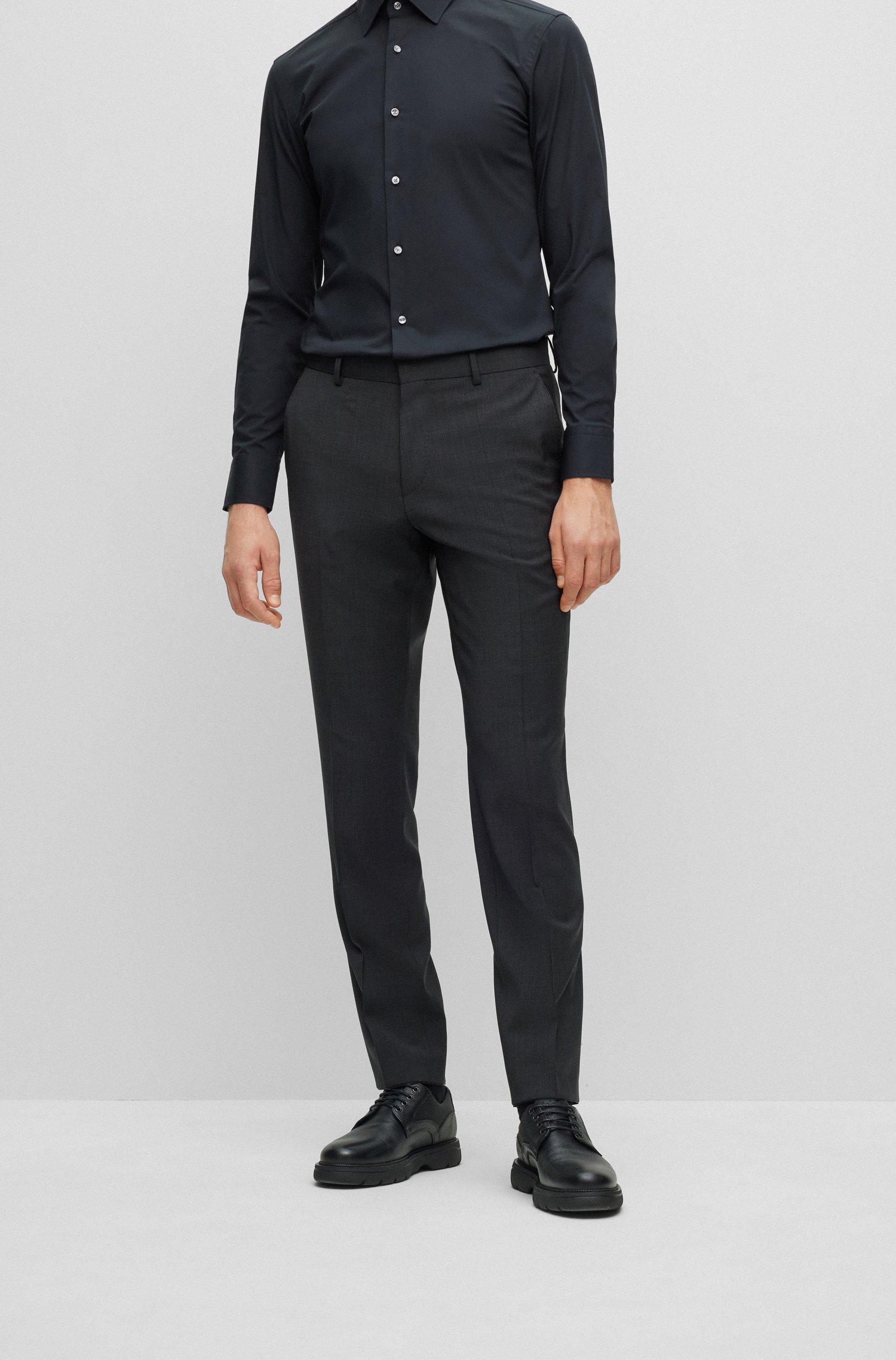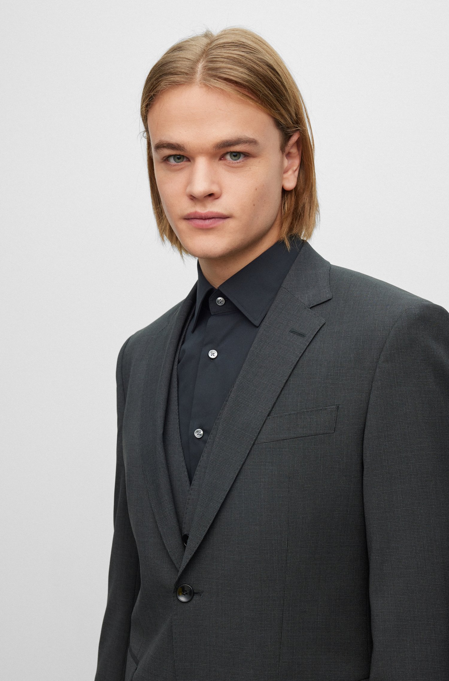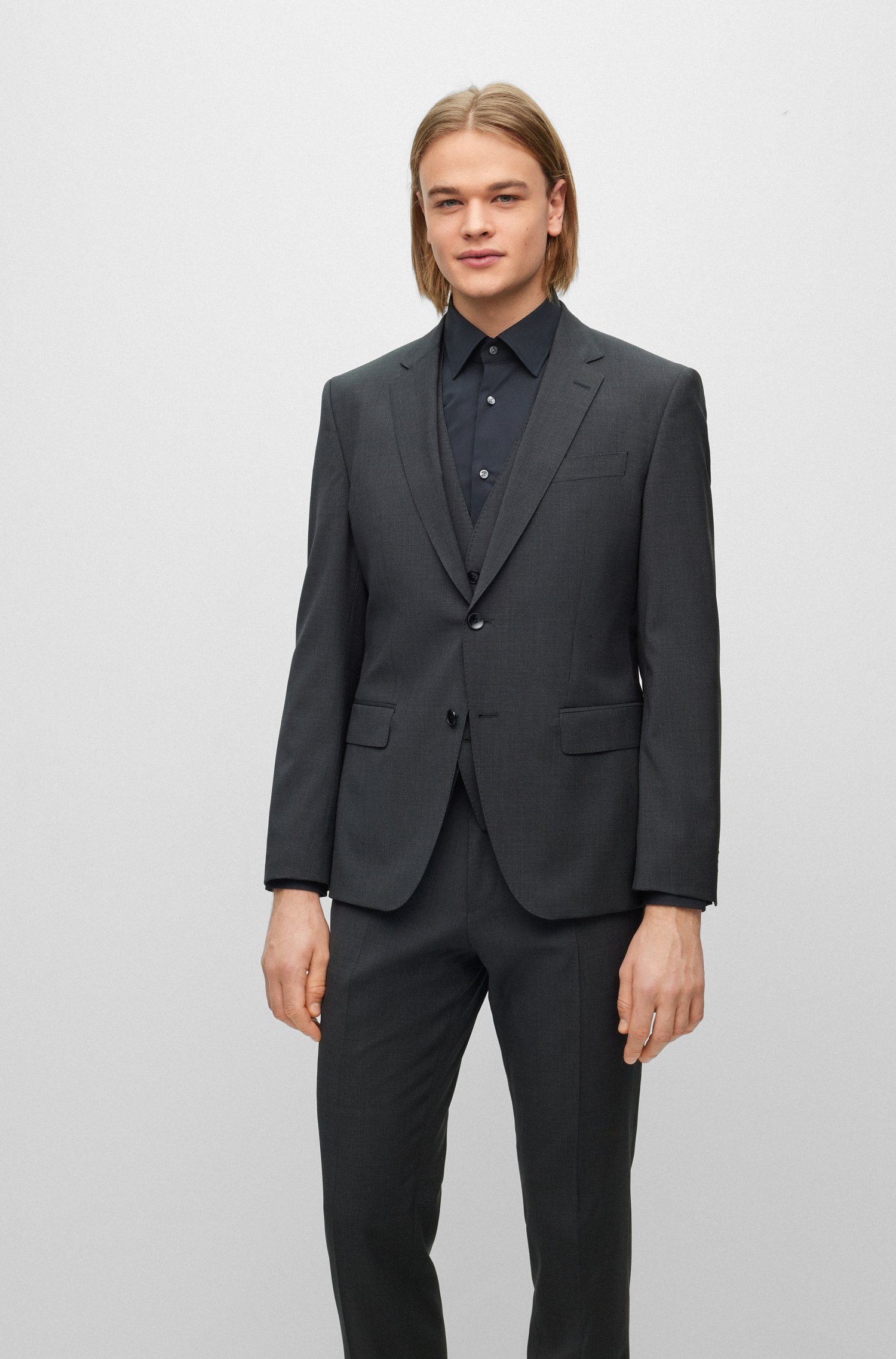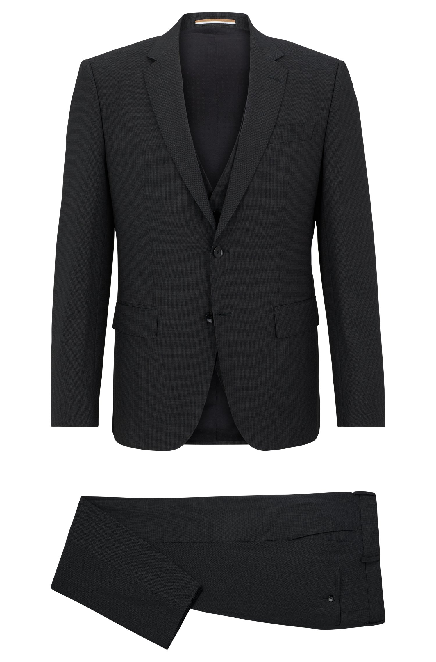 Zeitloser BOSS Anzug mit Weste. Der elegante Herren-Dreiteiler mit schmaler Passform ist aus natürlich elastischer Schurwolle gefertigt und lässt sich dank des filigranen Webmusters vielseitig kombinieren. Ein charakteristisches Innenfutter, Pattentaschen und ein fallendes Revers runden das Ensemble ab.