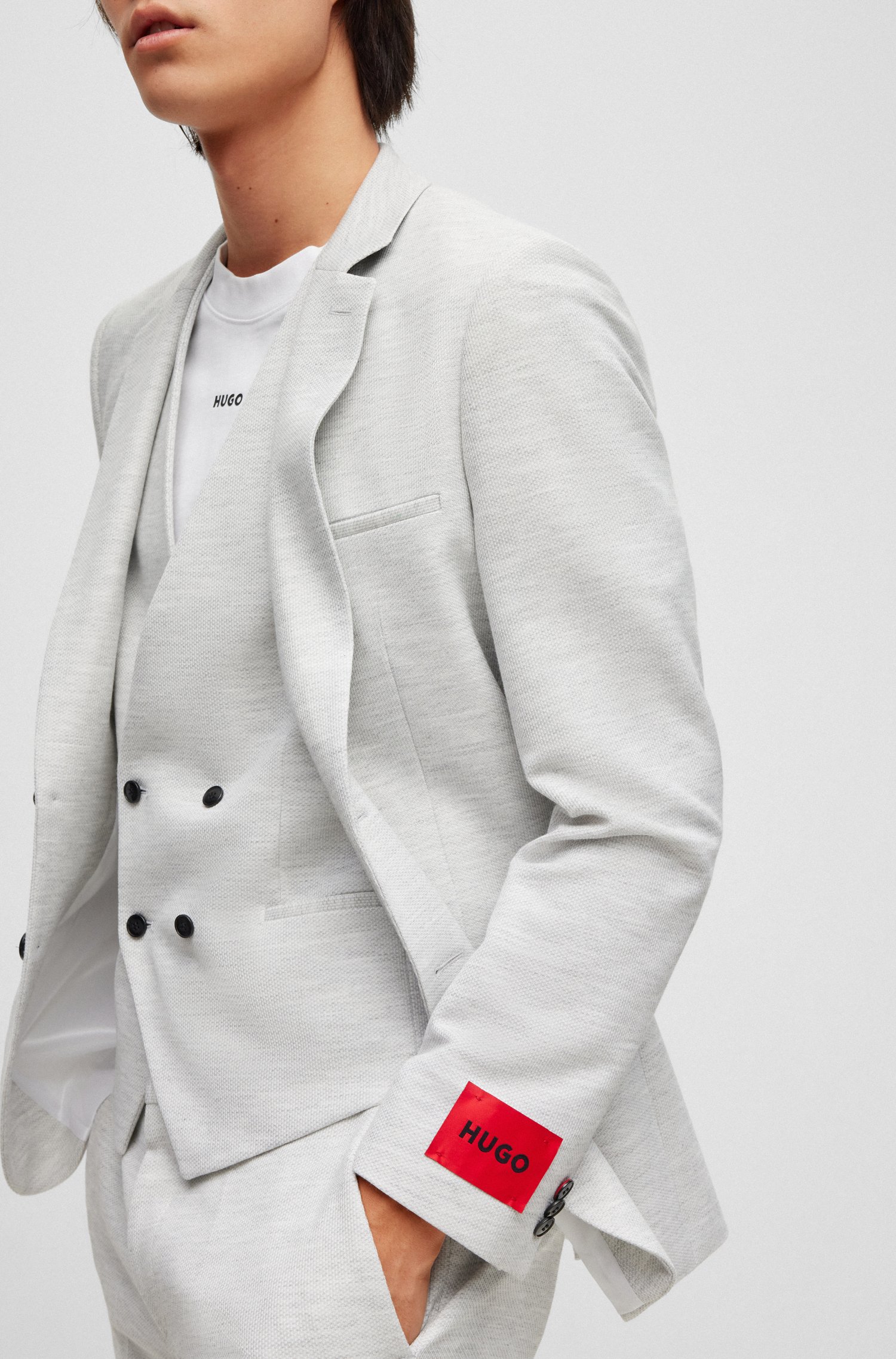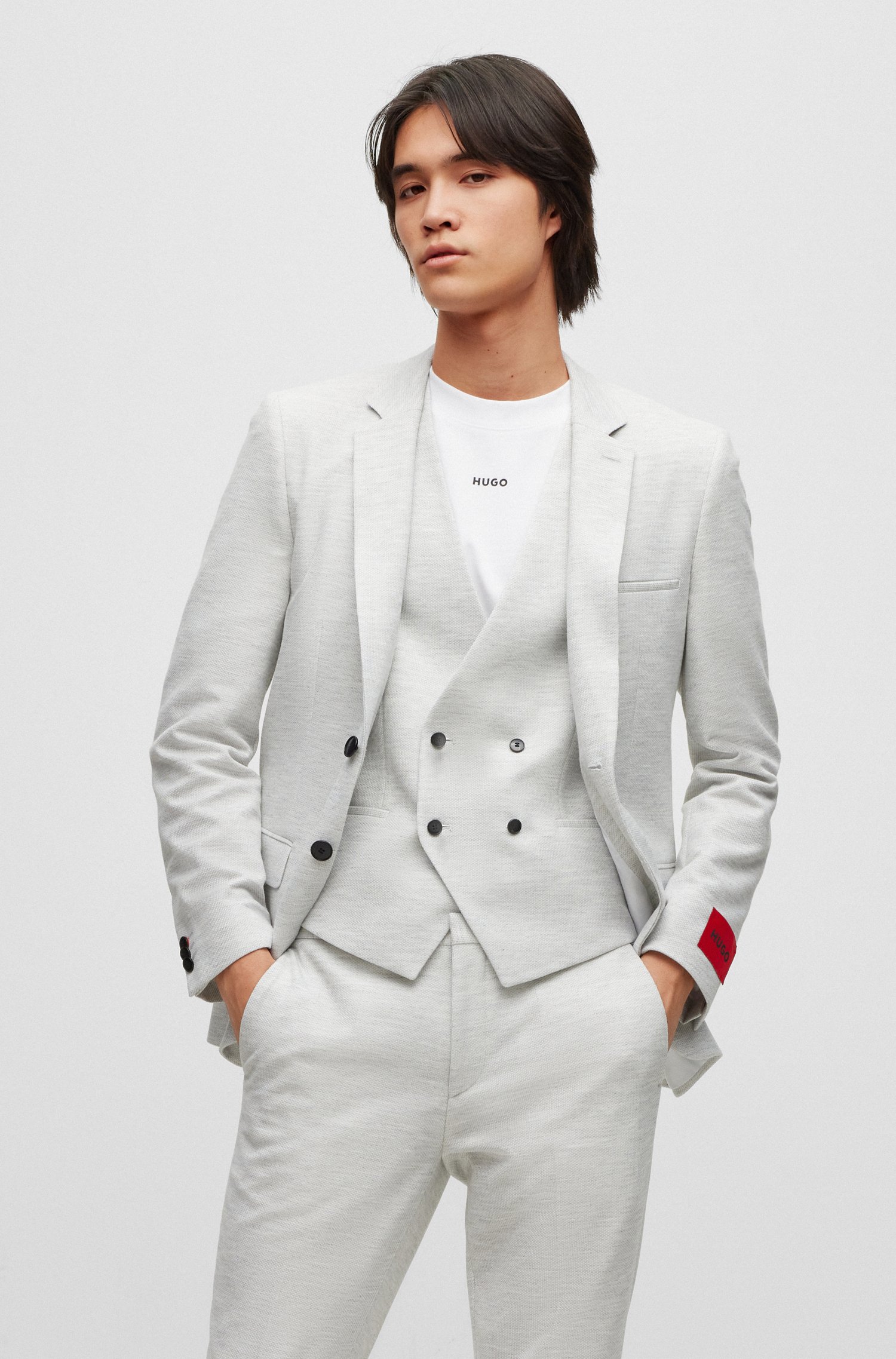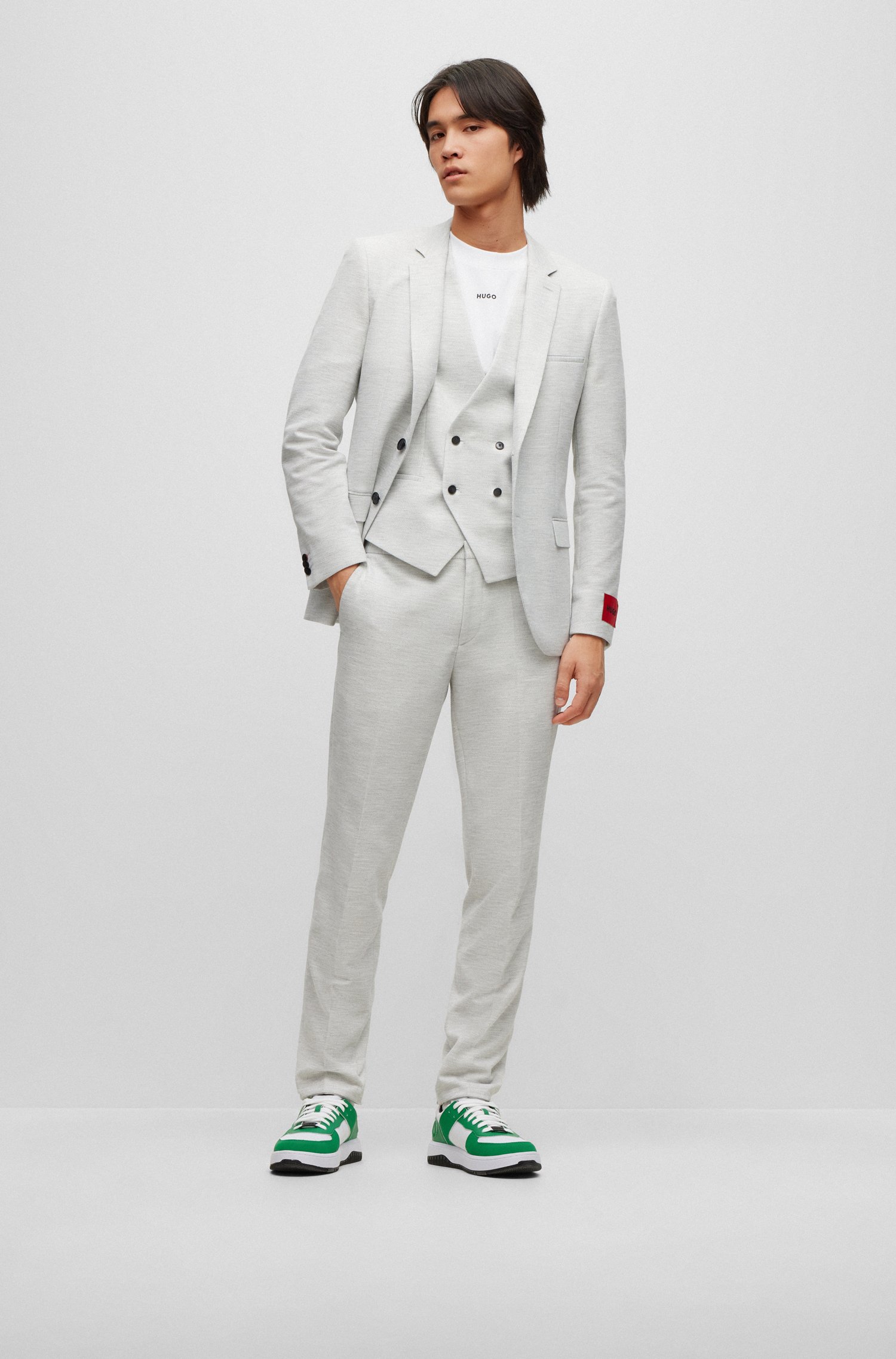 Verspricht optimale Performance: der HUGO Dreiteiler. Der melierte Herren-Anzug aus einem besonders flexiblen Gewebe bietet hohen Tragekomfort. Seine extra schmale Passform erzeugt eine cleane Silhouette. Die zweireihige Weste sorgt für einen innovativen Touch.