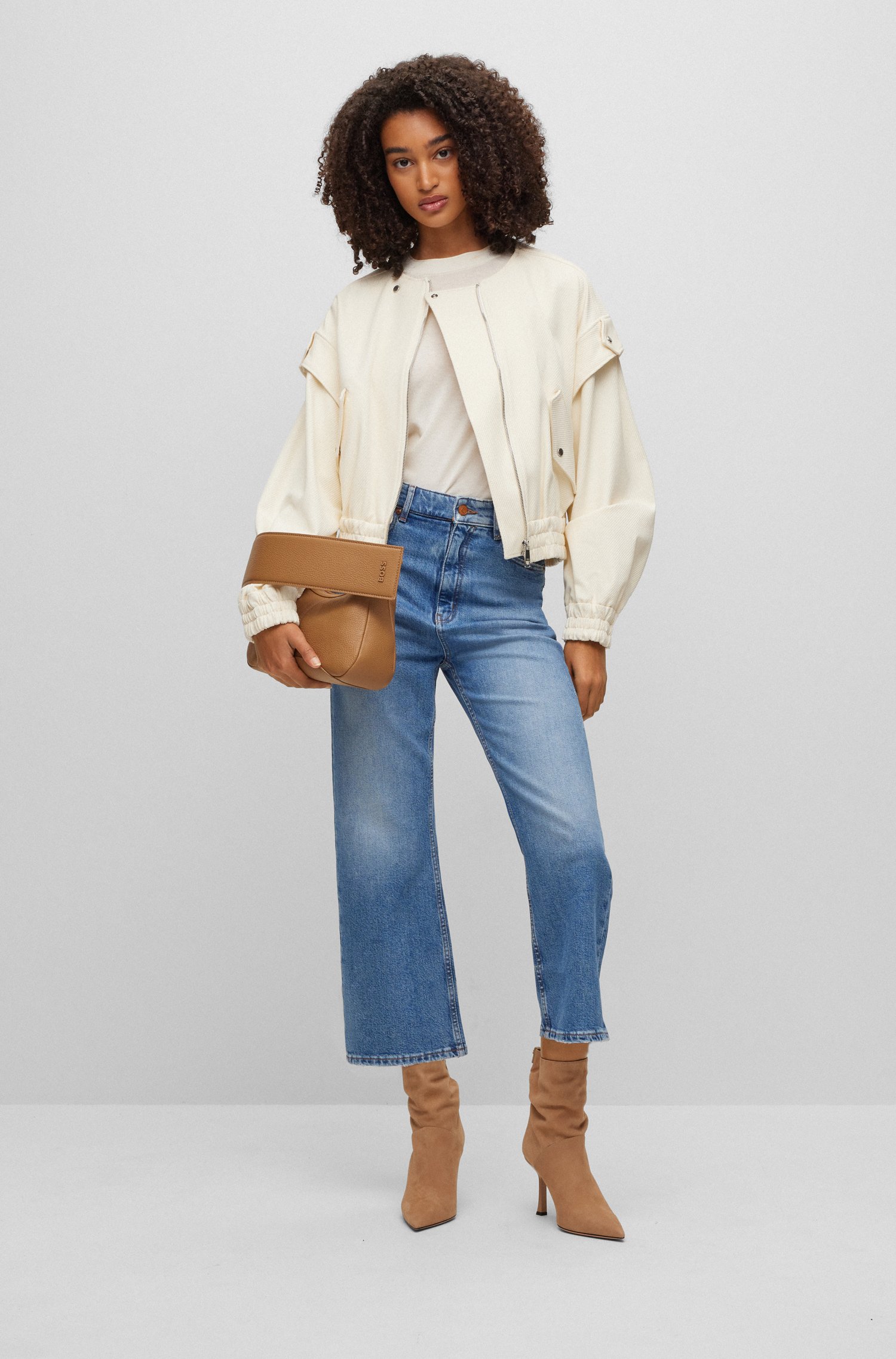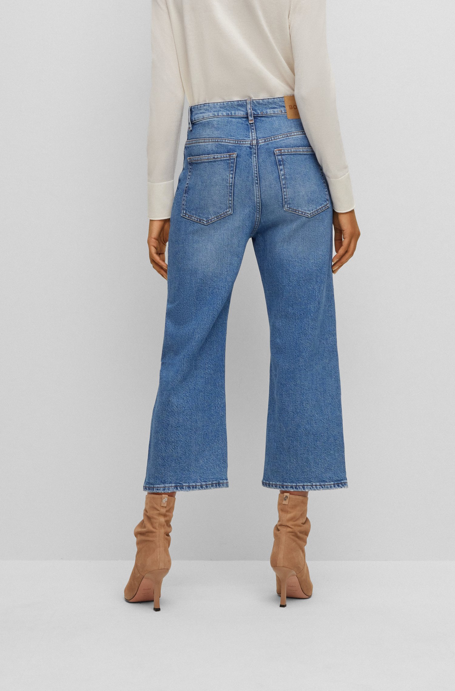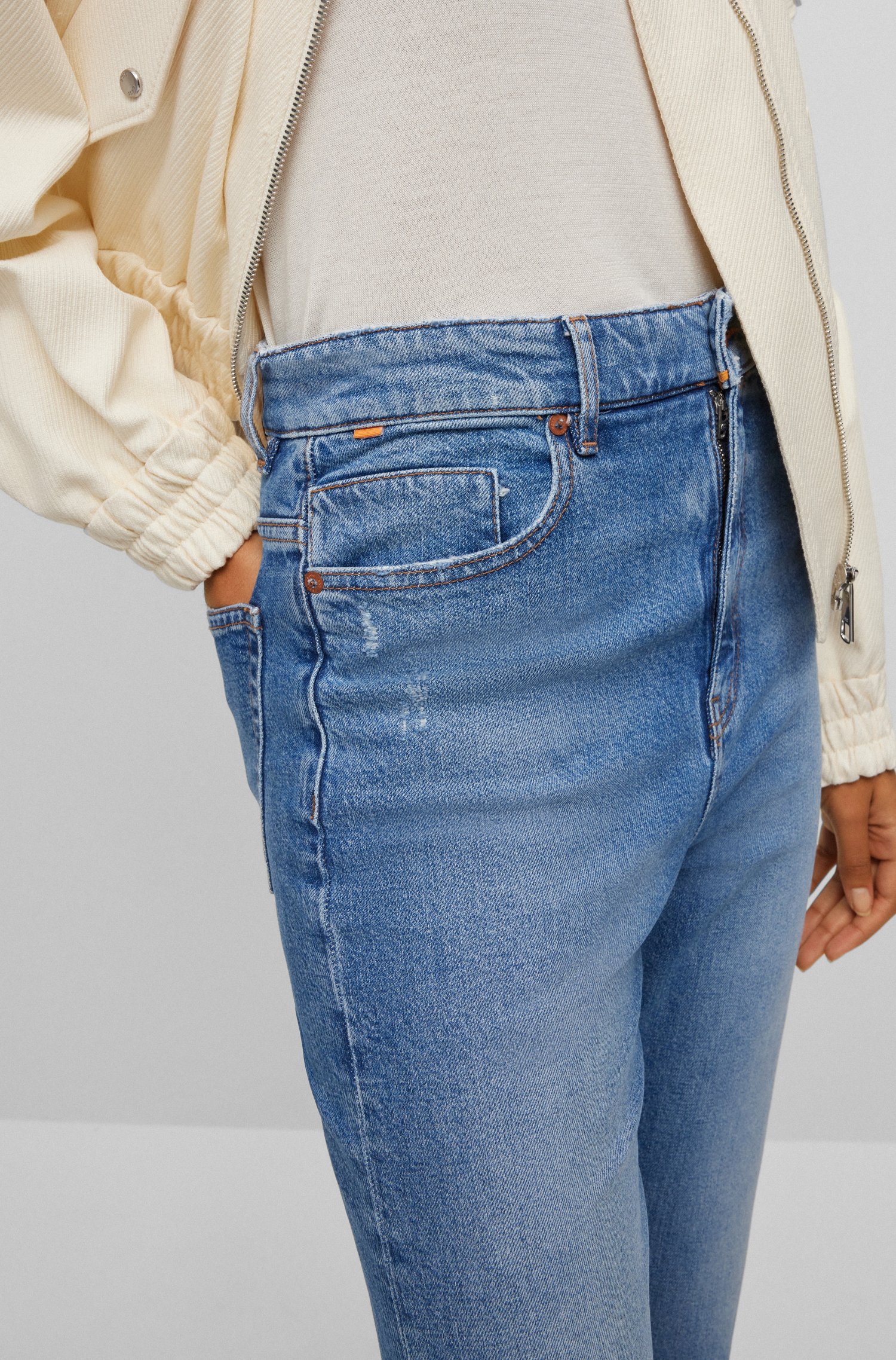 Blaue BOSS Damen-Jeans aus bequemem Stretch-Denim mit hohem Bund, Cropped-Länge und unversäuberten Säumen.