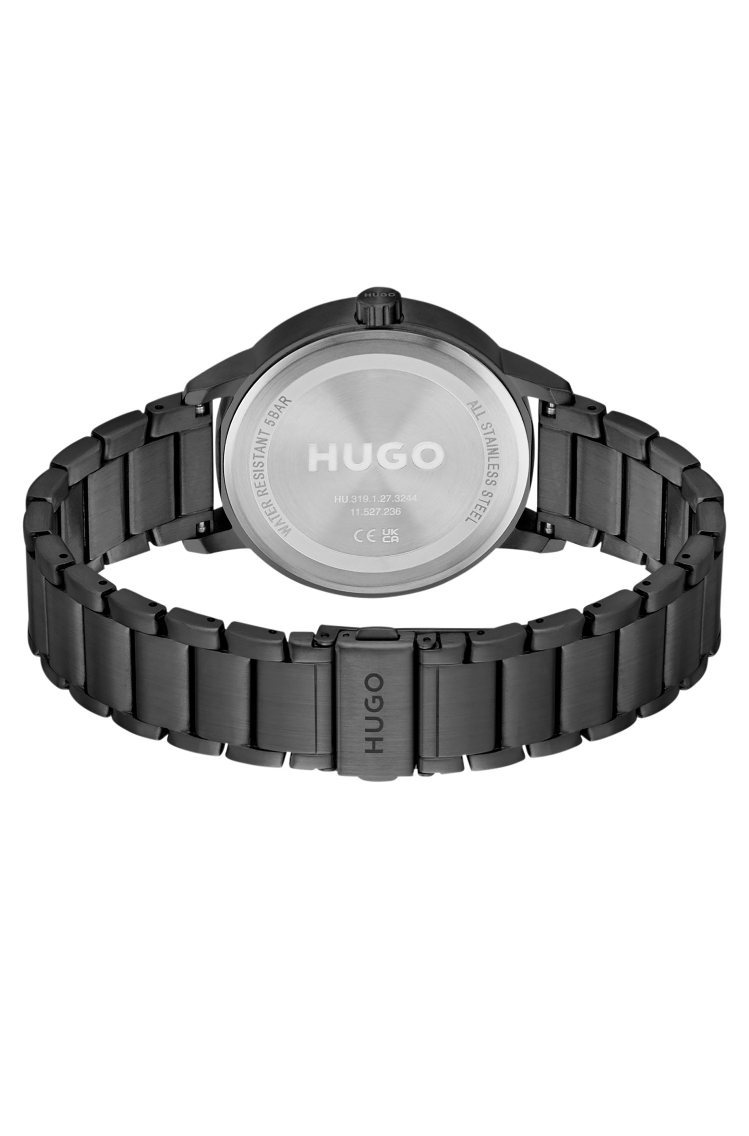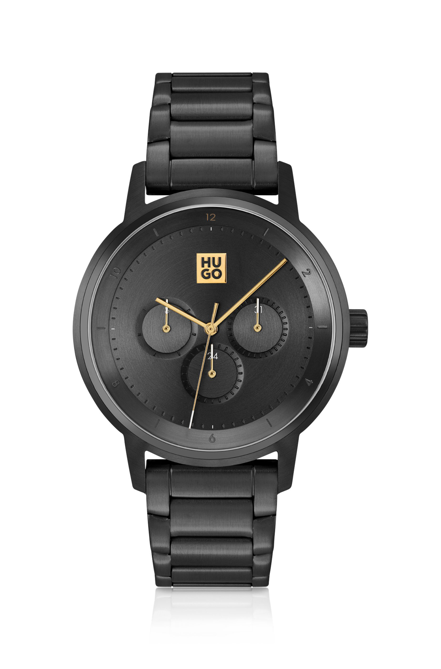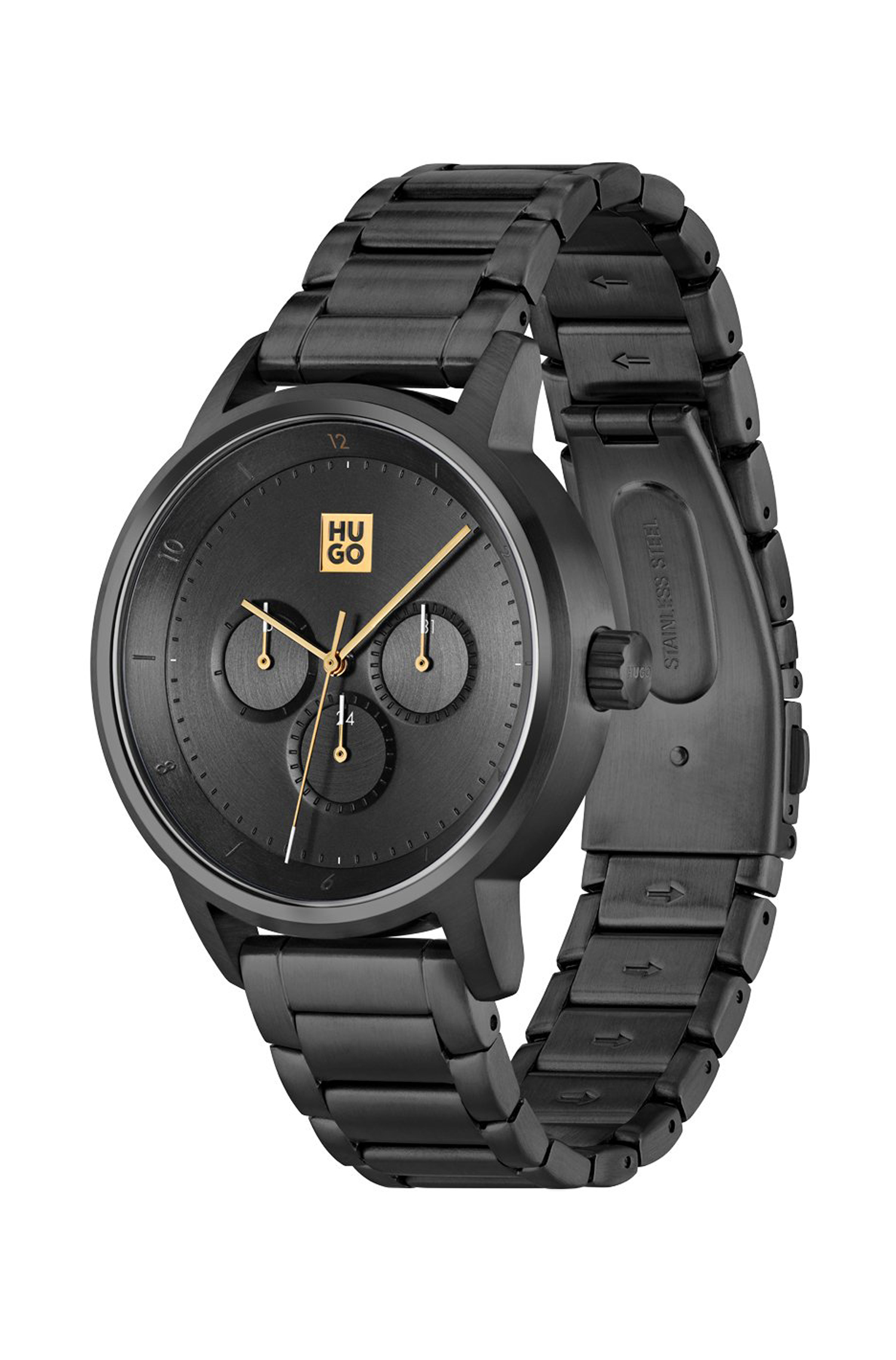Markante HUGO Uhr mit Gliederarmband. Das cleane Herren-Accessoire aus Edelstahl mit schwarz beschichtetem Finish hat ein tonales mehrlagiges Zifferblatt mit drei Subeyes und einen Reflektorring mit Indizes und Ziffern. Ein Stack-Logo auf dem Zifferblatt sorgt für den charakteristischen HUGO Flair.