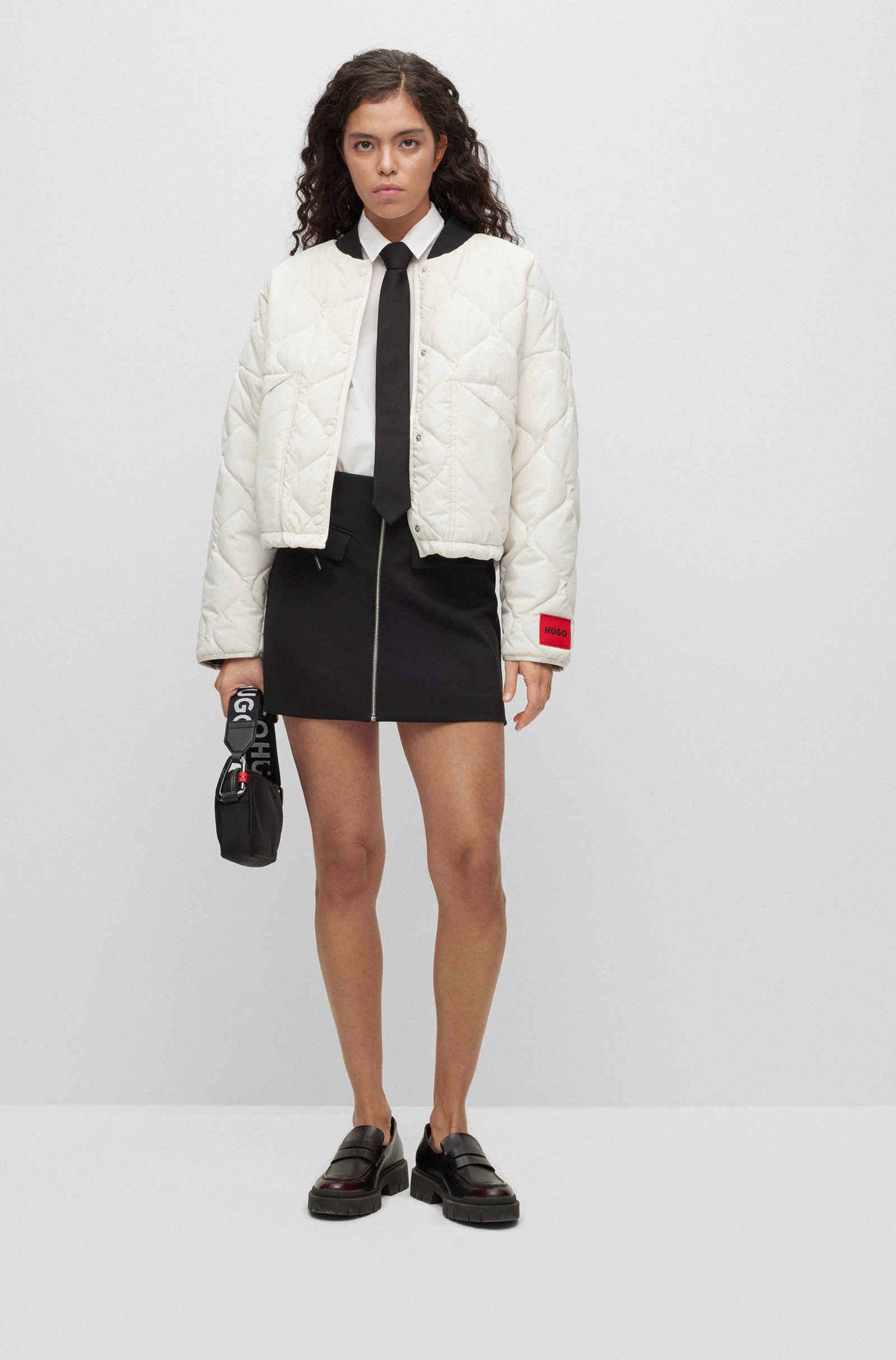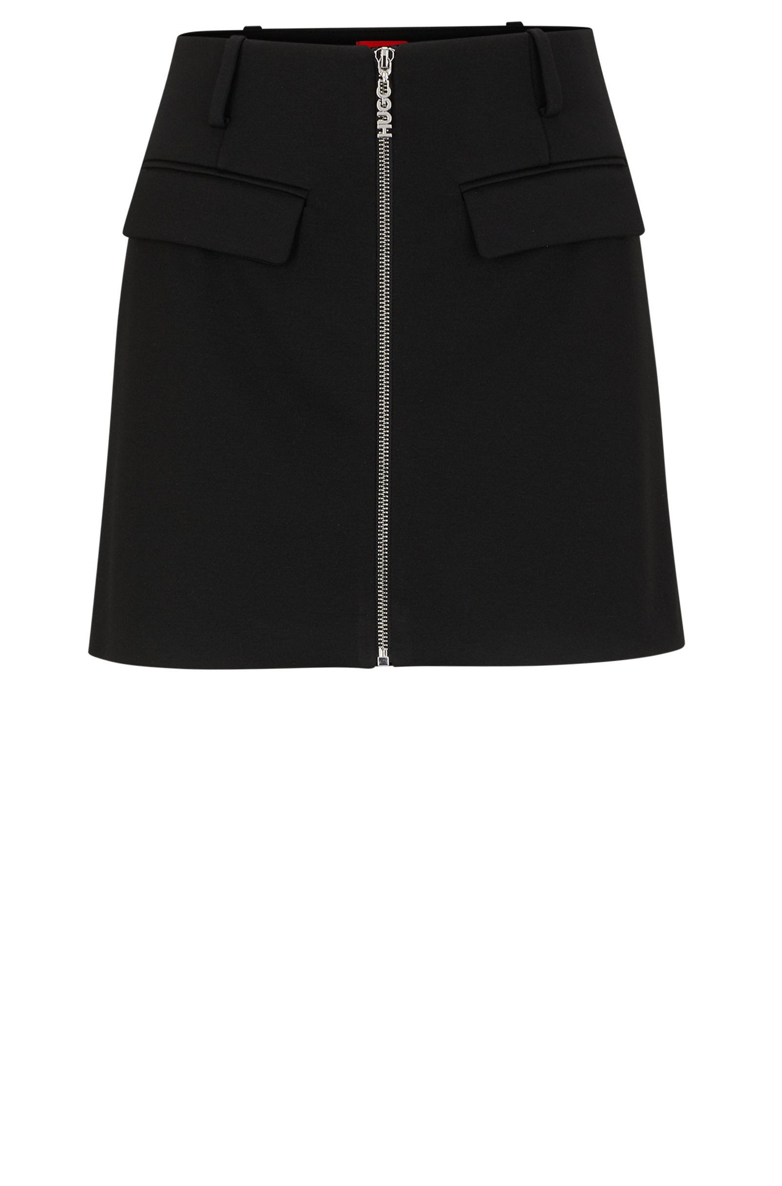 Vielseitig kombinierbarer HUGO Damen-Minirock aus Stretch-Jersey mit hohem Bund und einem Reißverschluss mit Logo-Zipper auf der Vorderseite.