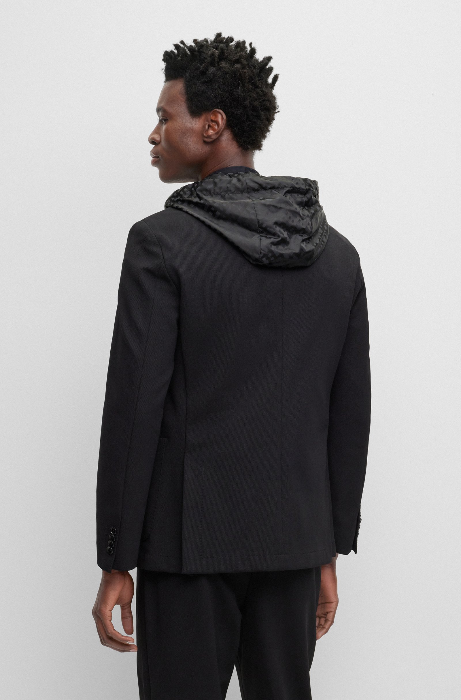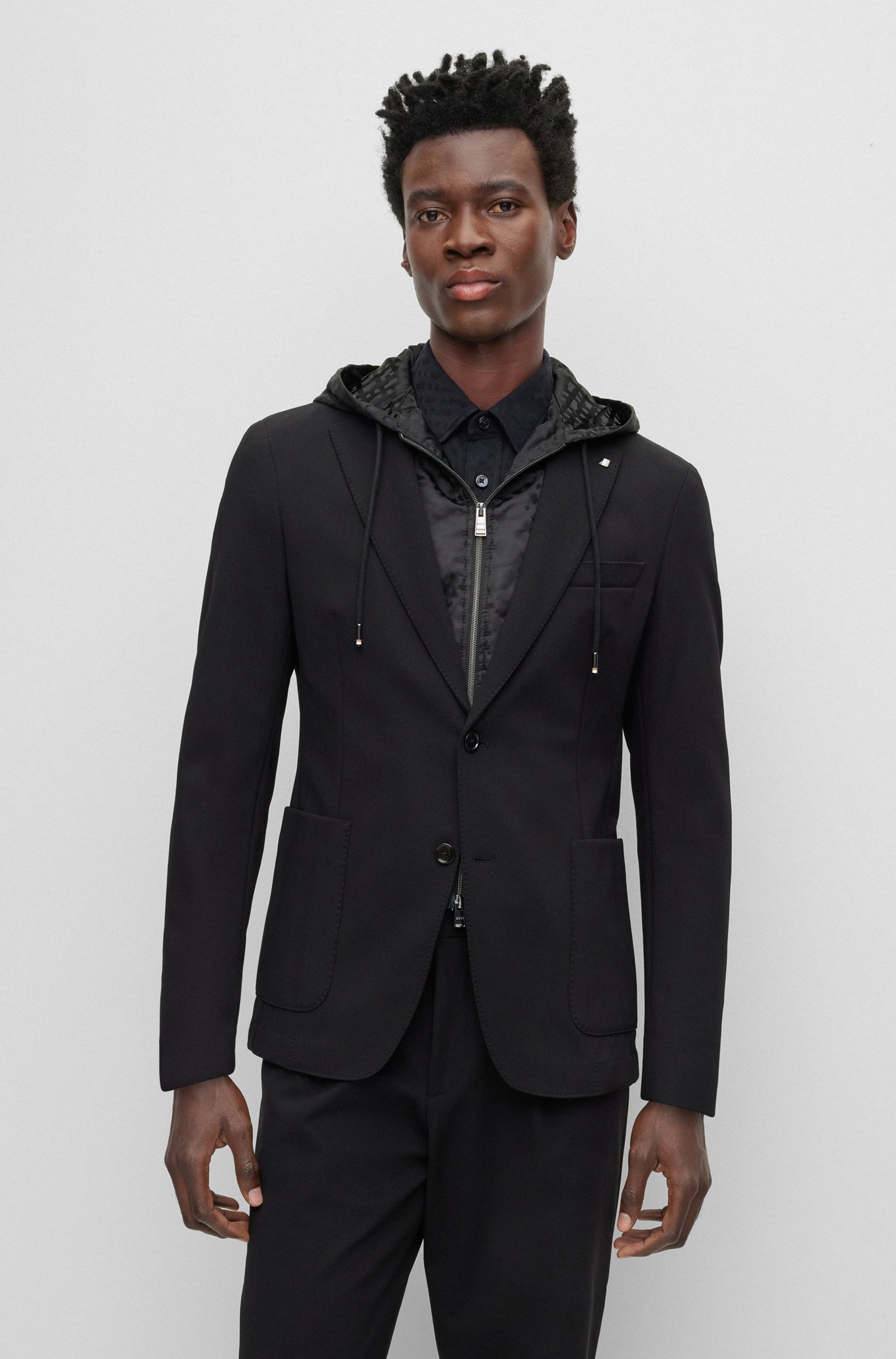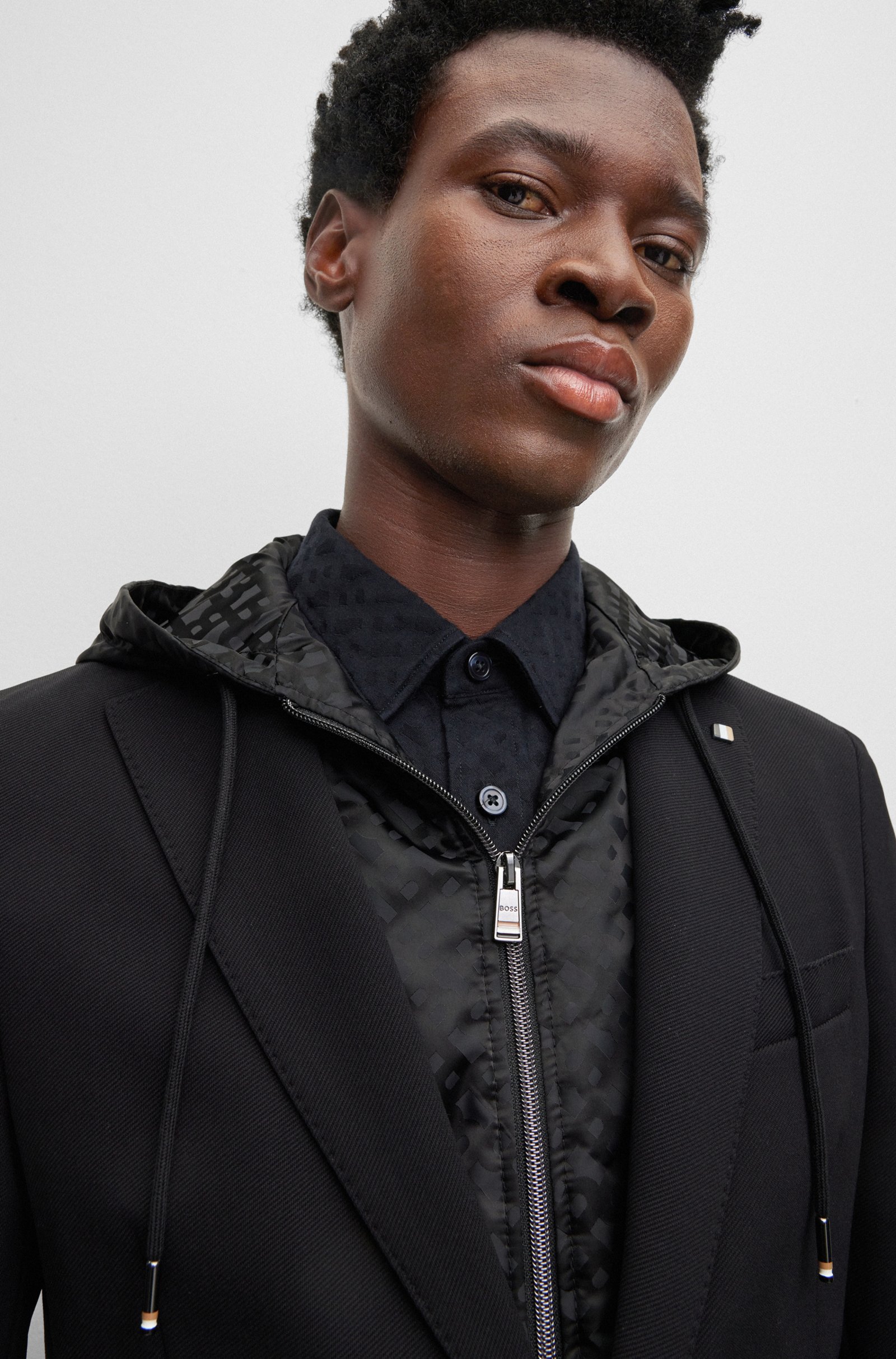 Vielseitig kombinierbares BOSS Herren-Sakko aus besonders elastischem Jersey mit schmaler Passform und einer integrierten Kapuze mit Monogramm-Print. Dieses sportliche Sakko wurde außerdem für den aktuellen Look der Spieler von RB Leipzig ausgewählt.