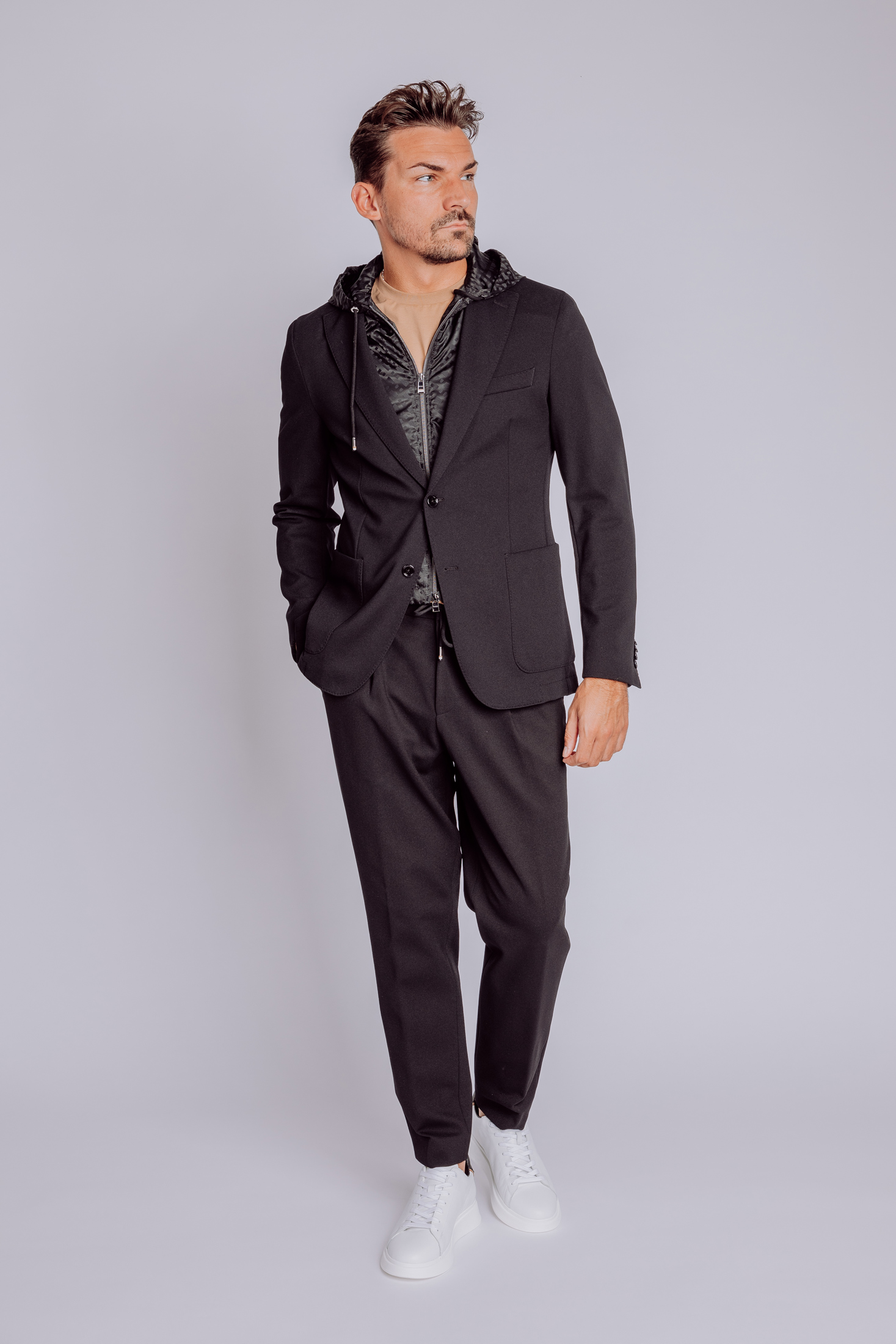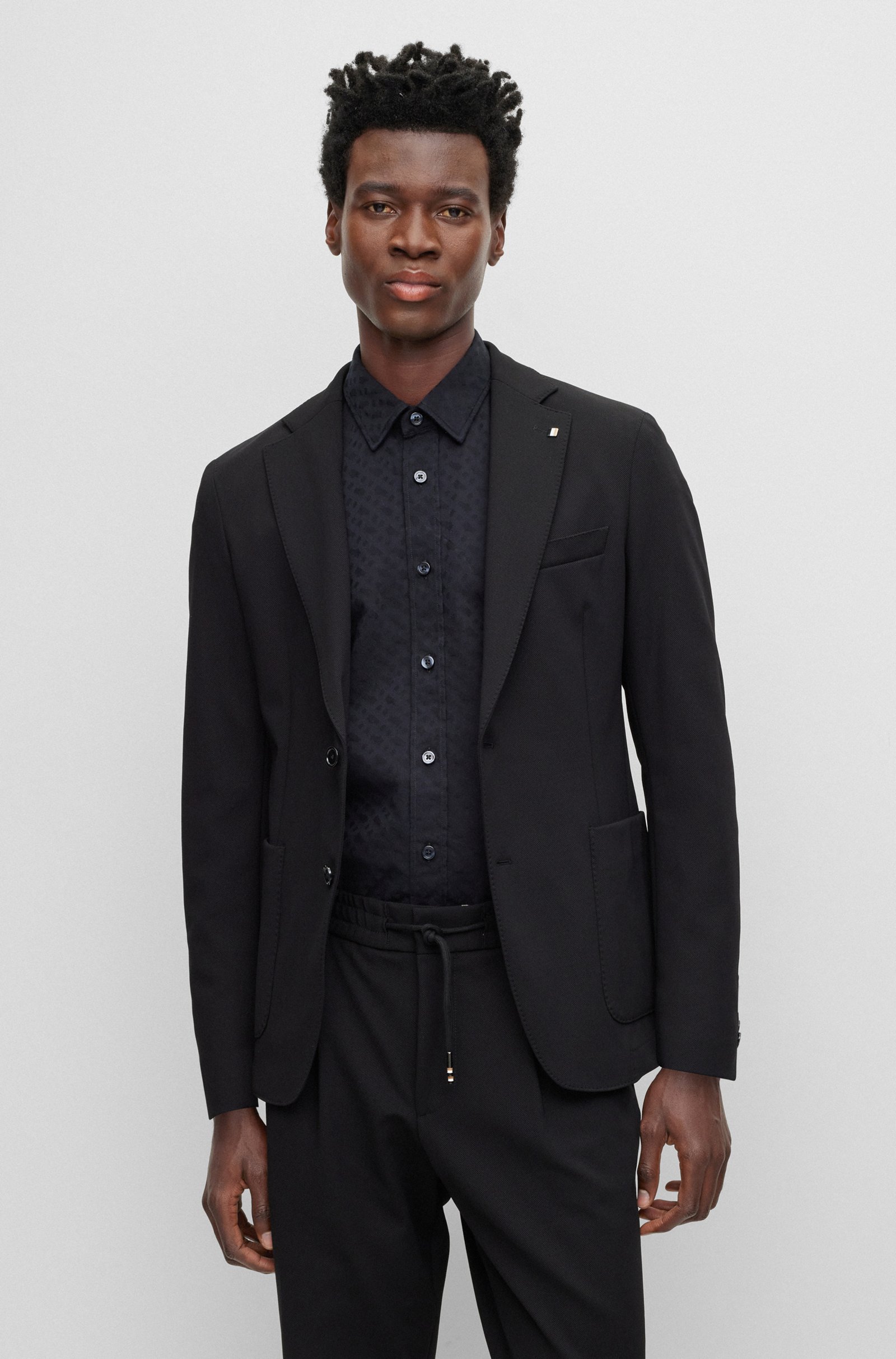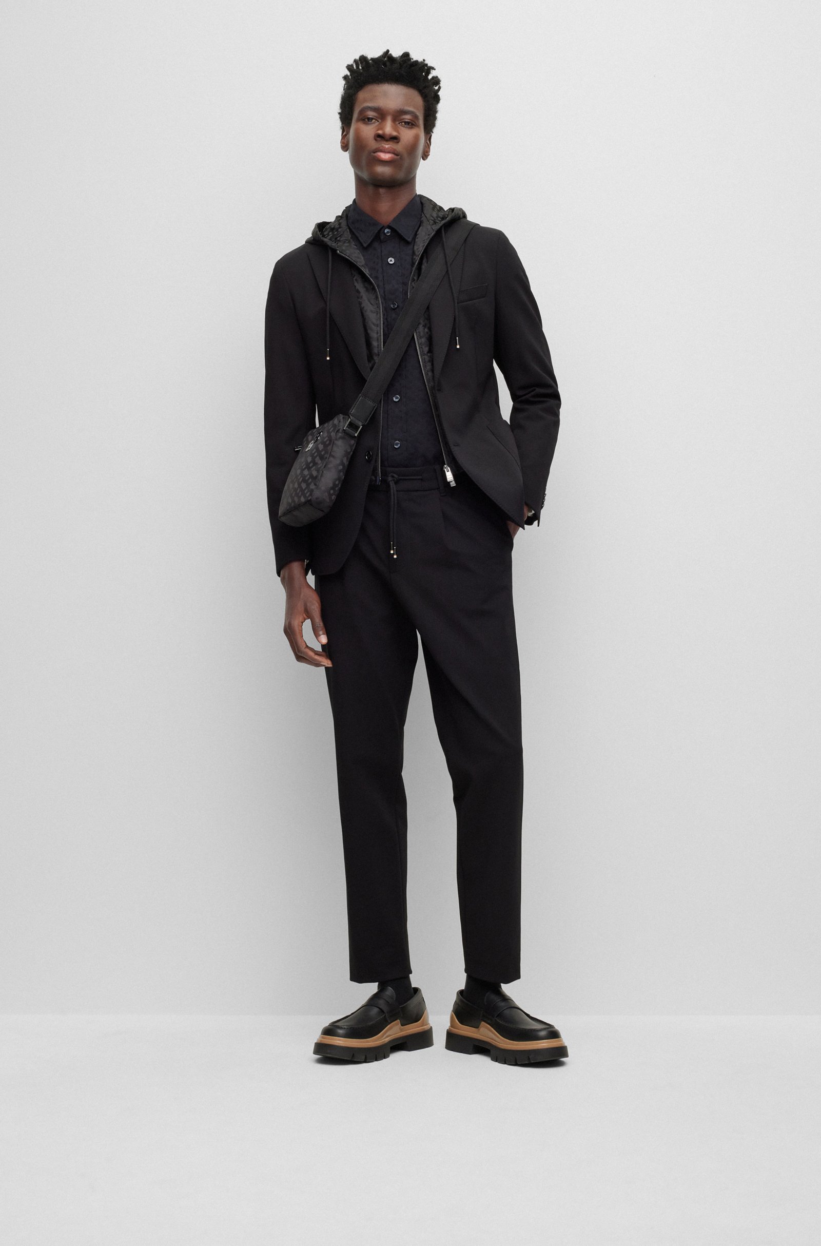 Vielseitig kombinierbares BOSS Herren-Sakko aus besonders elastischem Jersey mit schmaler Passform und einer integrierten Kapuze mit Monogramm-Print. Dieses sportliche Sakko wurde außerdem für den aktuellen Look der Spieler von RB Leipzig ausgewählt.