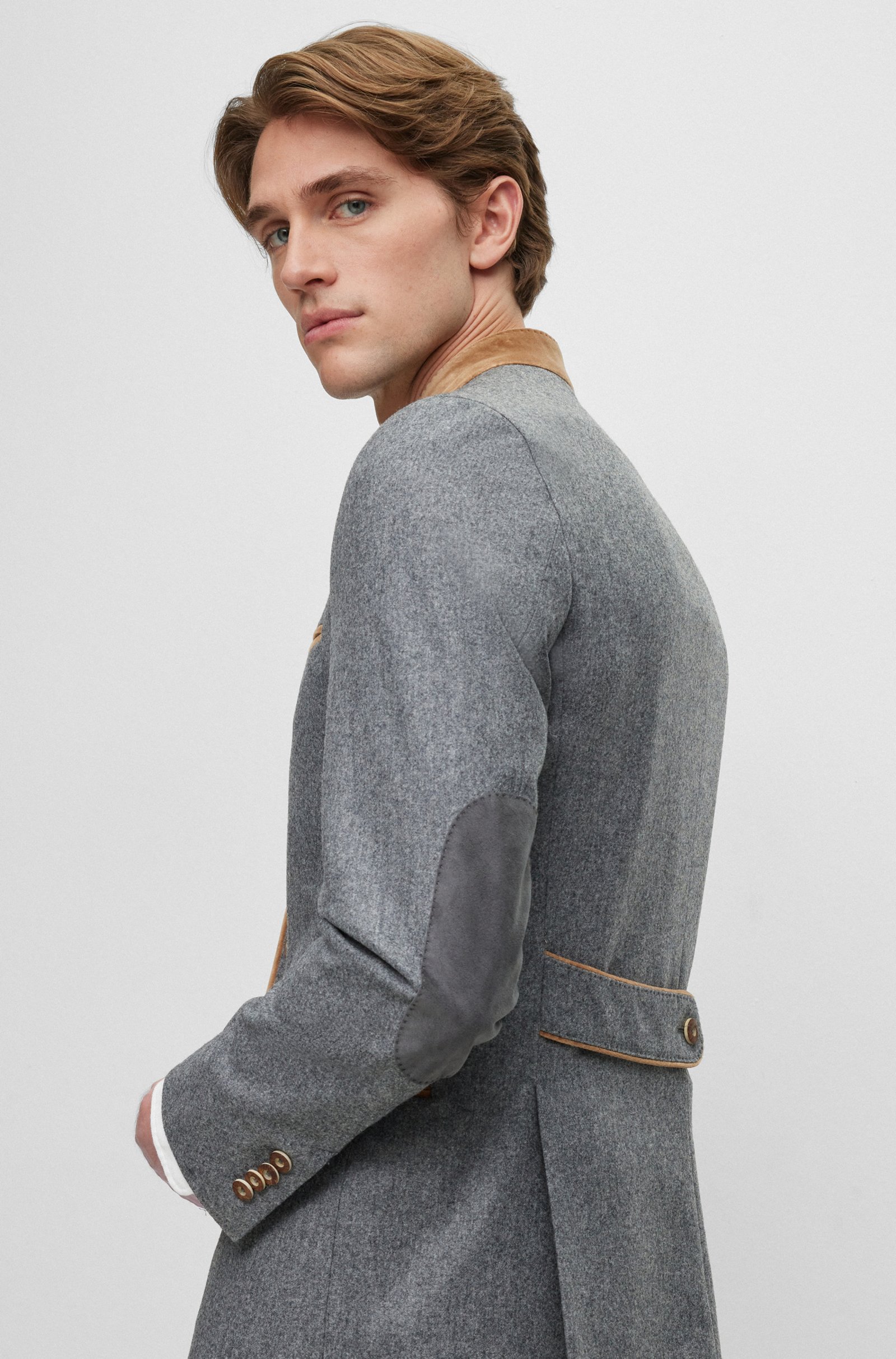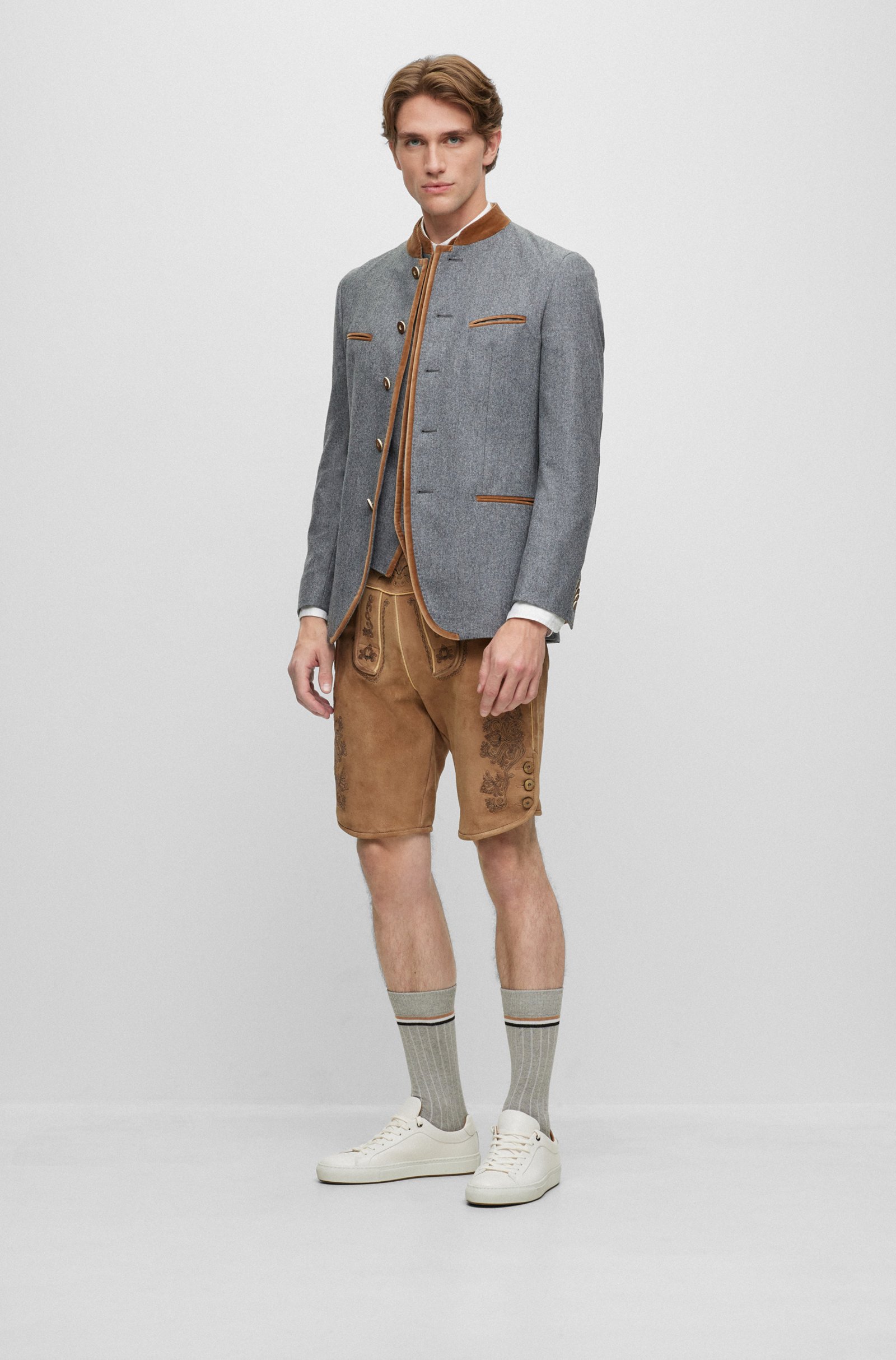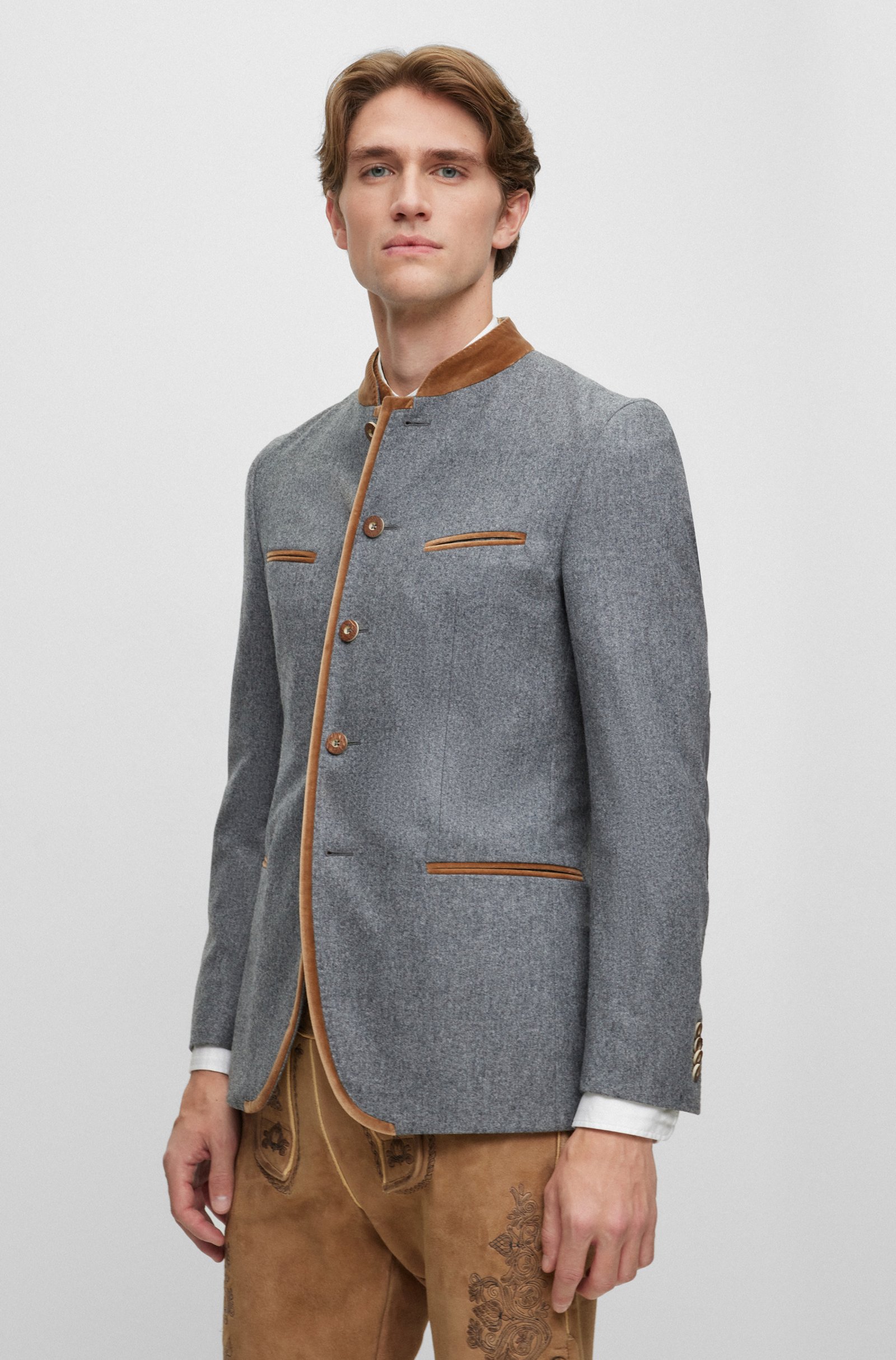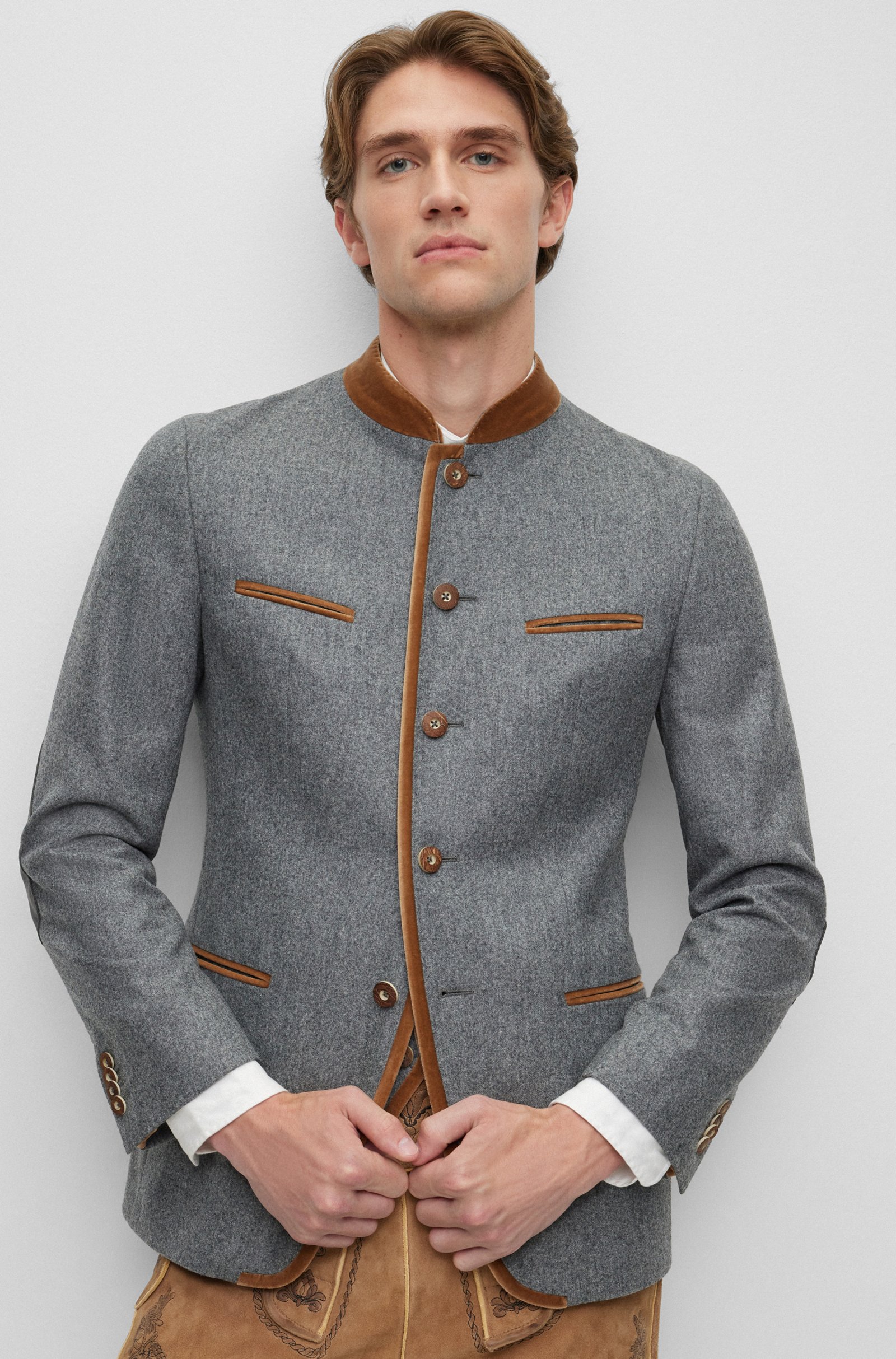 Eine moderne Interpretation der Trachtenjacke von BOSS Menswear, gefertigt aus einer Stretch-Mischung mit Wolle und mit authentischen Verzierungen versehen. Aus einer limitierten Kollektion traditioneller Herrenbekleidung, auch bekannt als Trachten, entworfen von BOSS.