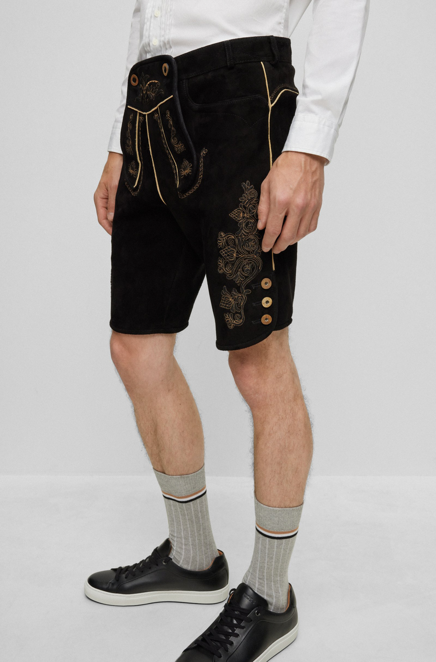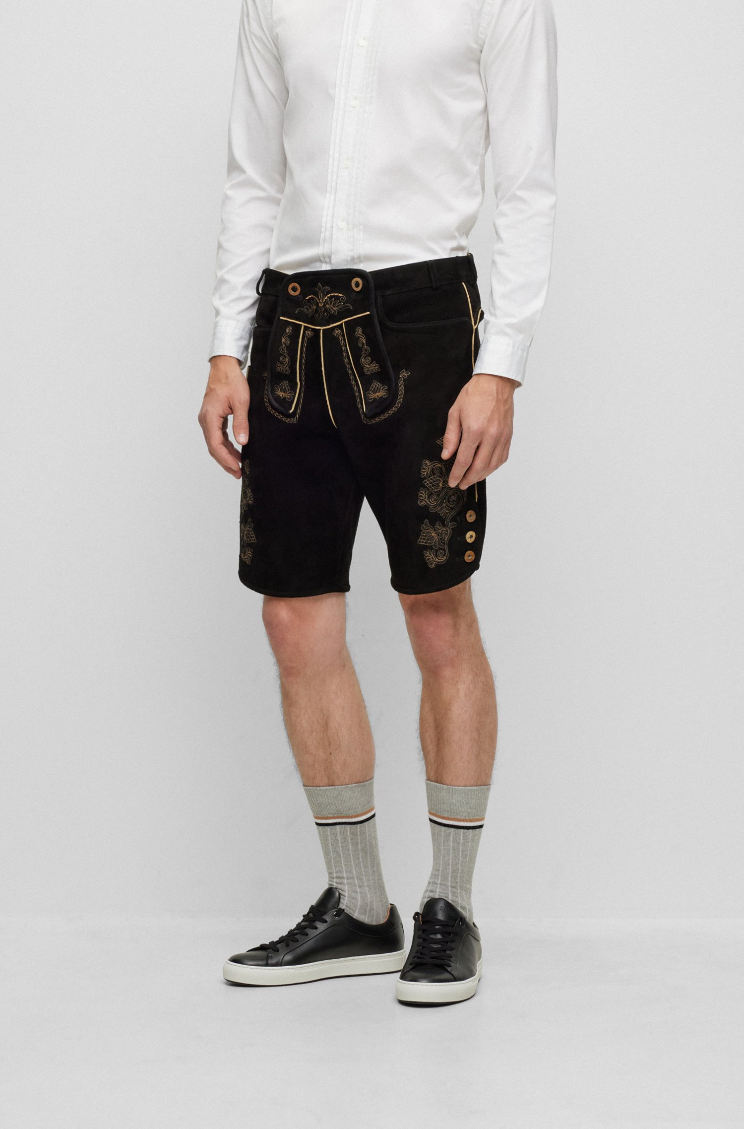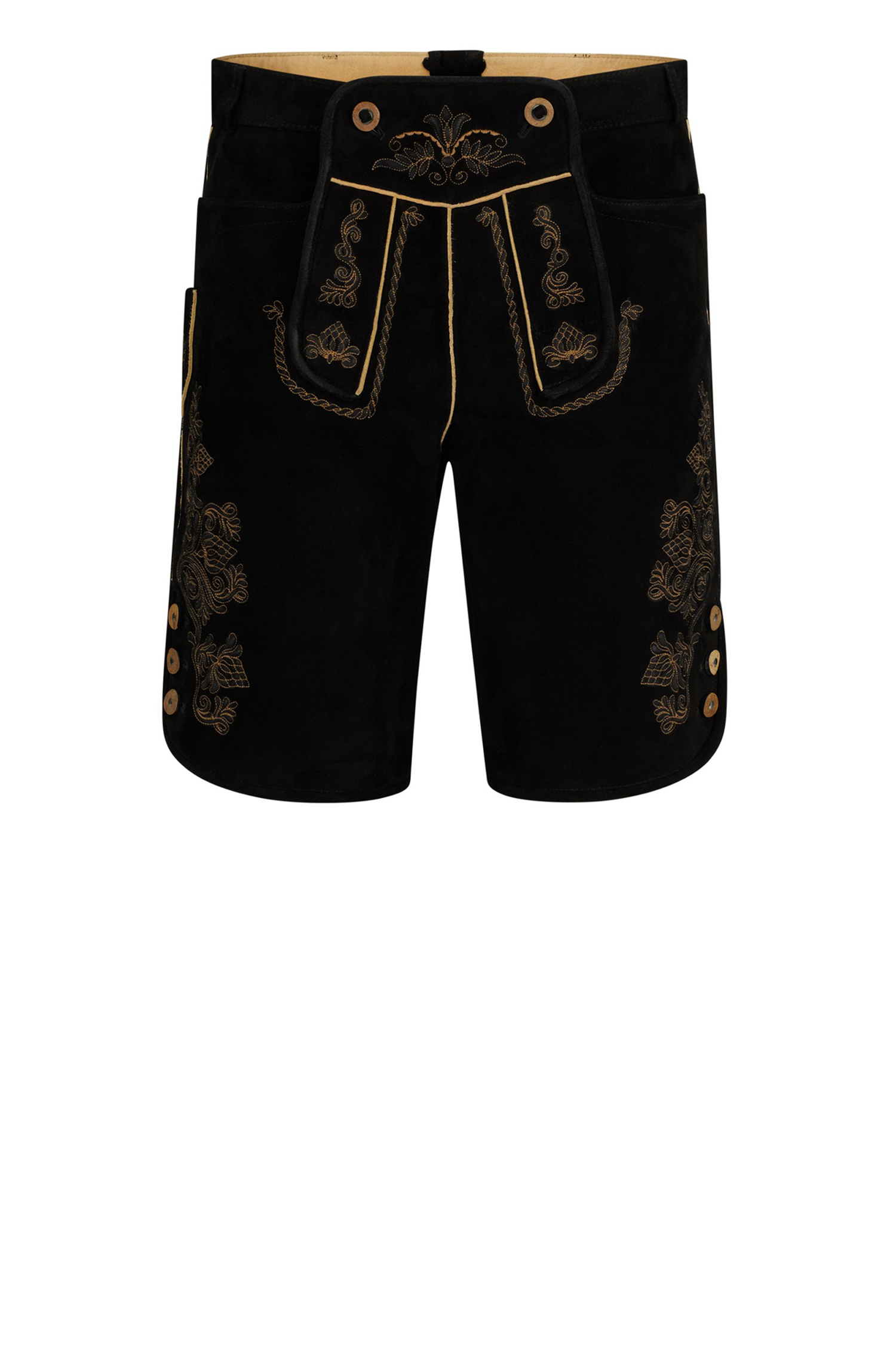 Authentische BOSS Herren-Lederhose mit traditionellen Verzierungen, Vorderlatz und Knopf-Details. Aus einer limitierten BOSS Kollektion mit traditionellen Trachten-Styles für Herren.
