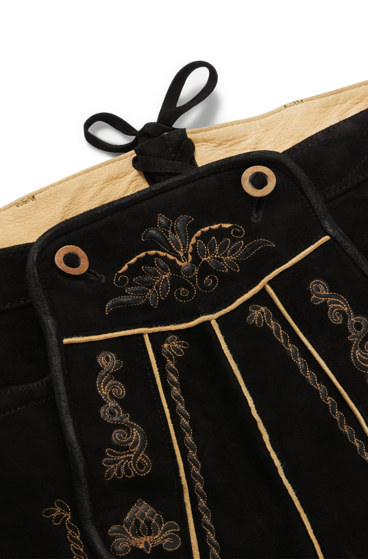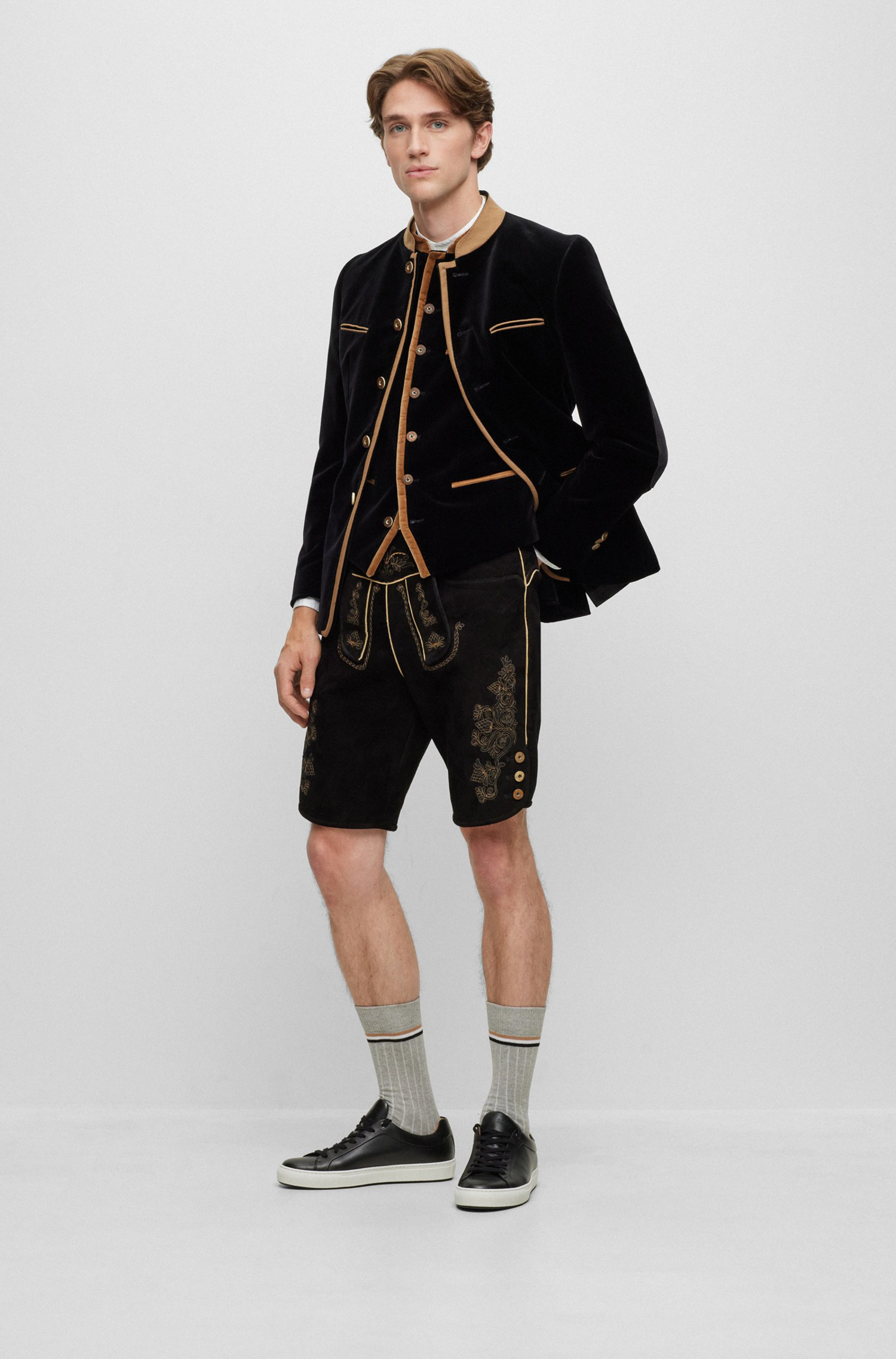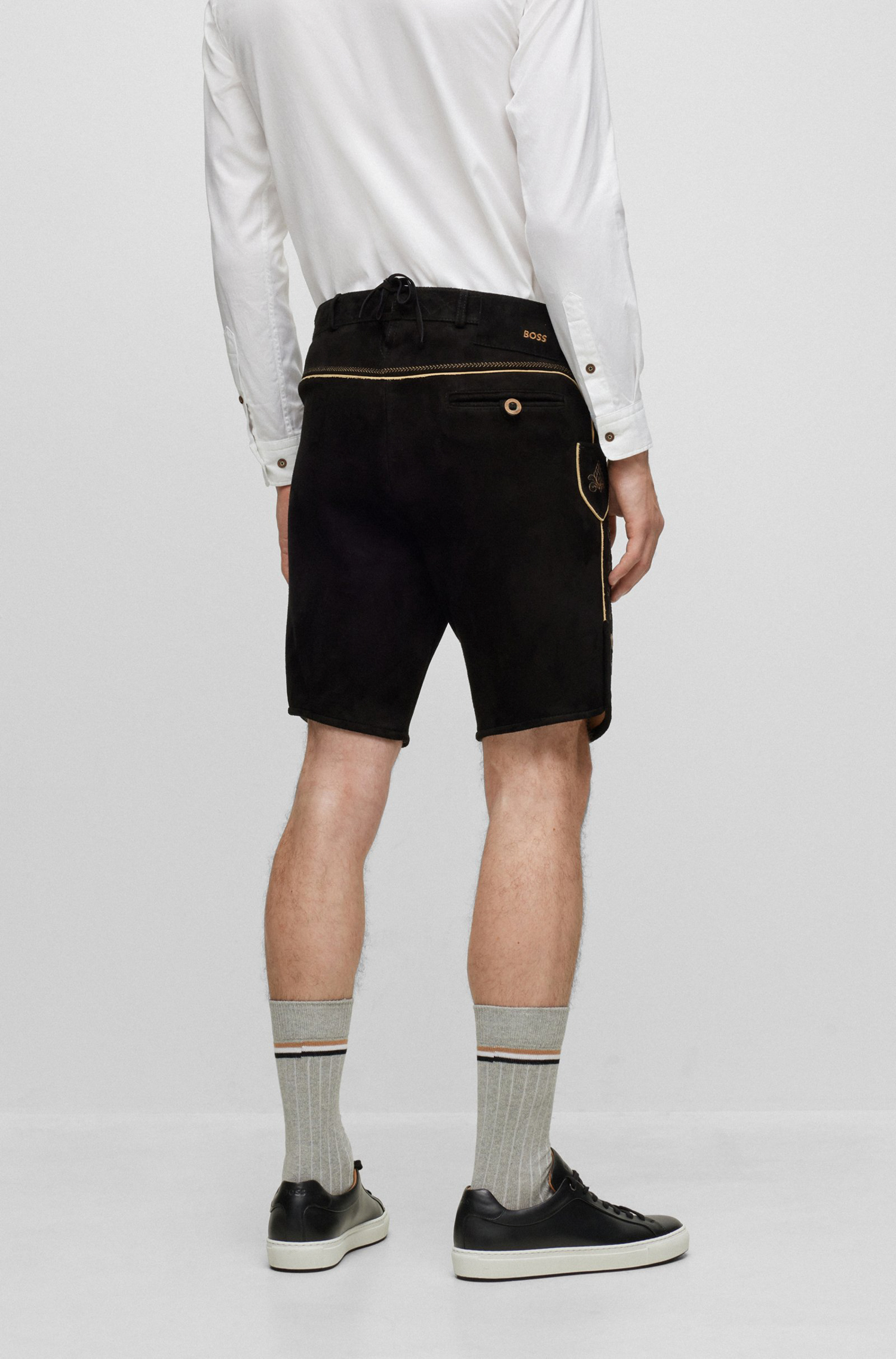 Authentische BOSS Herren-Lederhose mit traditionellen Verzierungen, Vorderlatz und Knopf-Details. Aus einer limitierten BOSS Kollektion mit traditionellen Trachten-Styles für Herren.