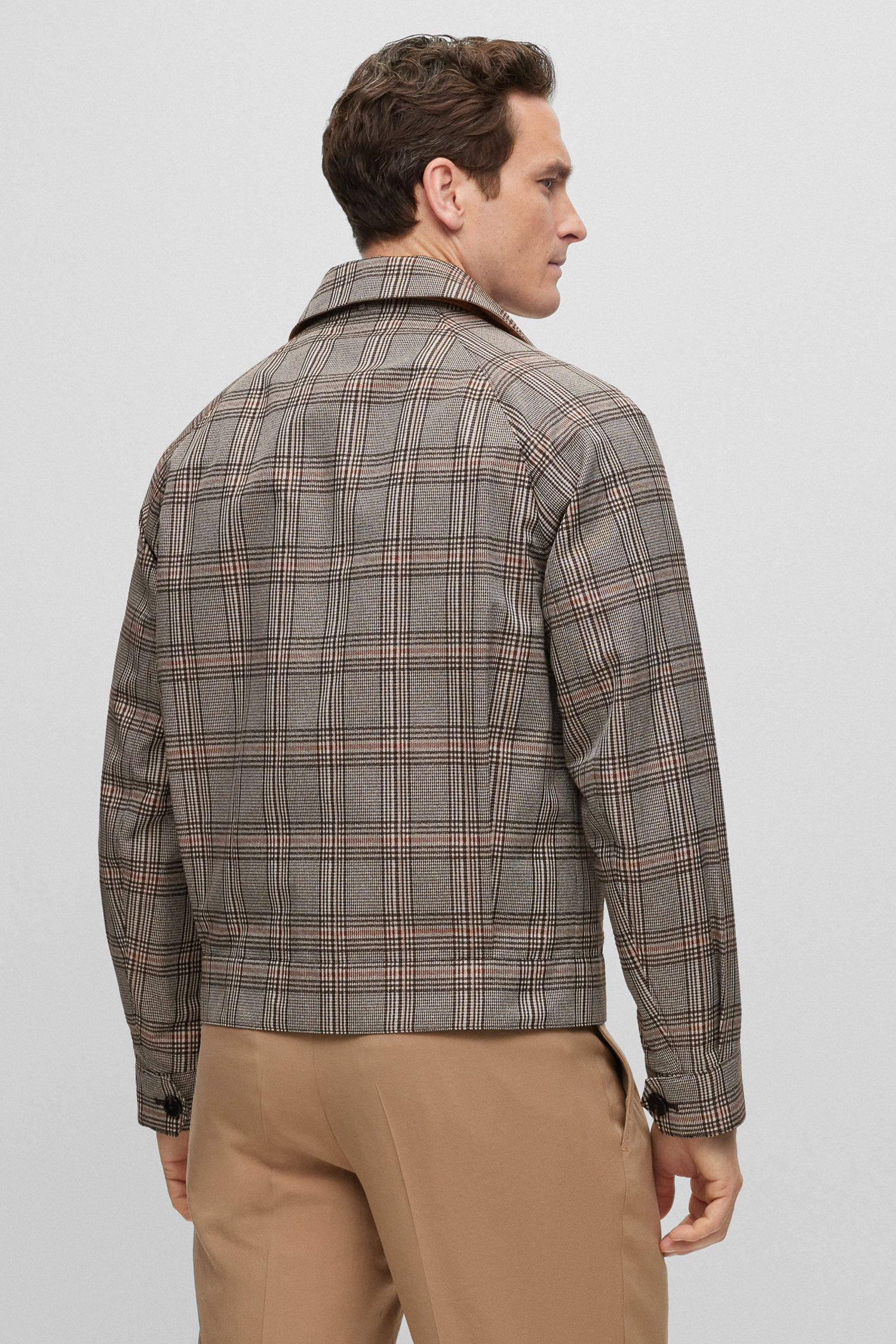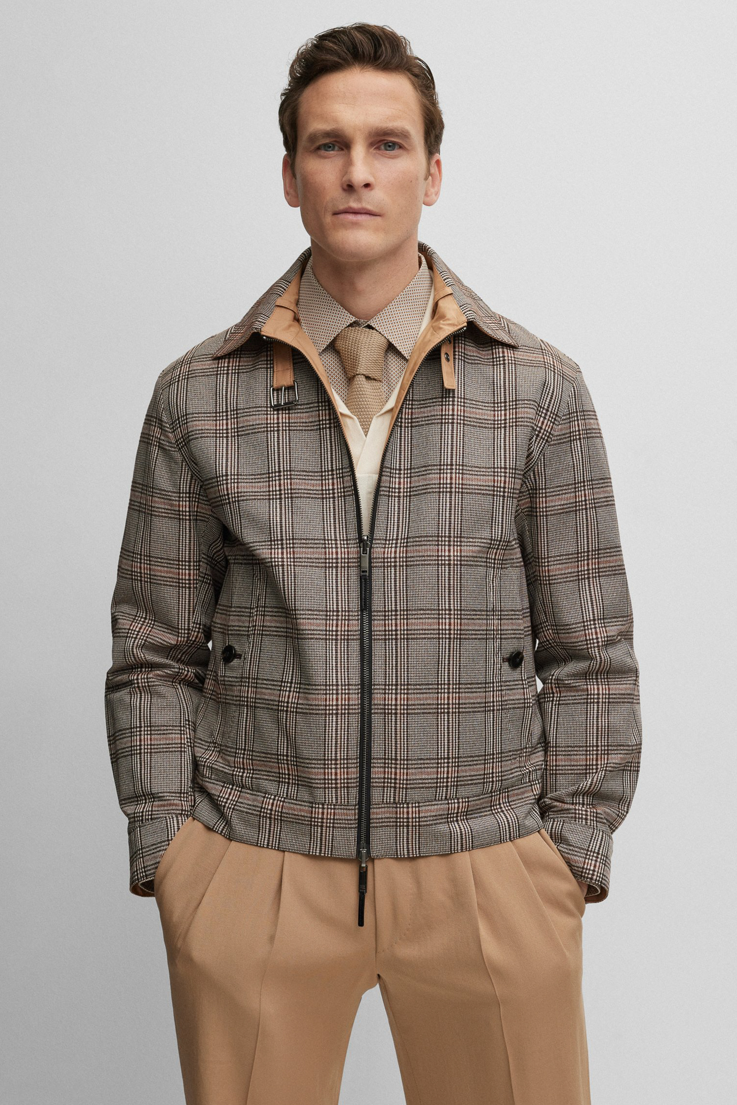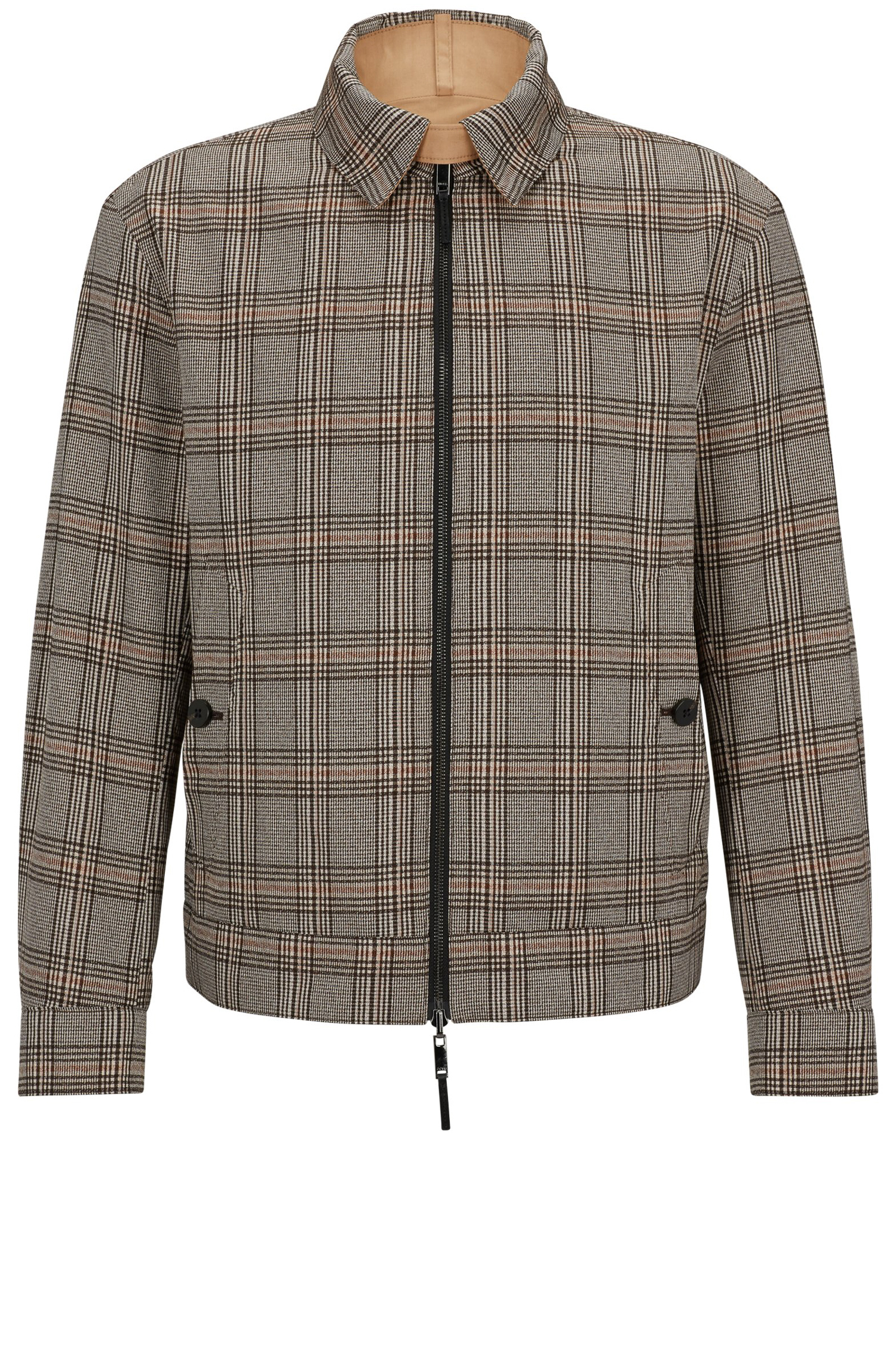 Gerade geschnittene BOSS Wendejacke aus einem wasserabweisenden Gewebe mit einer unifarbenen und einer karierten Seite.