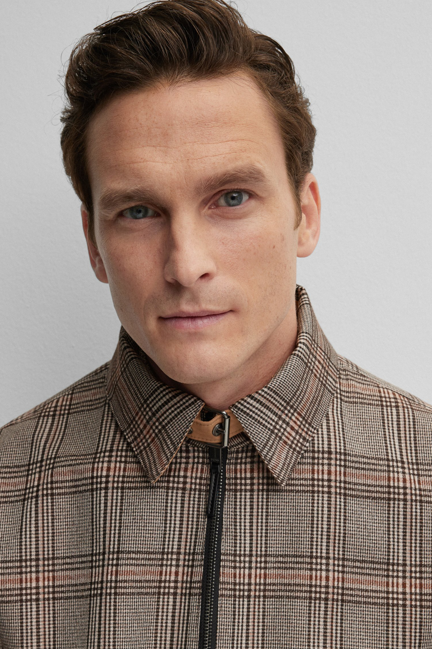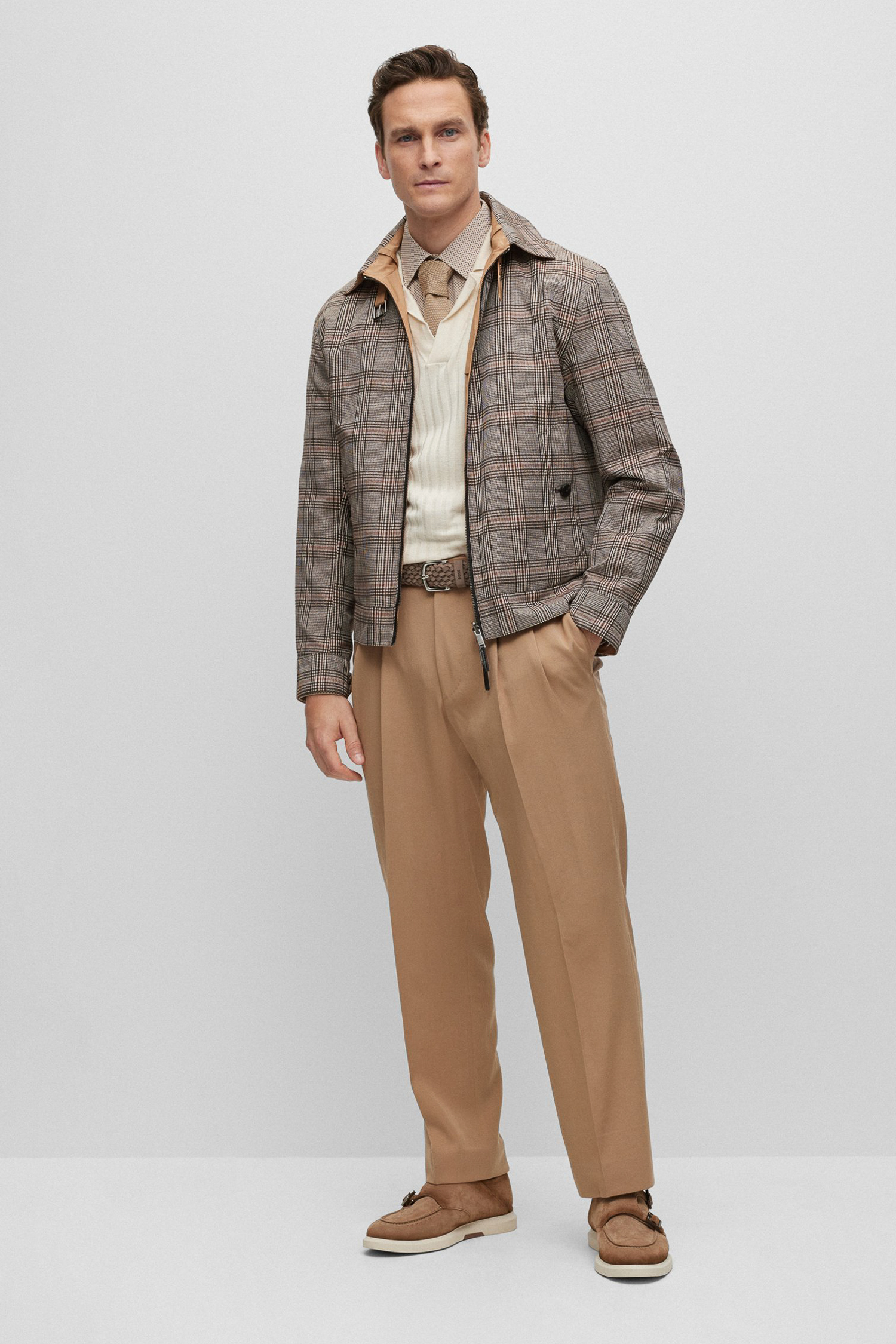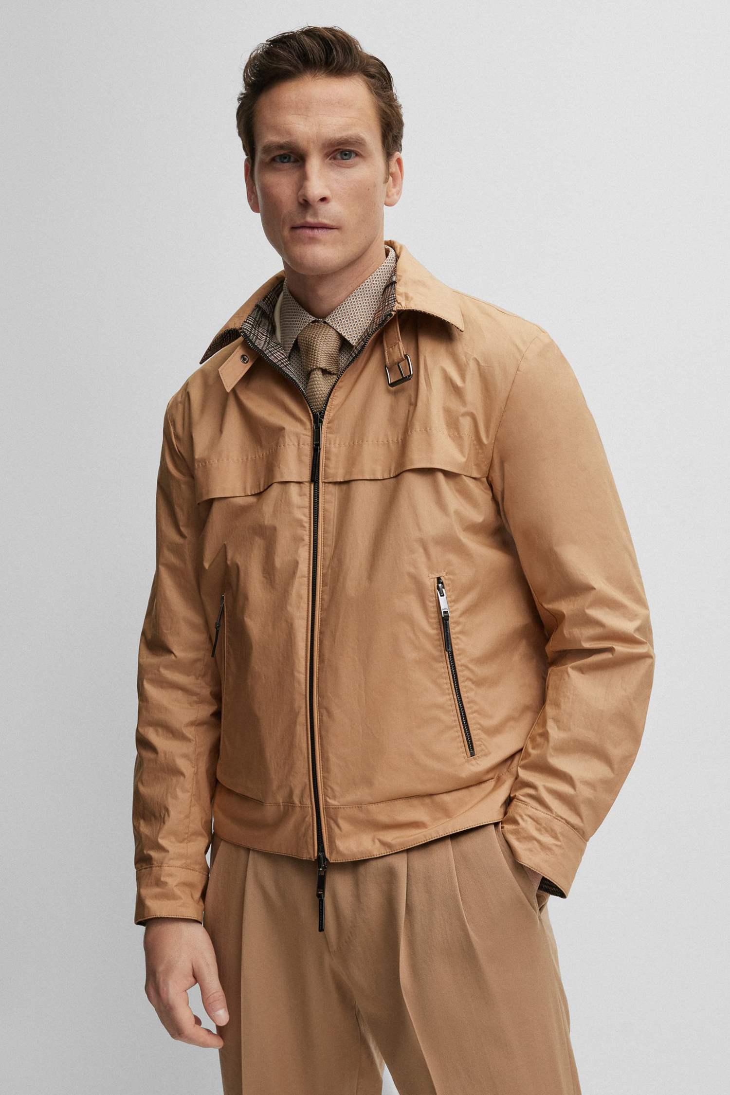 Gerade geschnittene BOSS Wendejacke aus einem wasserabweisenden Gewebe mit einer unifarbenen und einer karierten Seite.