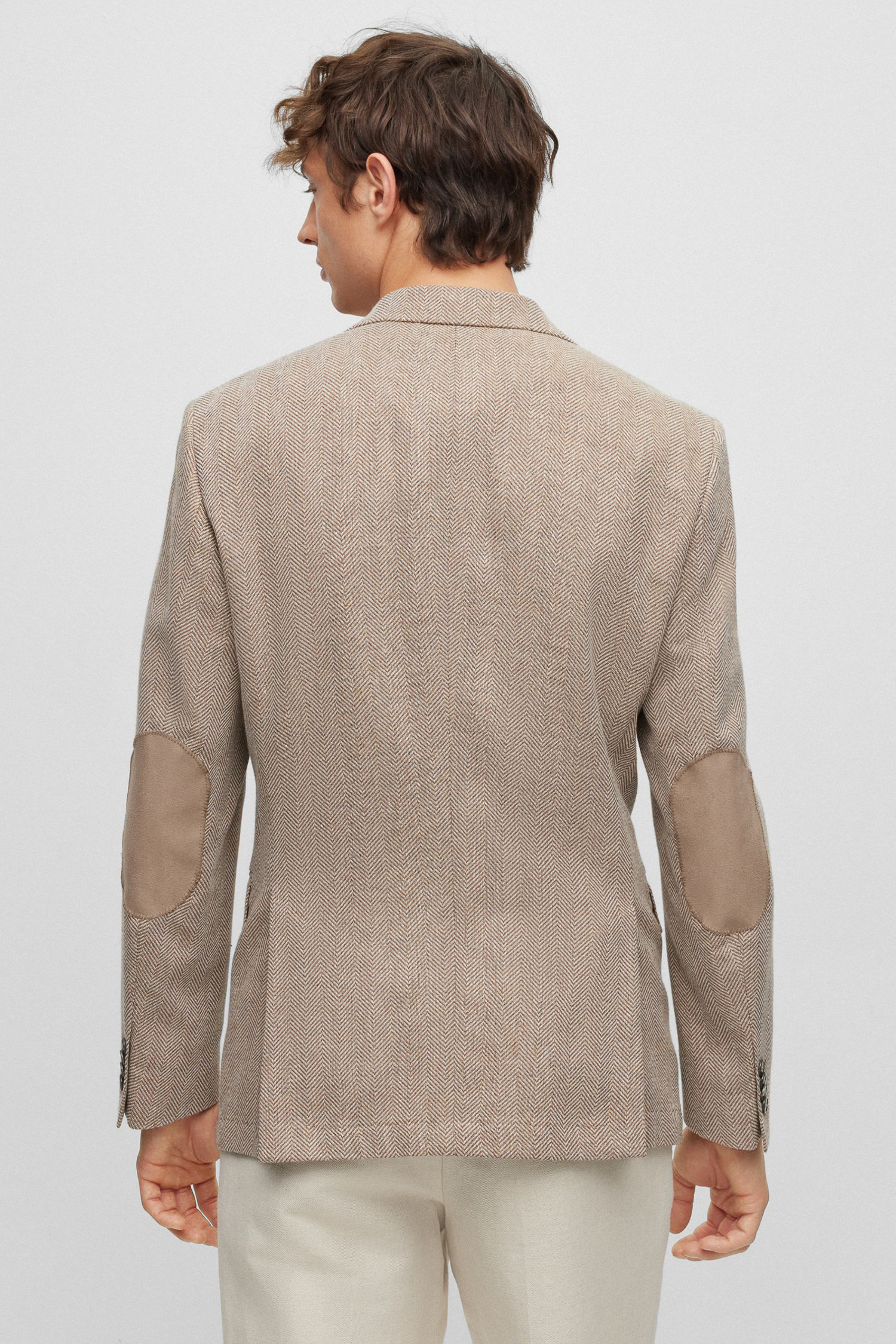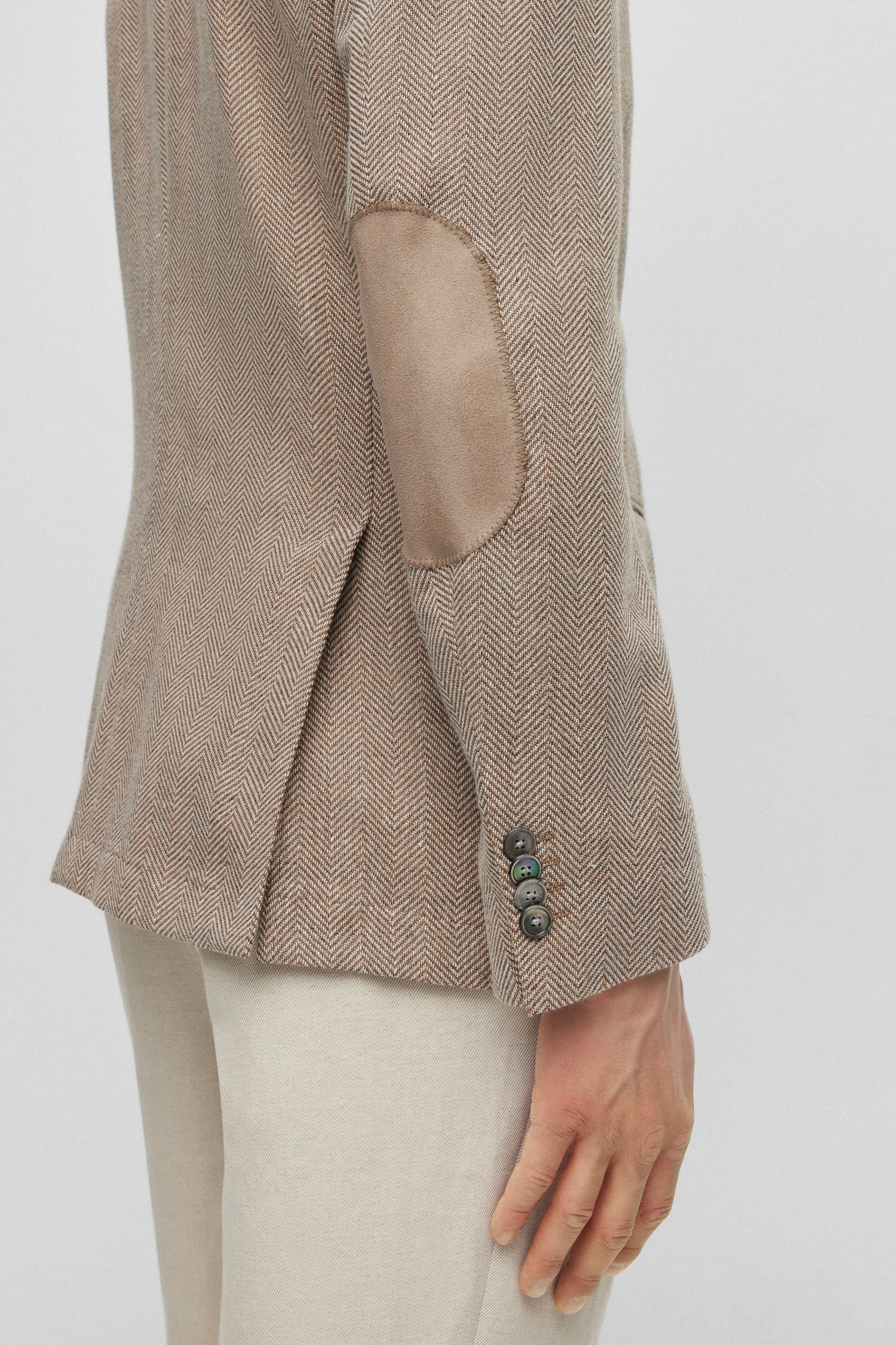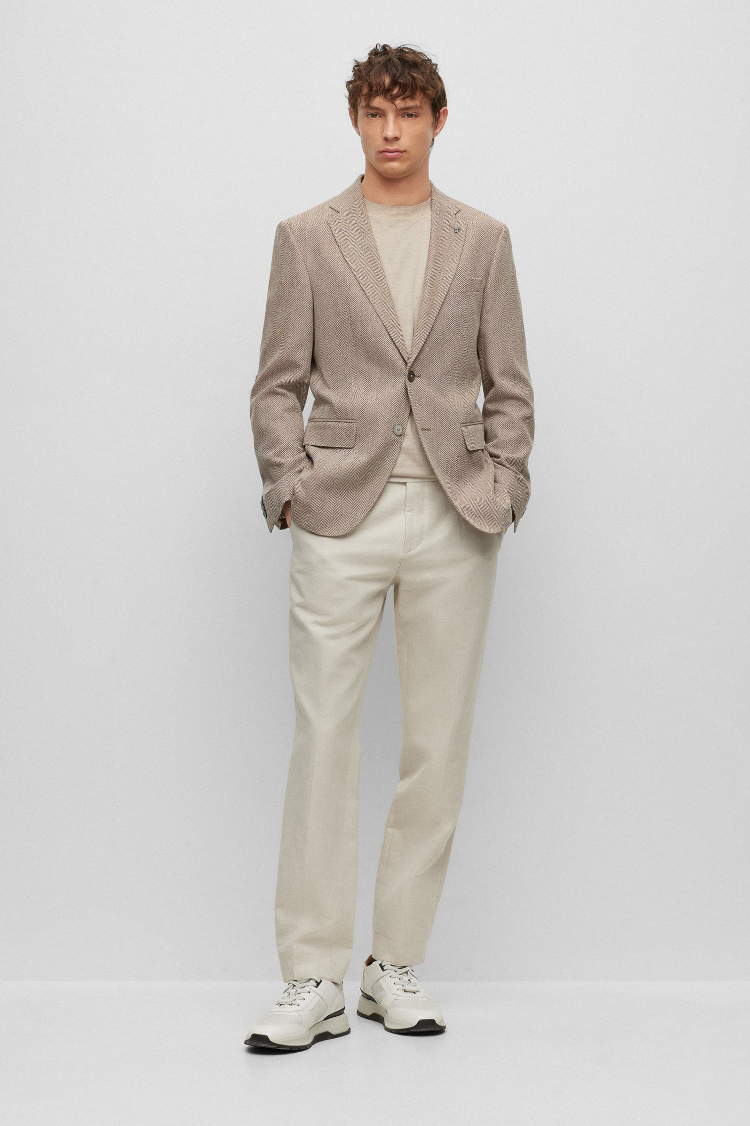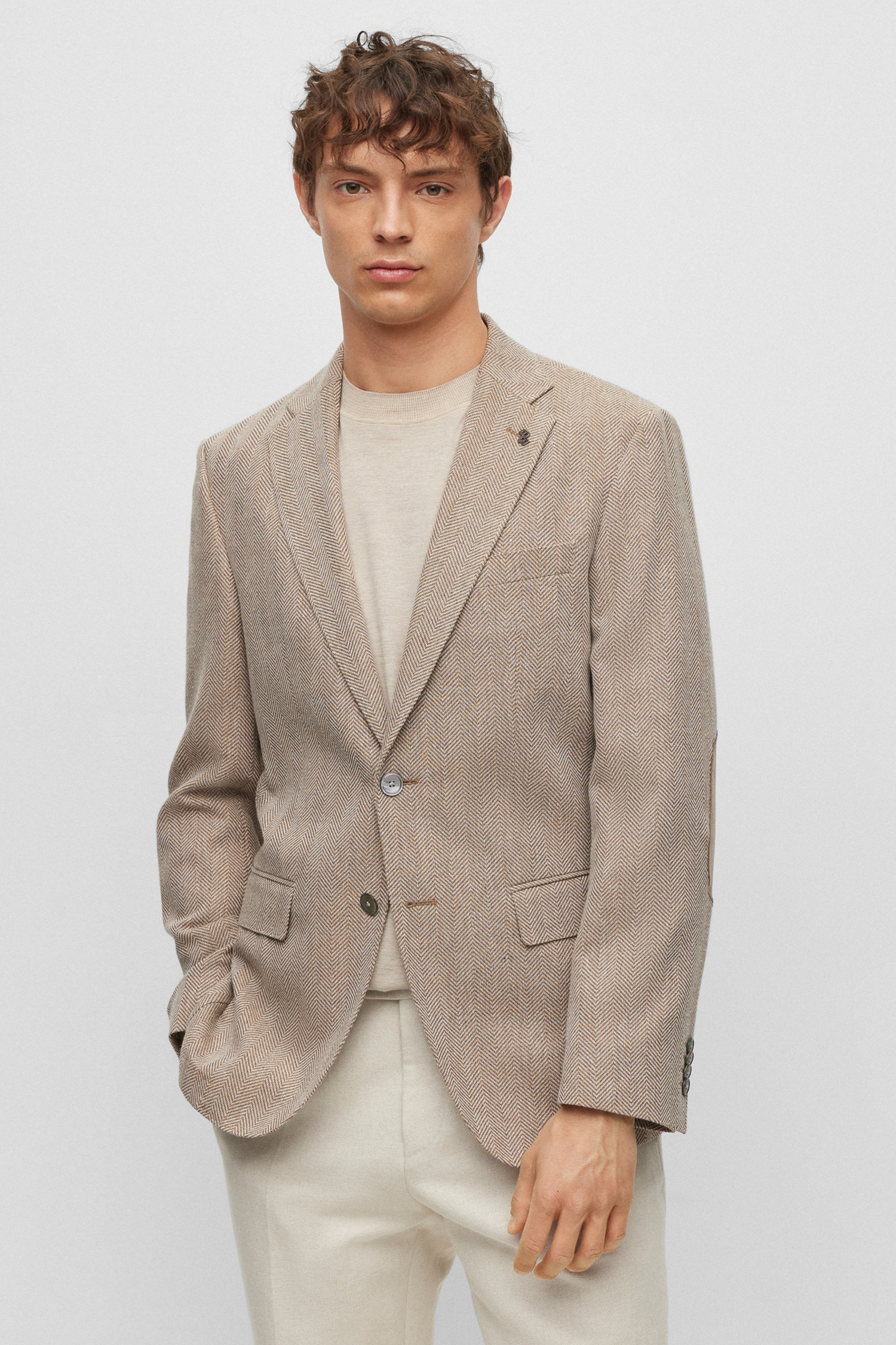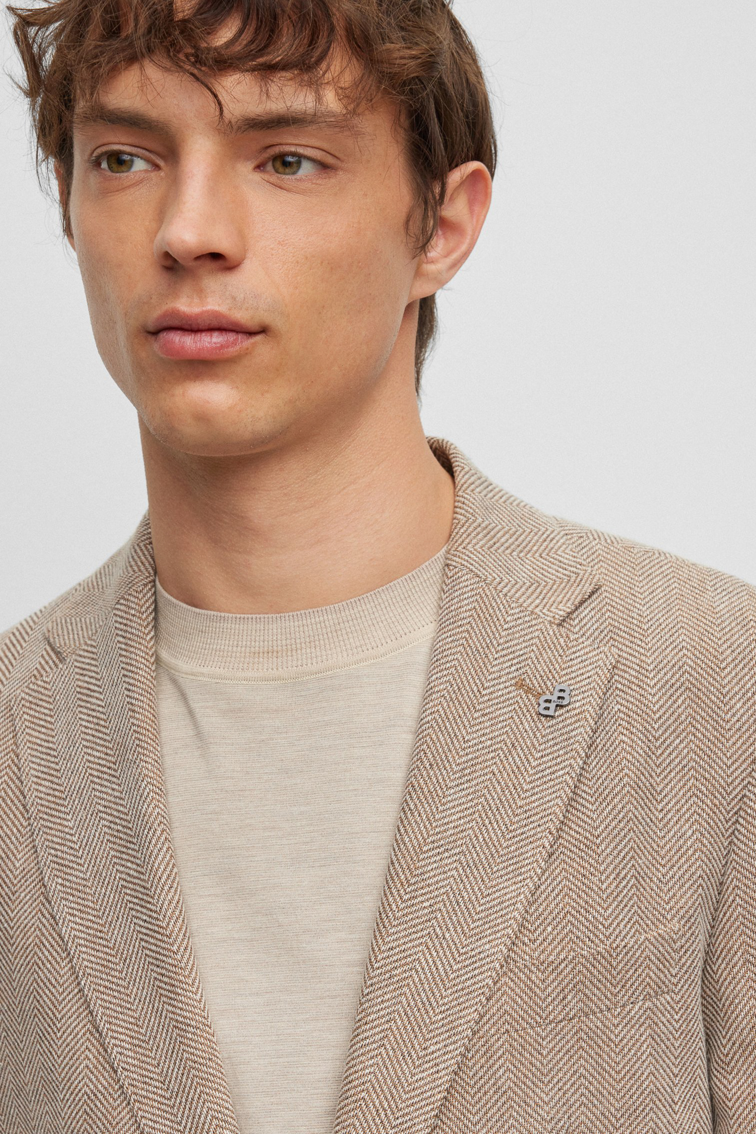 Schmal geschnittenes BOSS Sakko aus einem Baumwoll-Mix mit Schurwoll-Anteil. Ein Fischgrätmuster und eine Monogramm-Anstecknadel zeichnen das Jackett aus.